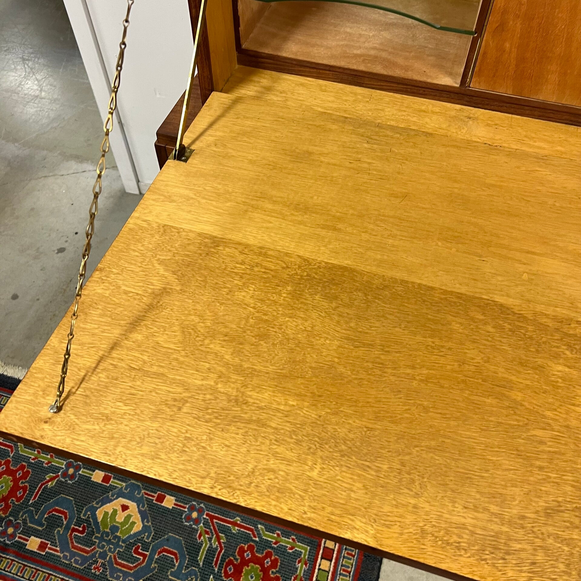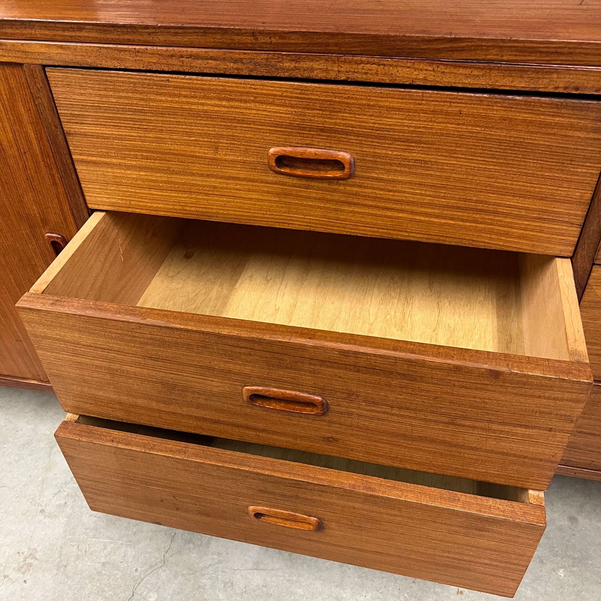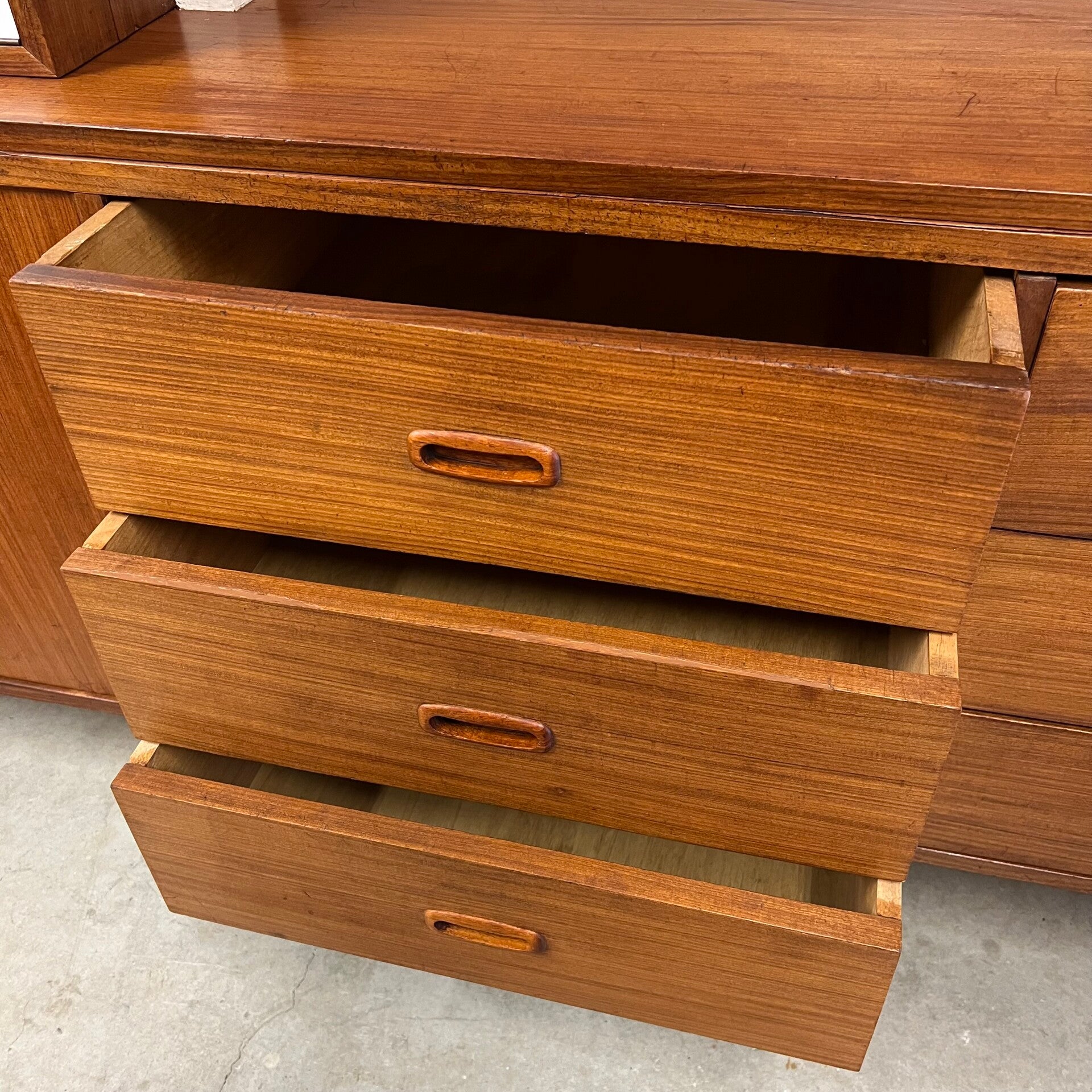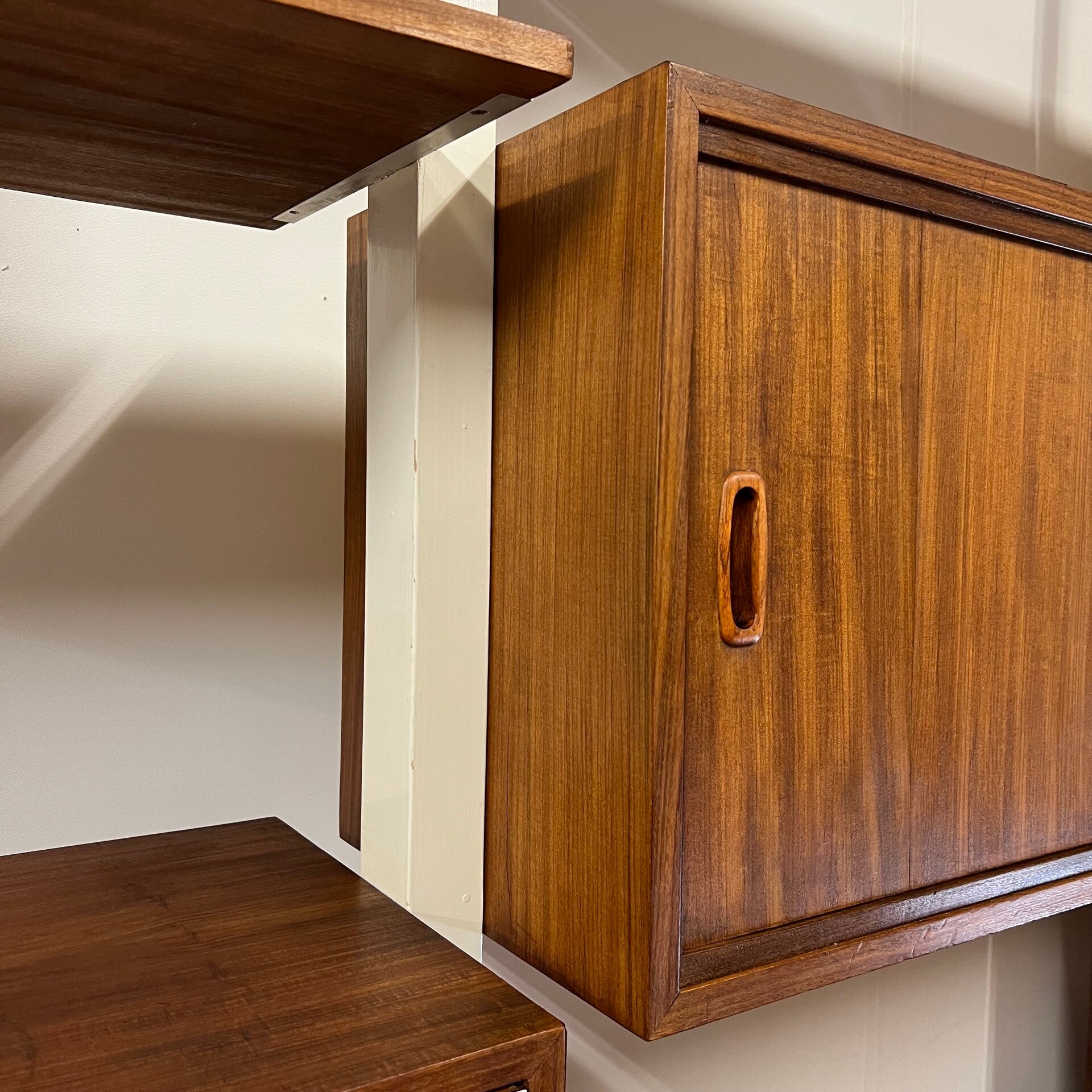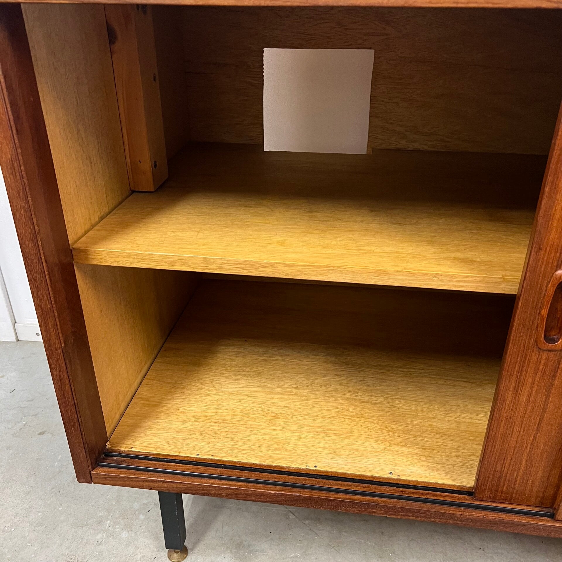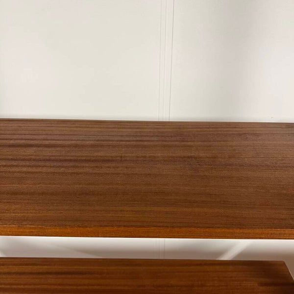 Geweldig imposant XL wandmeubel, uitgevoerd in teak fineer met zwart metalen pootjes, stelvoetjes en wit gelakte staanders.