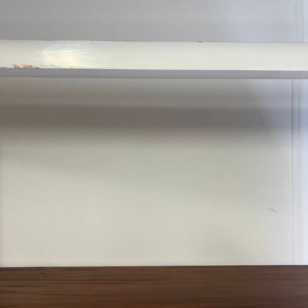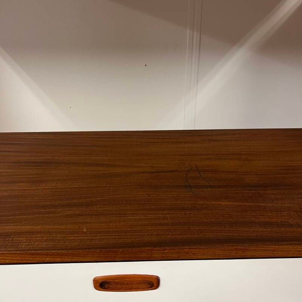 De witte verf bladdert hier en daar los, het fineer heeft slijtage en zit er niet overal meer strak tegenaan.