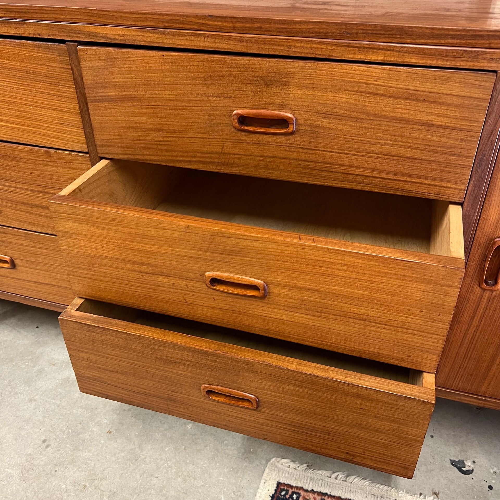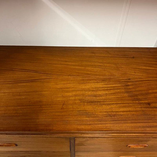 Wij hebben het meubel grondig gereinigd en opnieuw in de olie gezet, maar verder in authentieke staat gelaten.