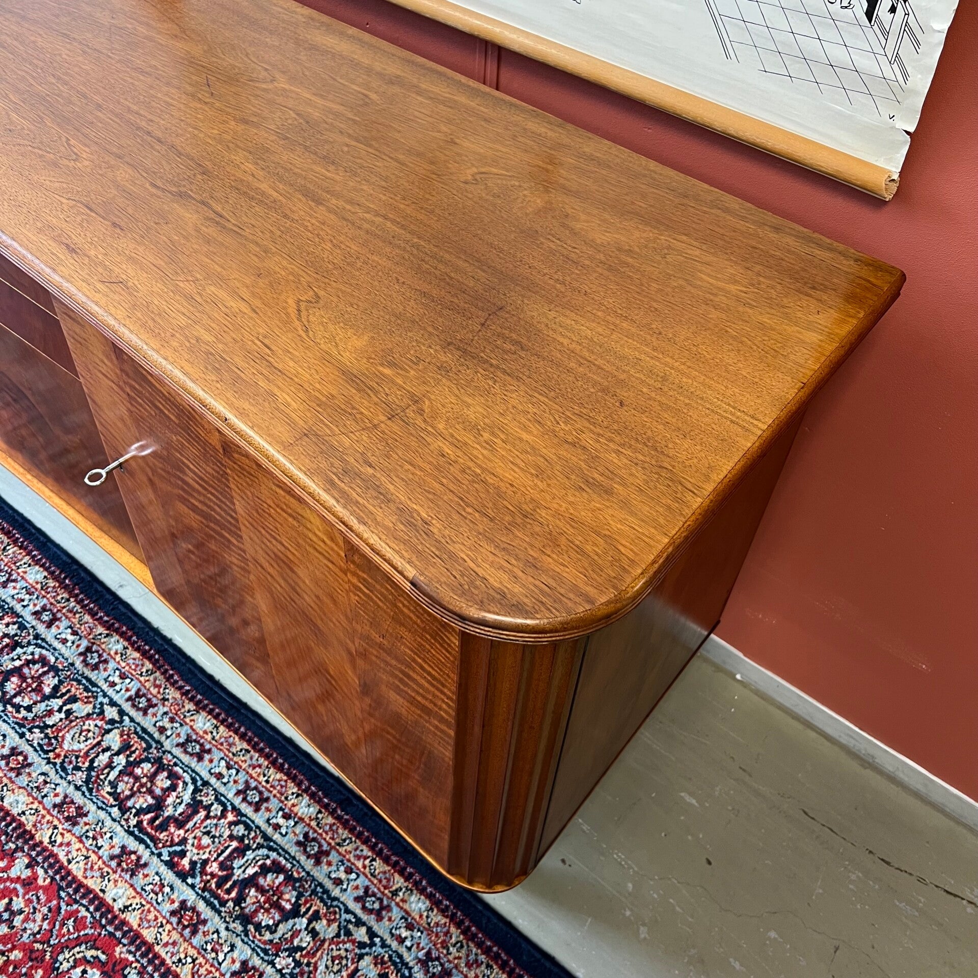 Het meubel heeft aan weerszijden een openslaande deur met slot (sleutels aanwezig) en erachter een uitneembare plank.