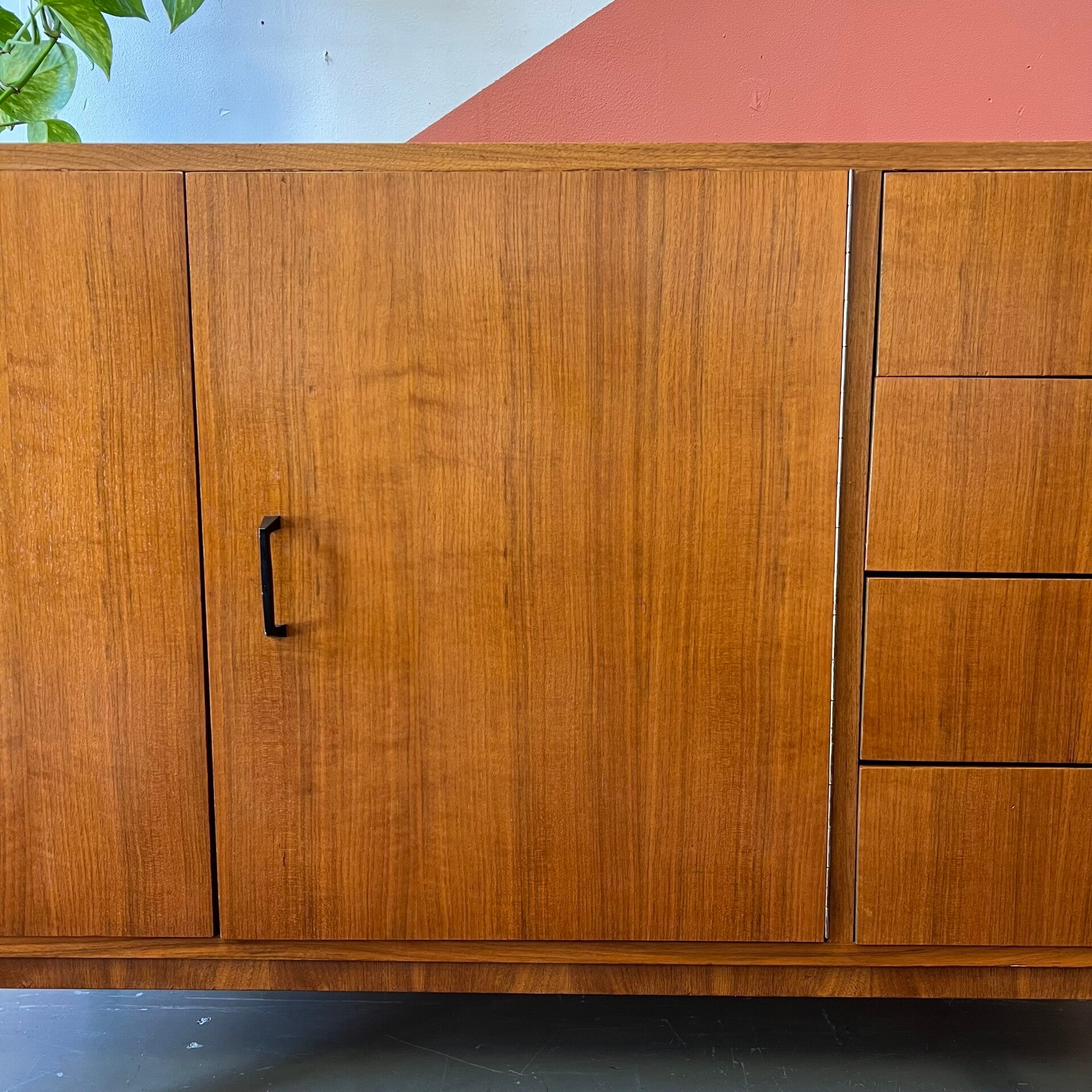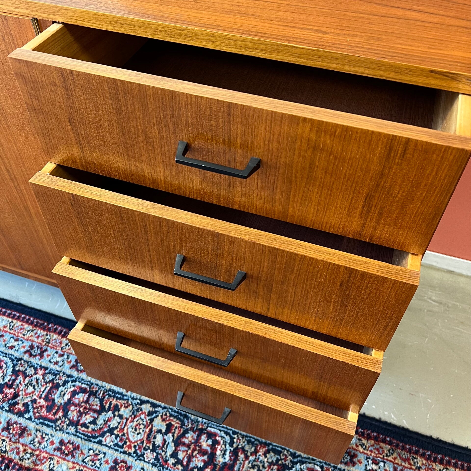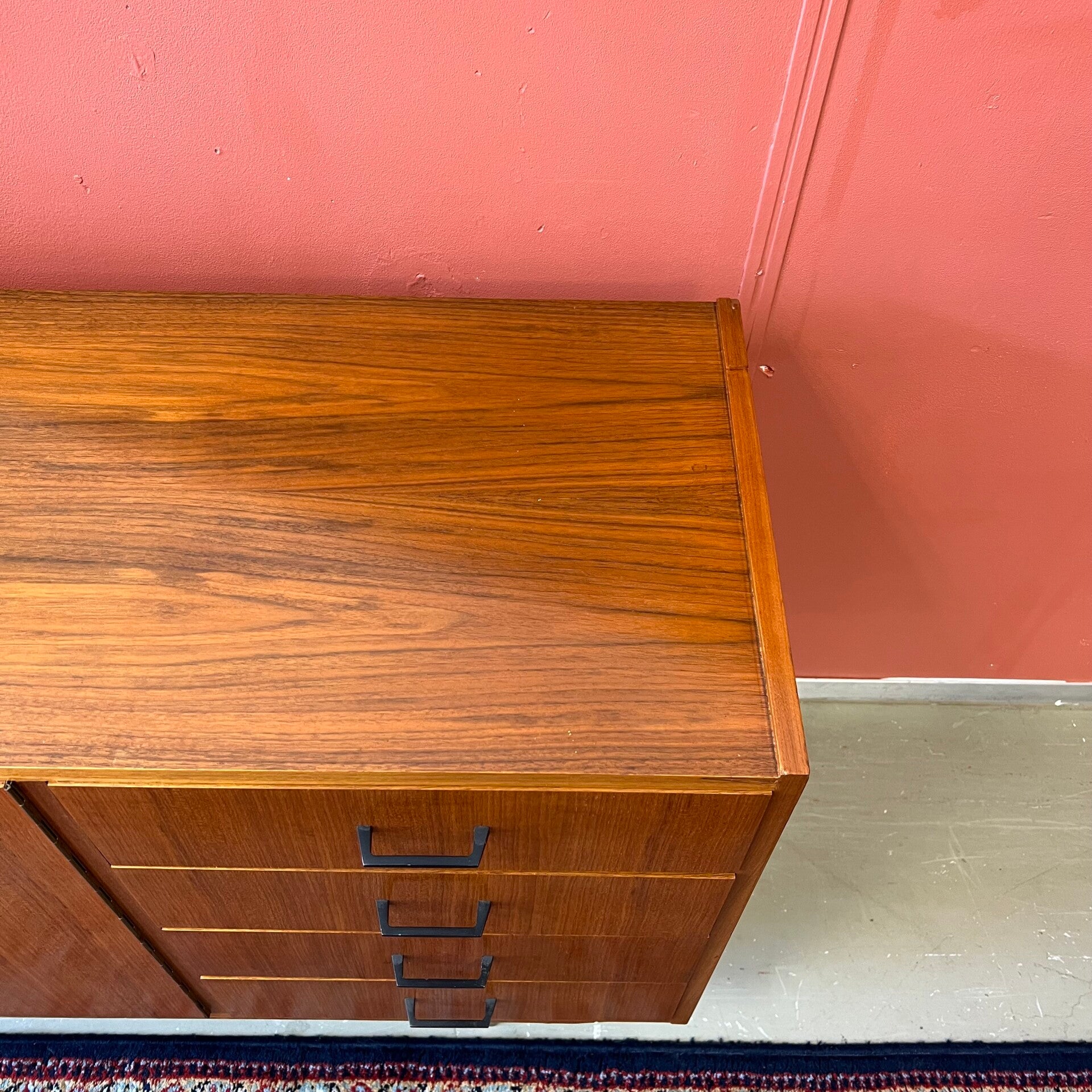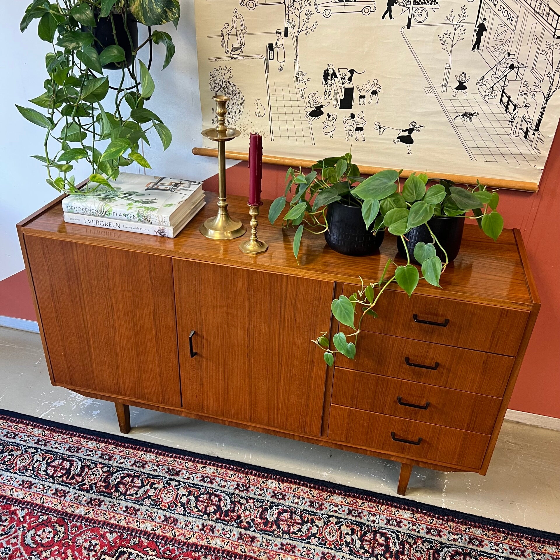 Leuk vintage compact dressoir, uitgevoerd in teak (fineer) met zwarte handgrepen en slanke pootjes.