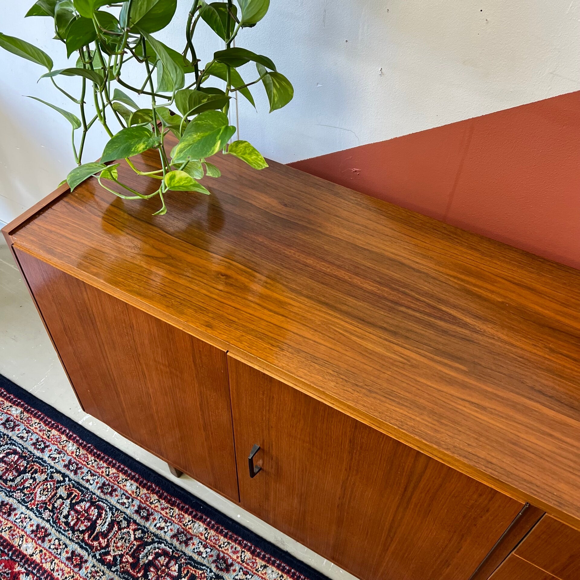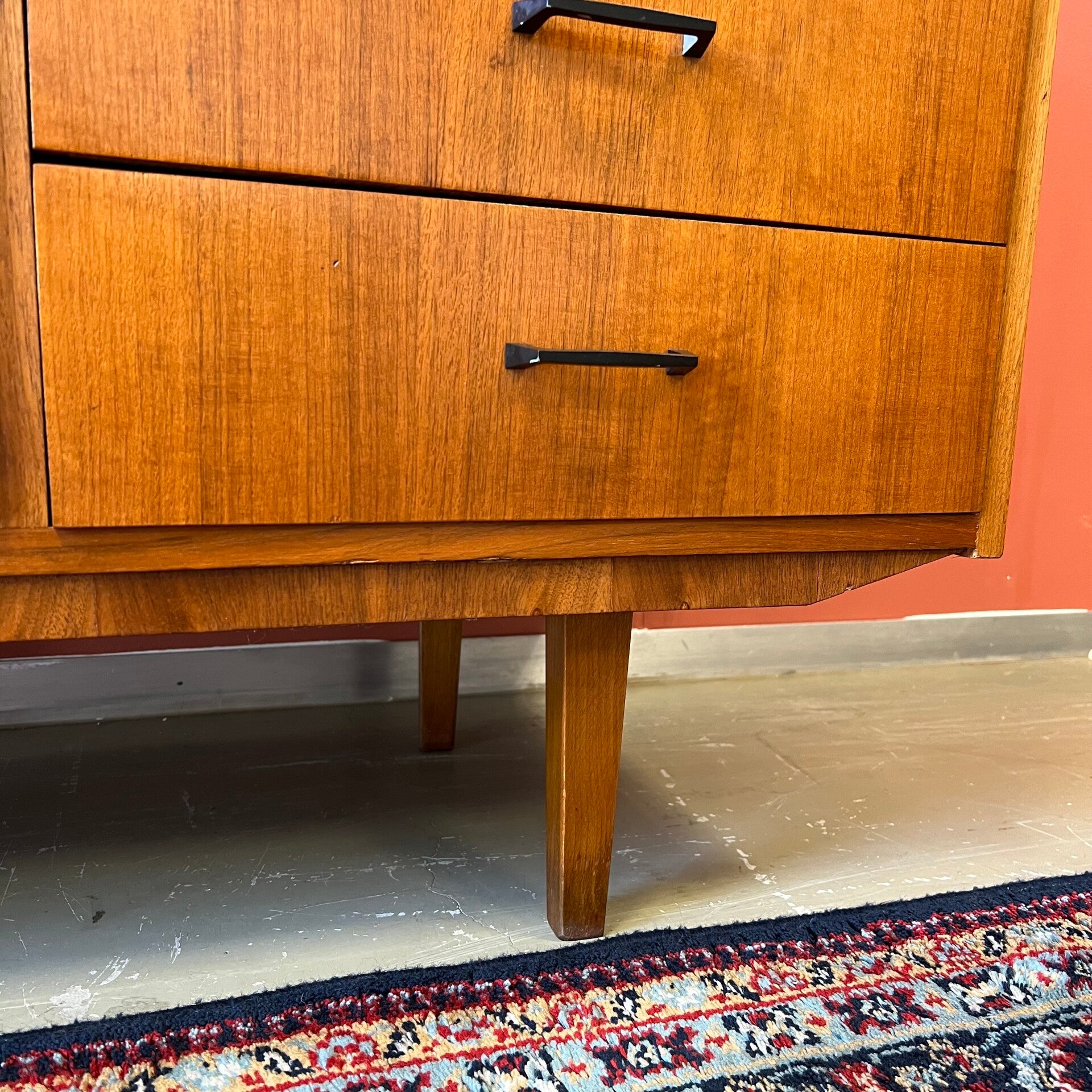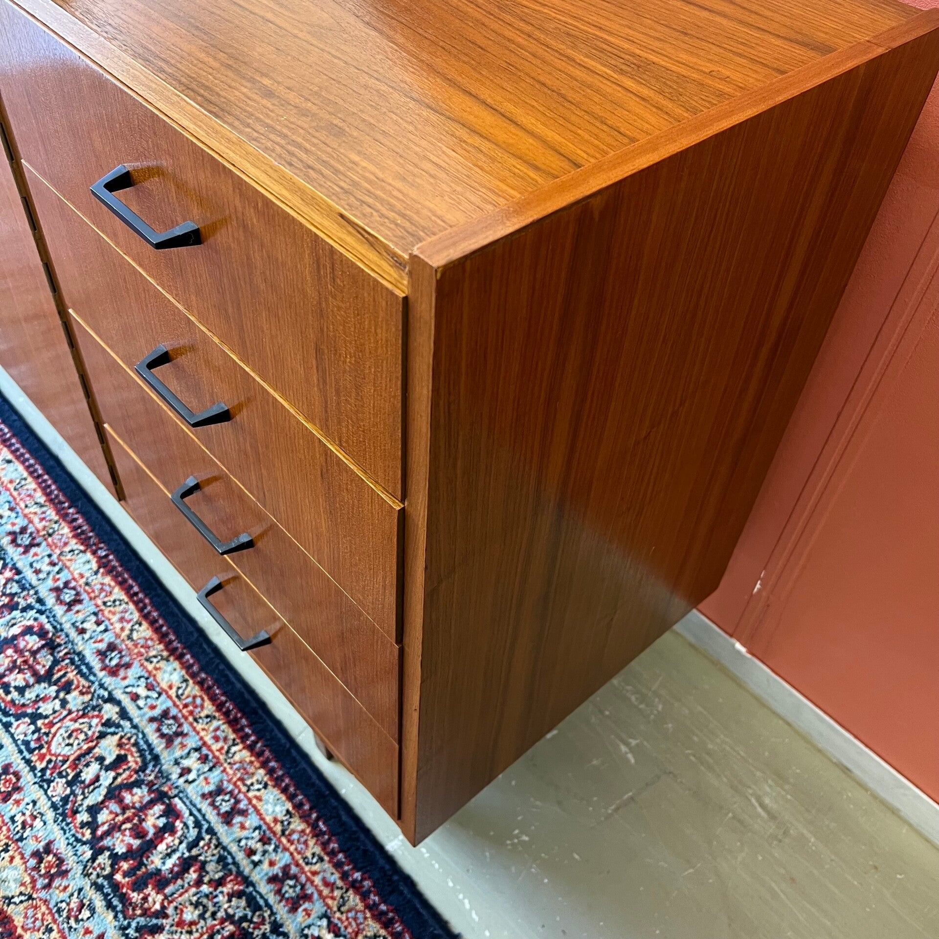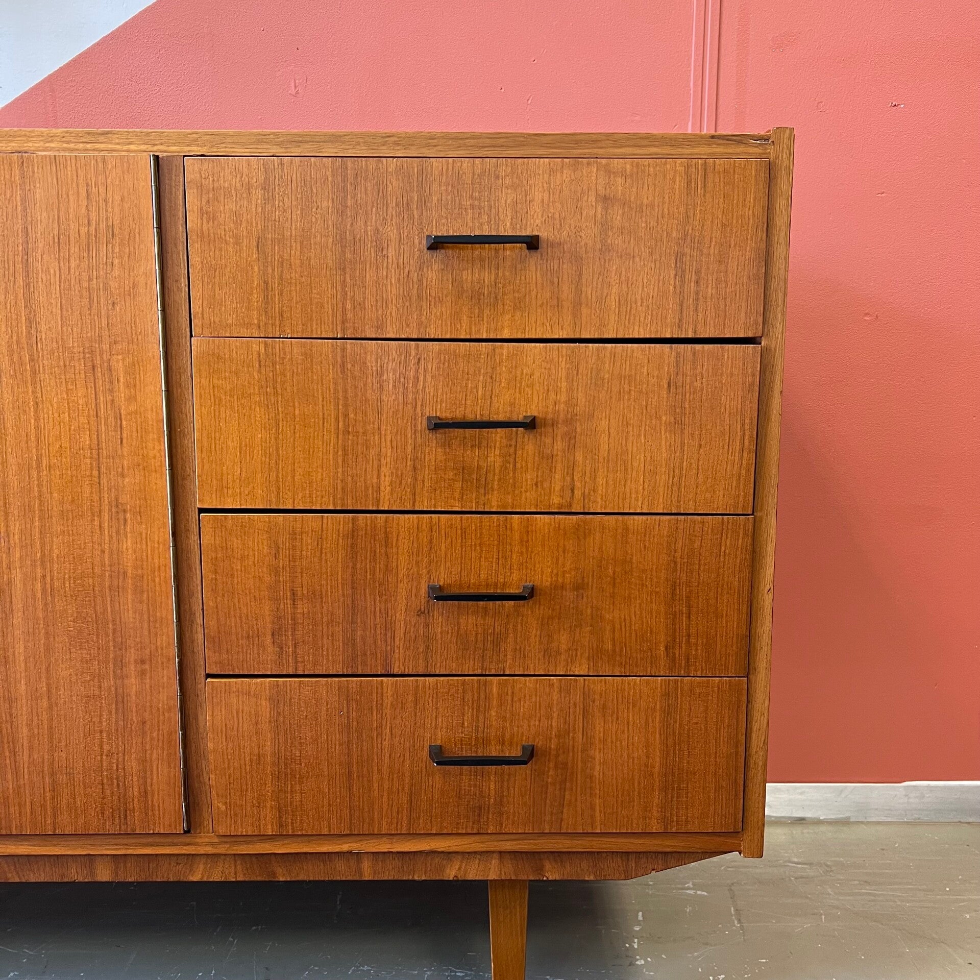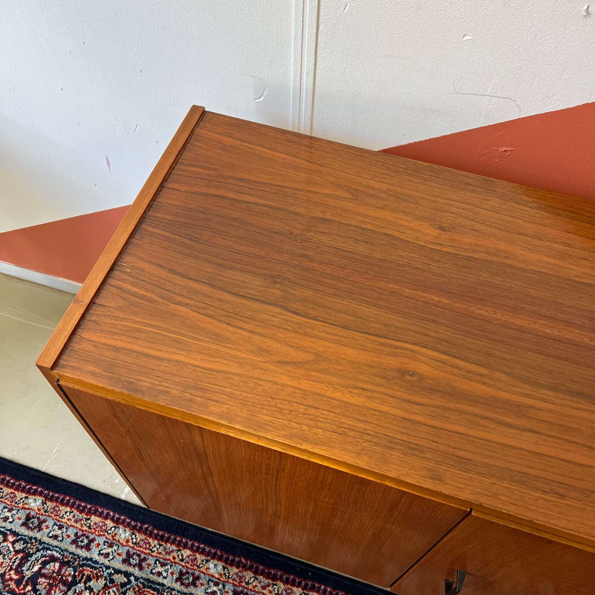 Leuk vintage compact dressoir, uitgevoerd in teak (fineer) met zwarte handgrepen en slanke pootjes.