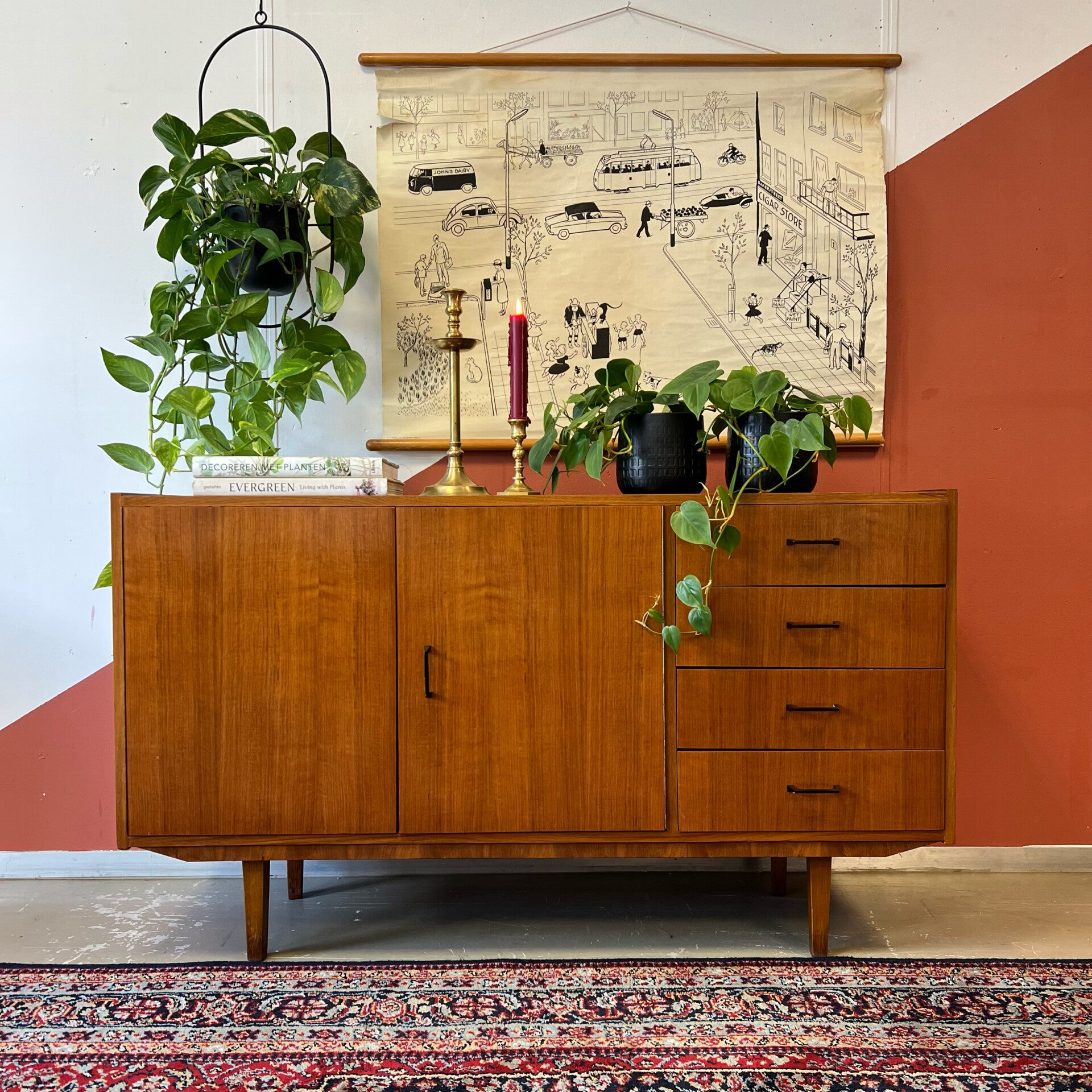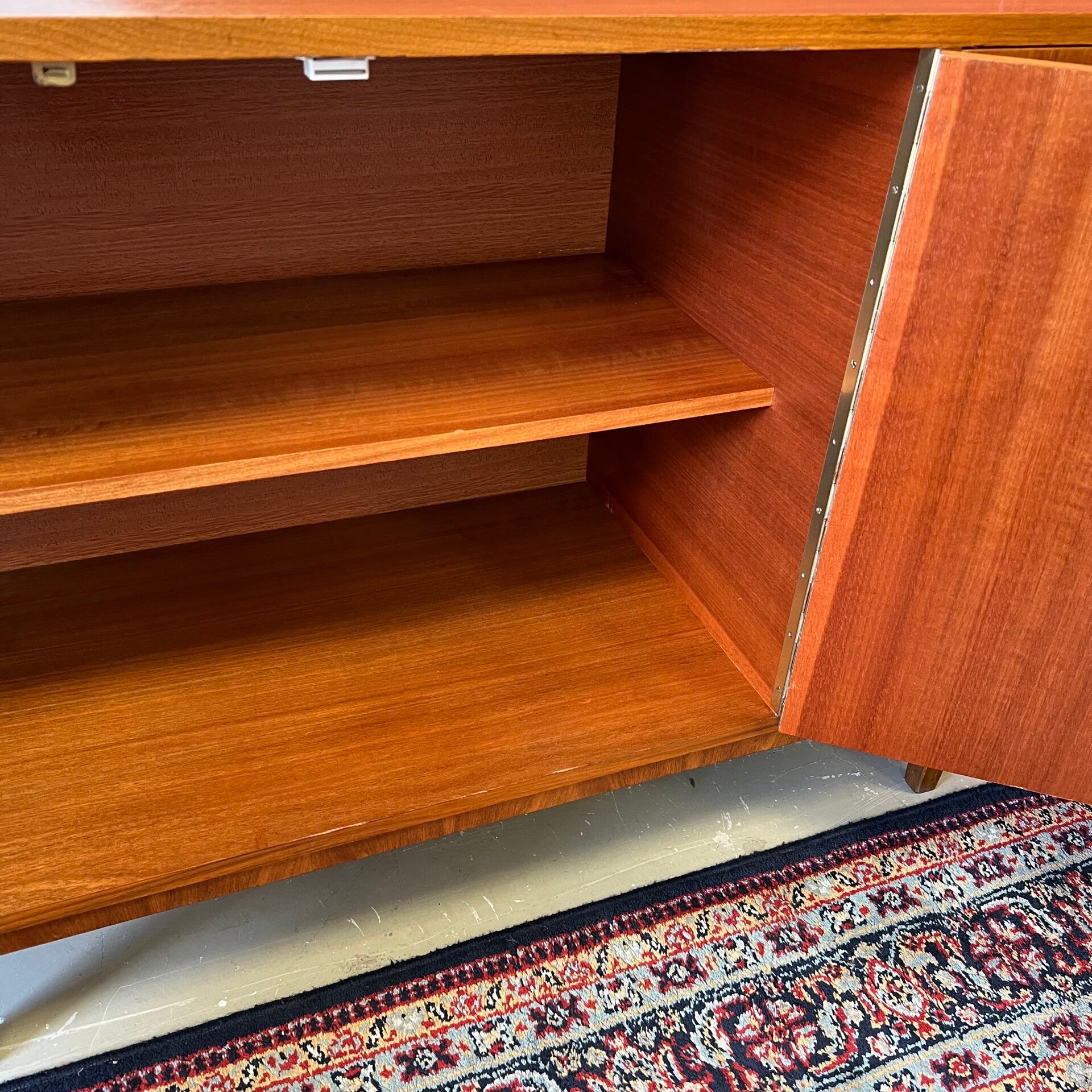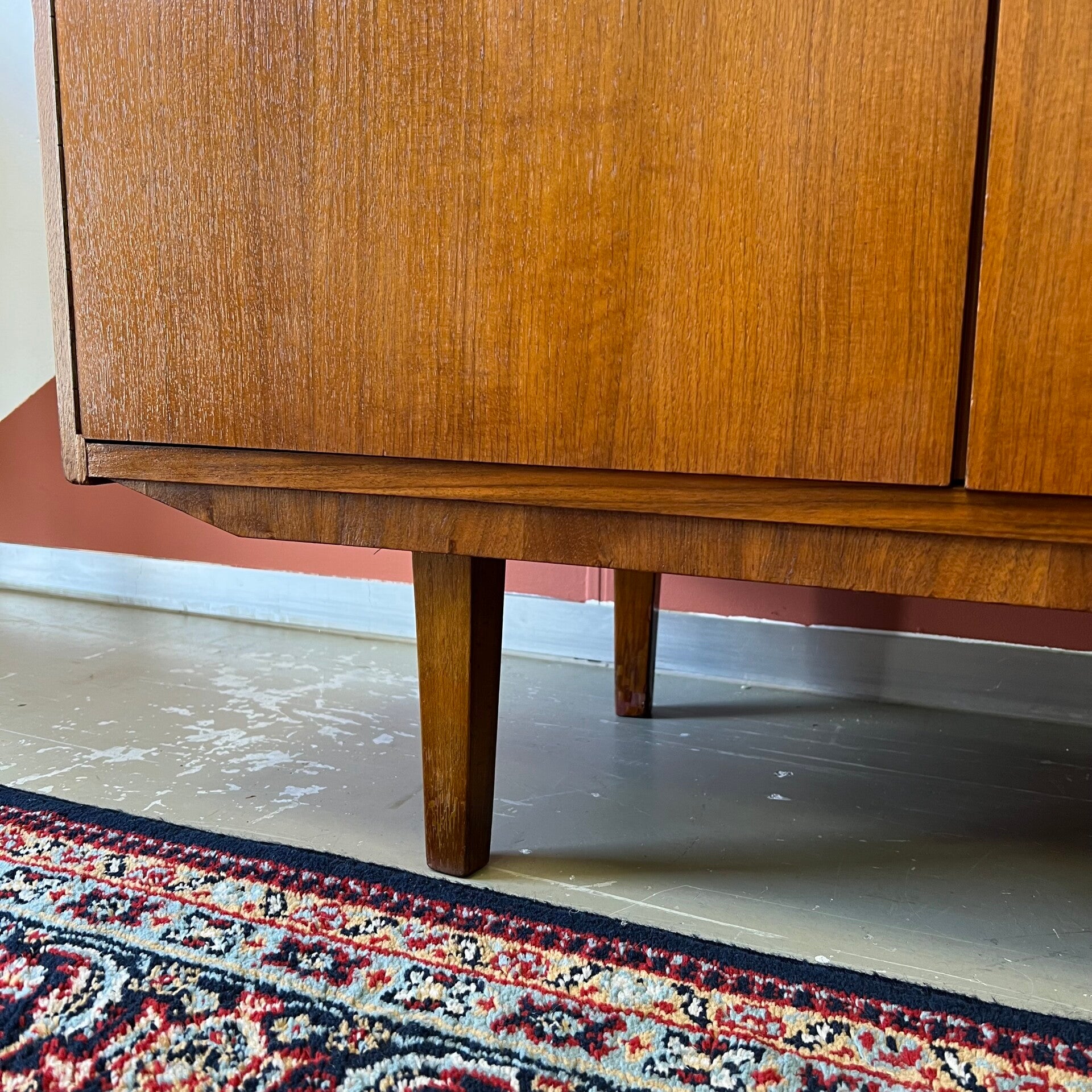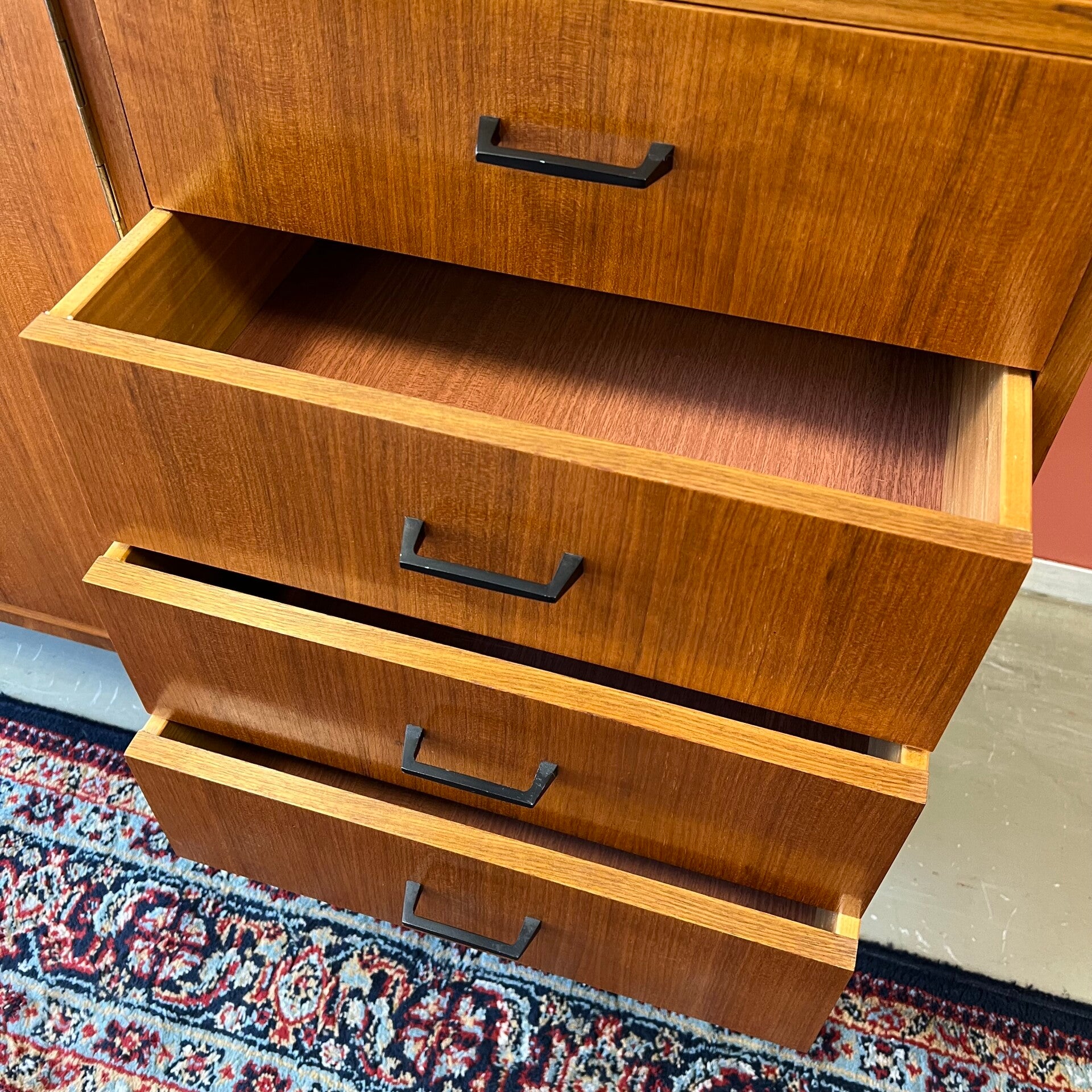 Leuk vintage compact dressoir, uitgevoerd in teak (fineer) met zwarte handgrepen en slanke pootjes.