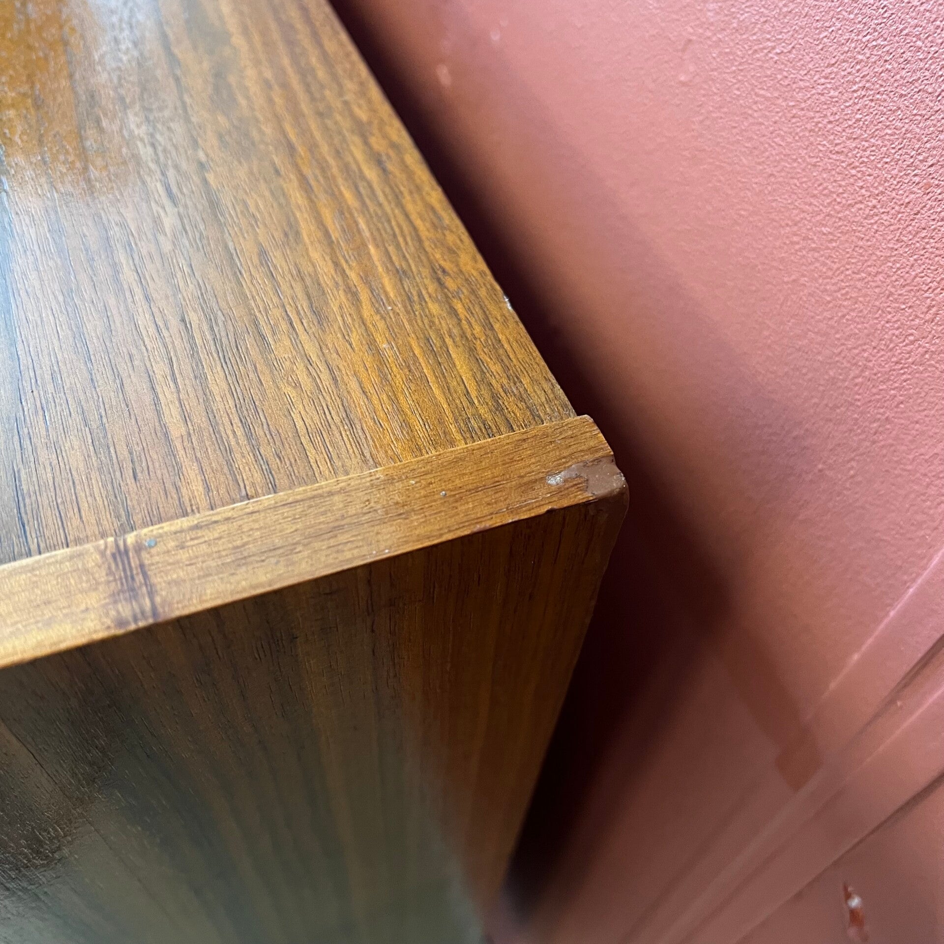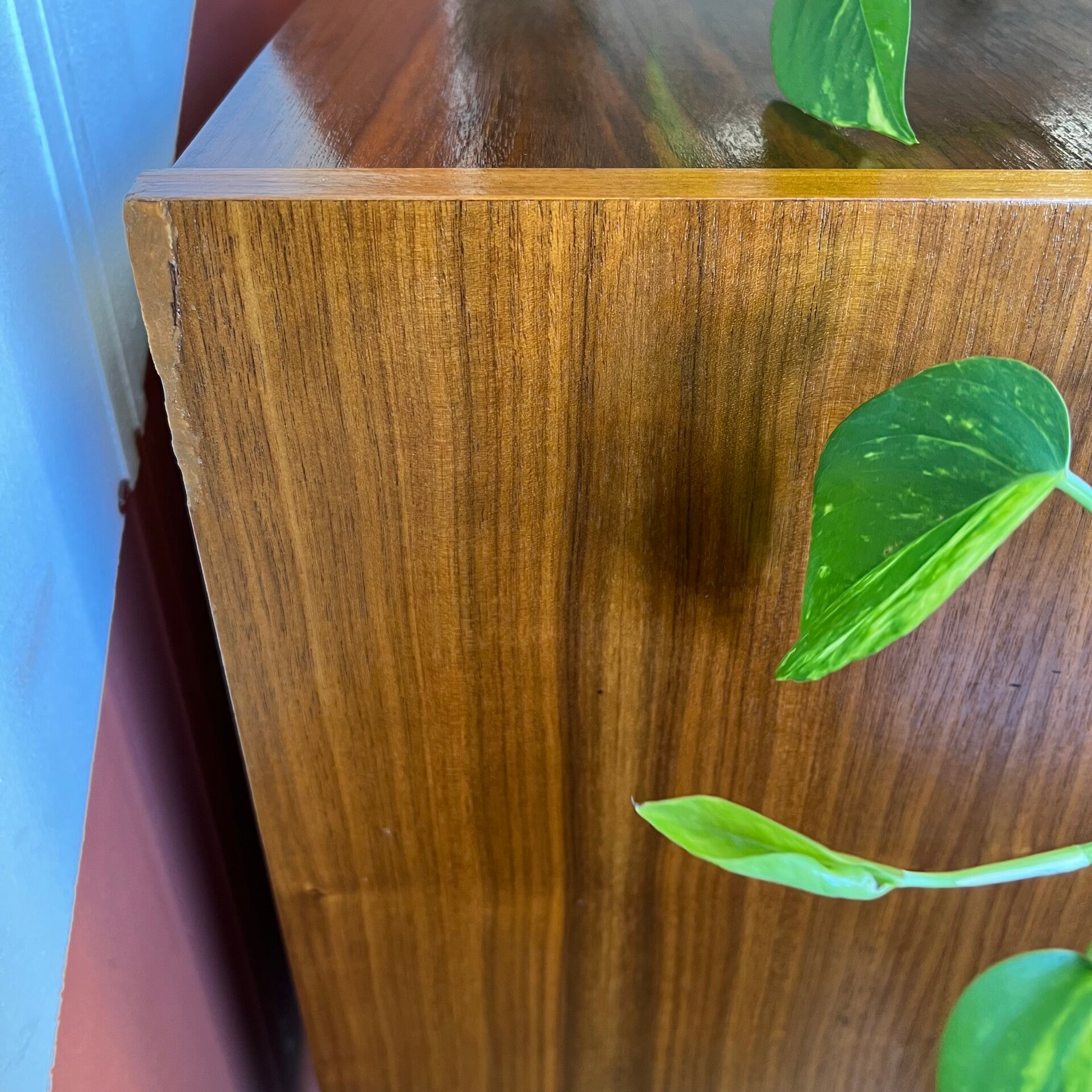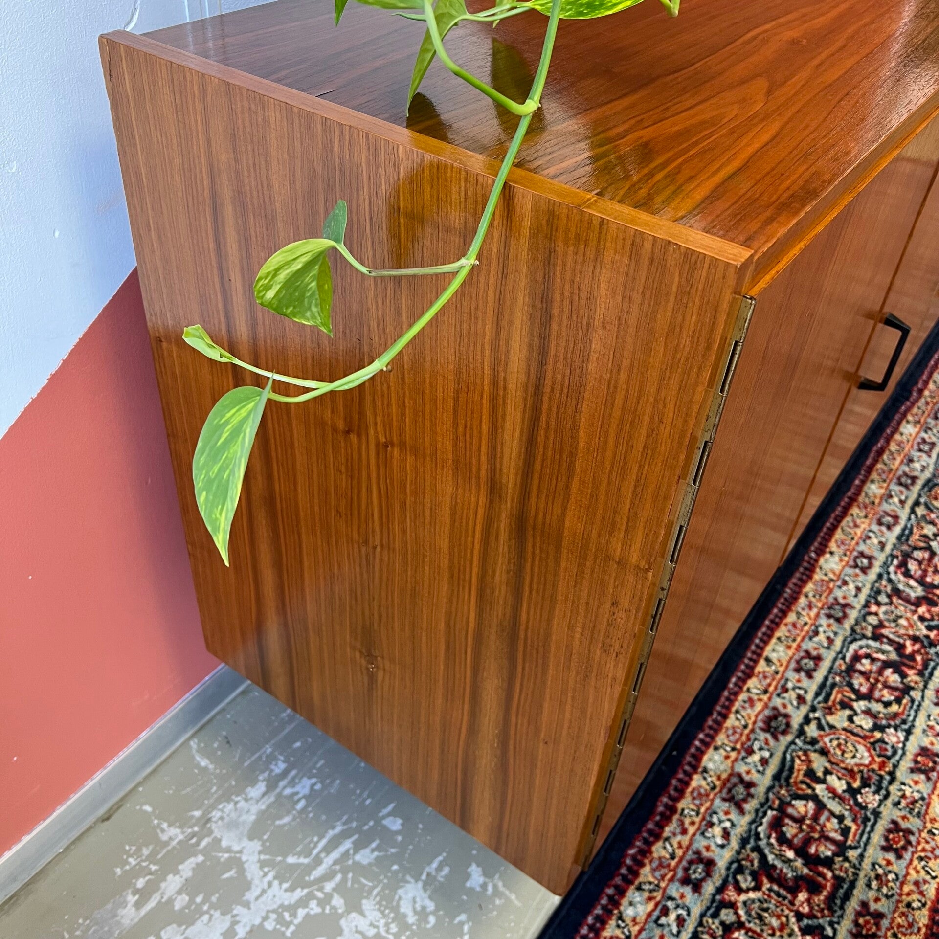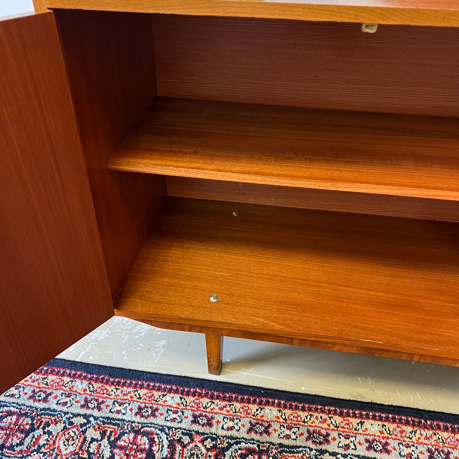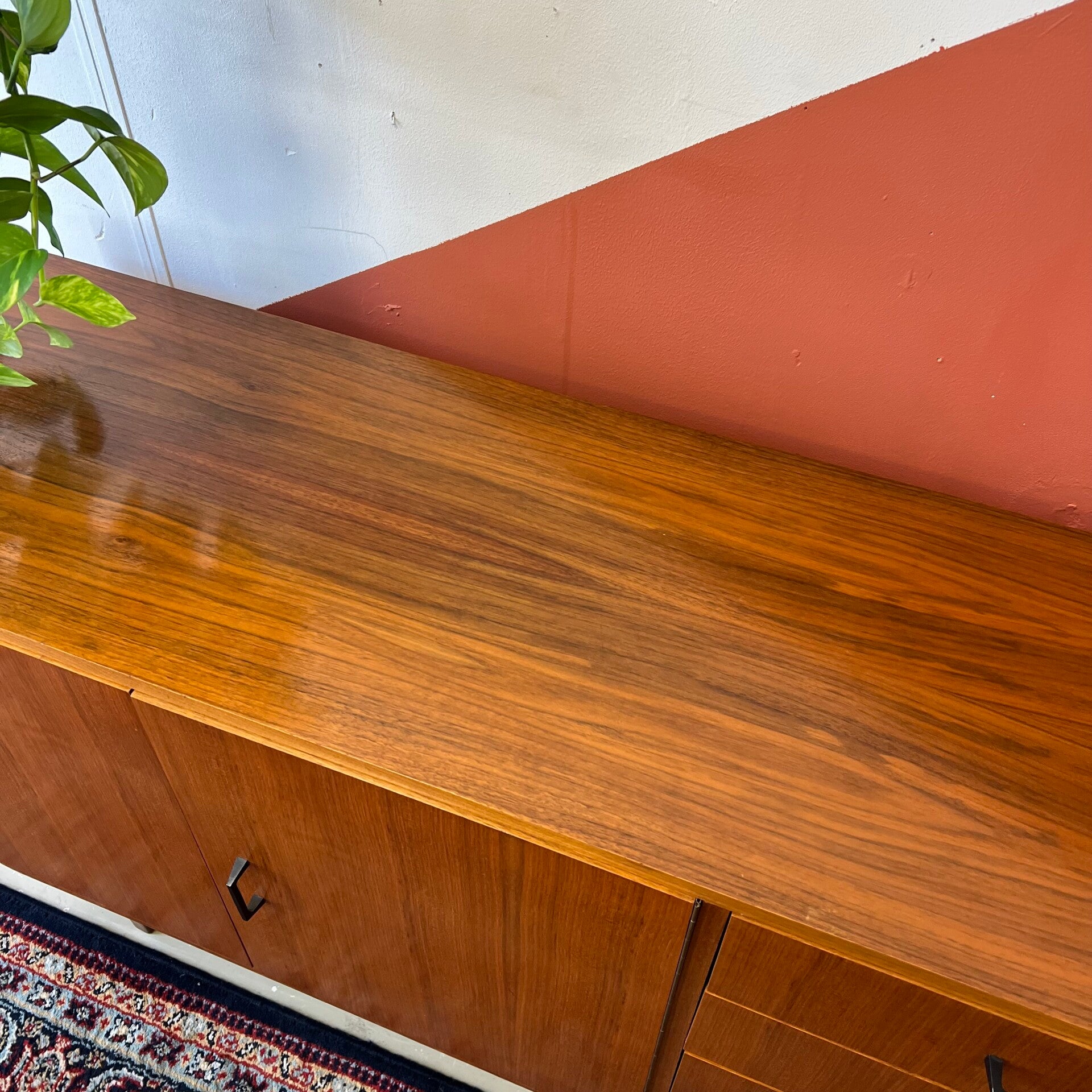 Leuk vintage compact dressoir, uitgevoerd in teak (fineer) met zwarte handgrepen en slanke pootjes.