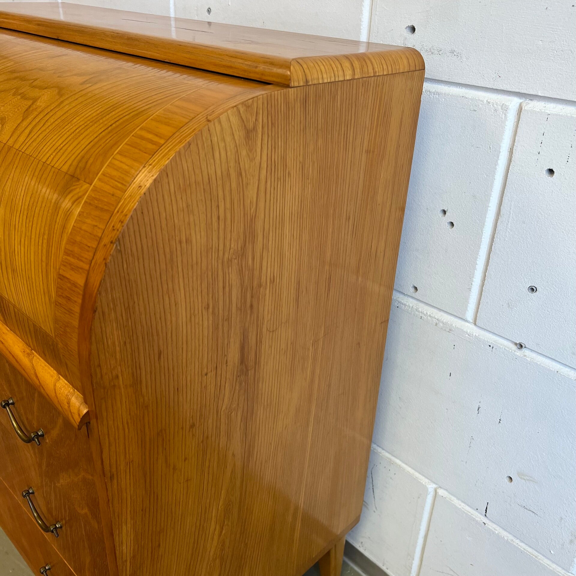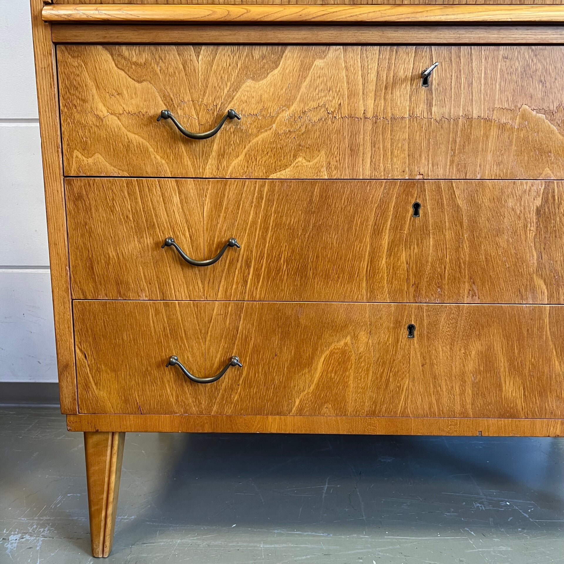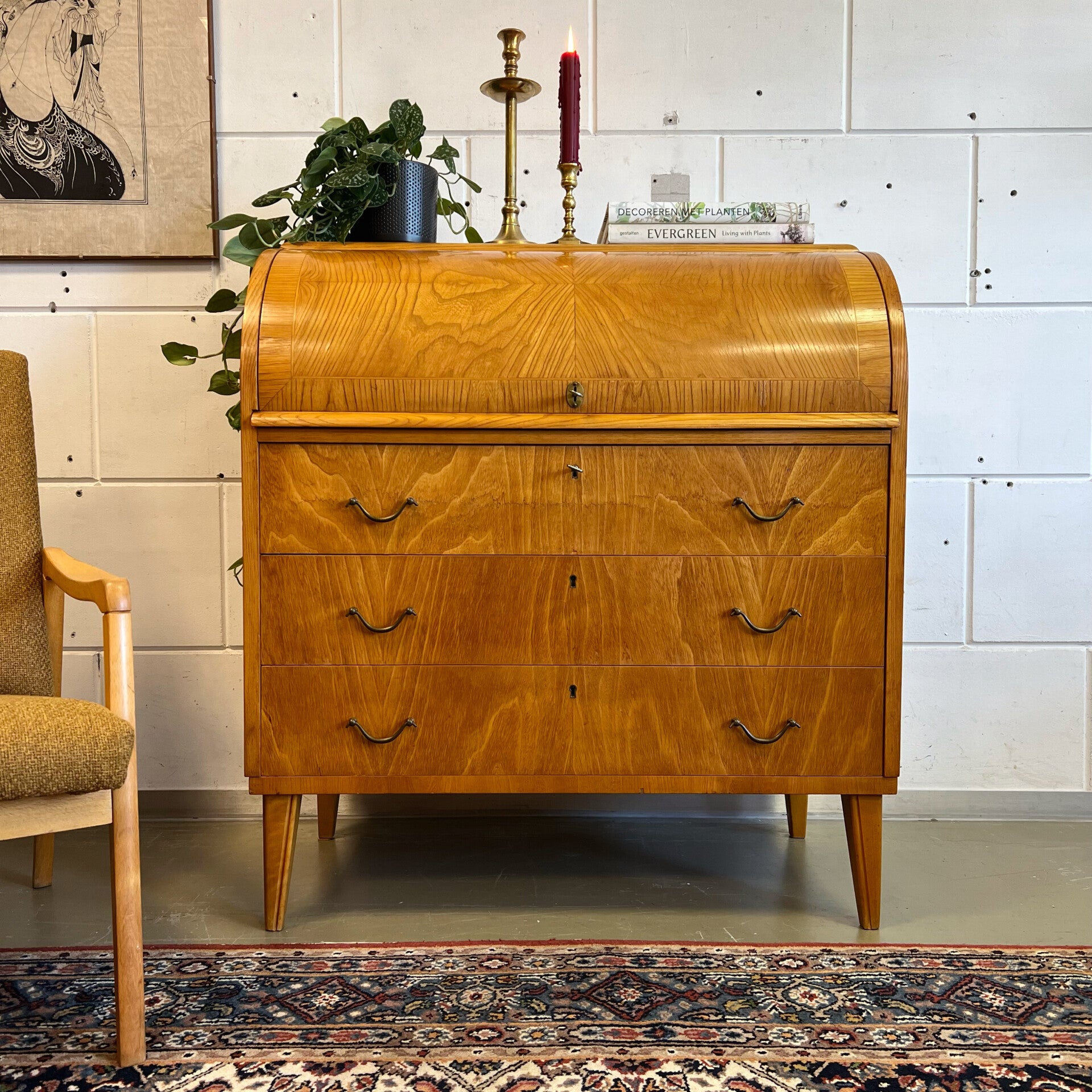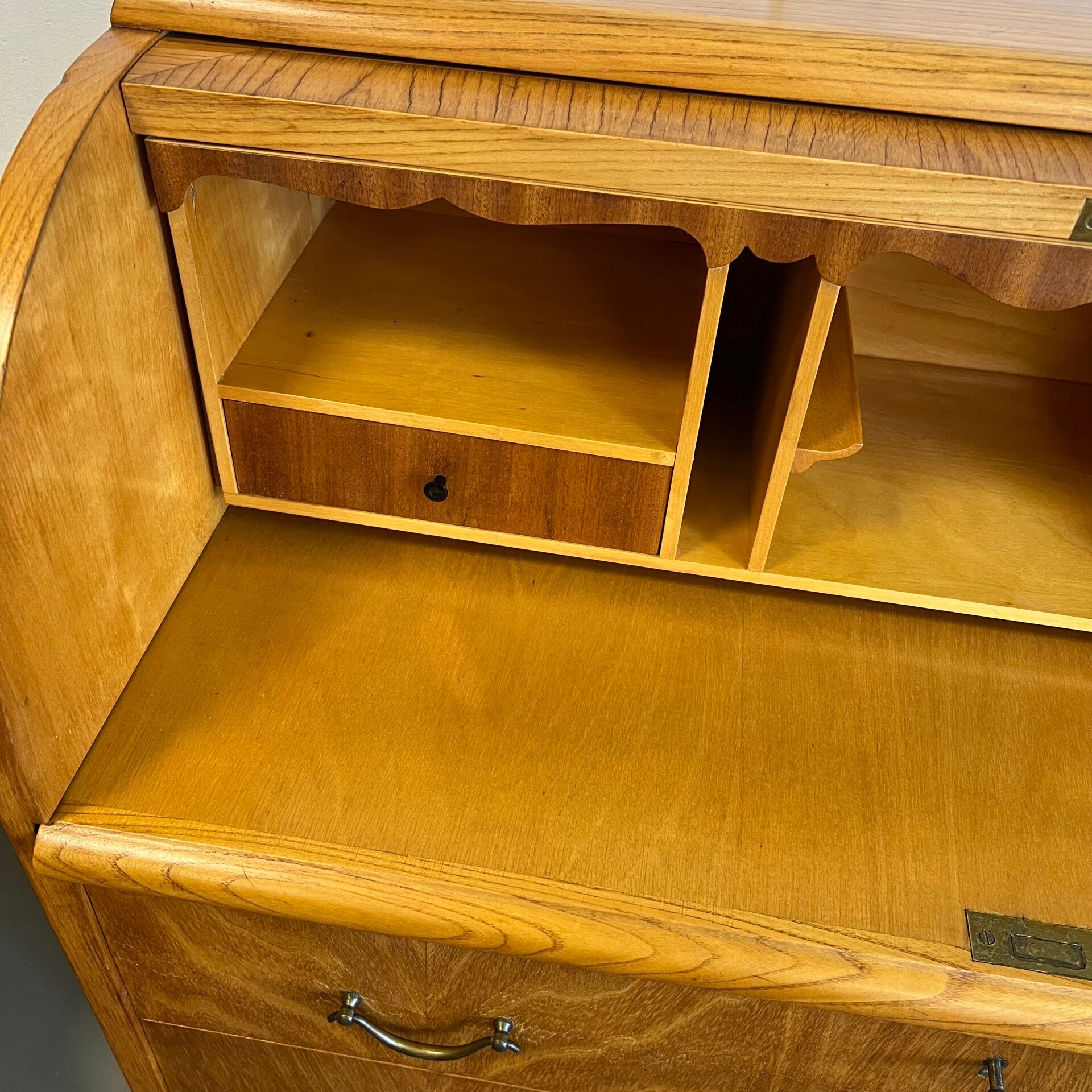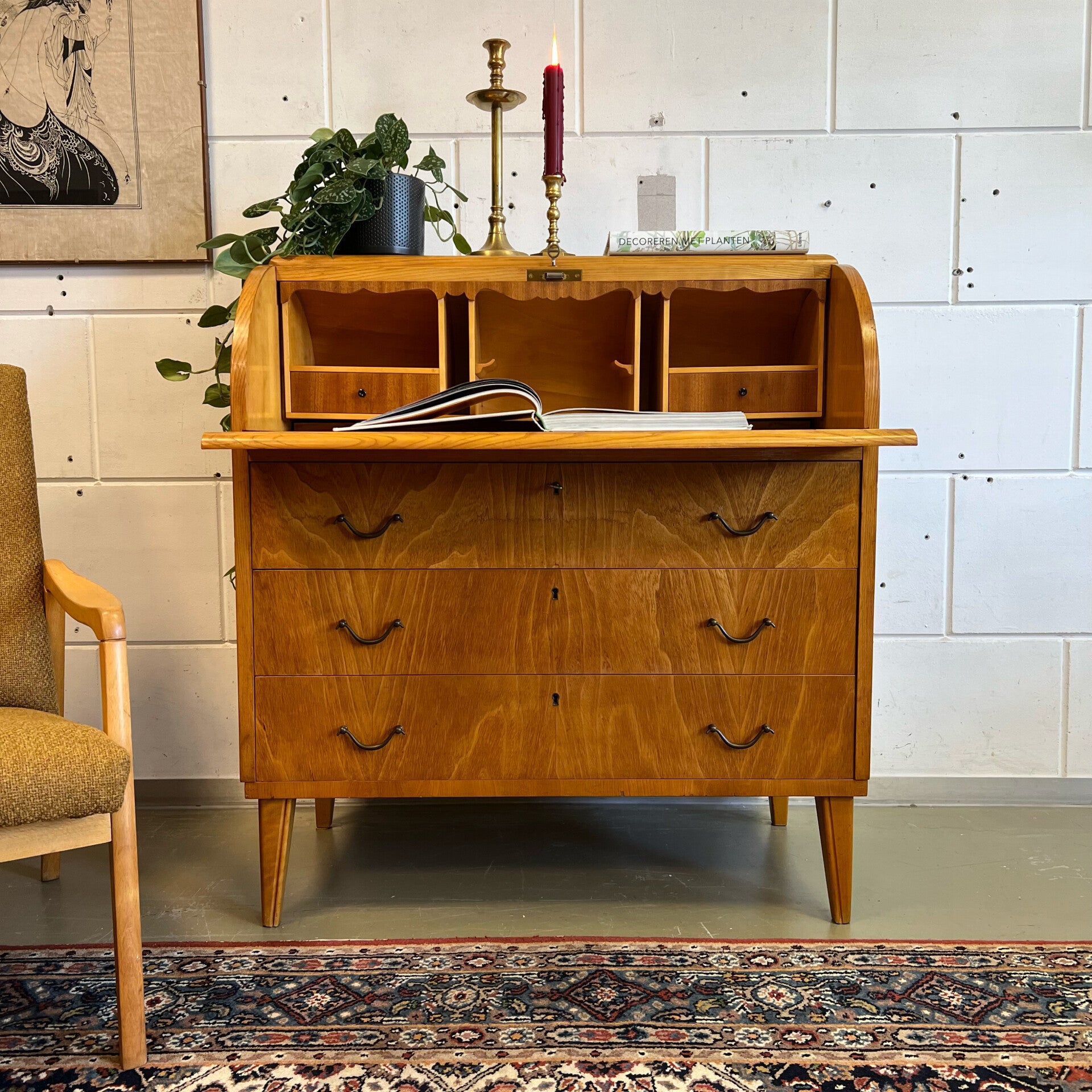 Het meubel heeft een roll top (afsluitbaar, sleutel aanwezig) met uitschuifbaar blad en diverse vakken / lades.