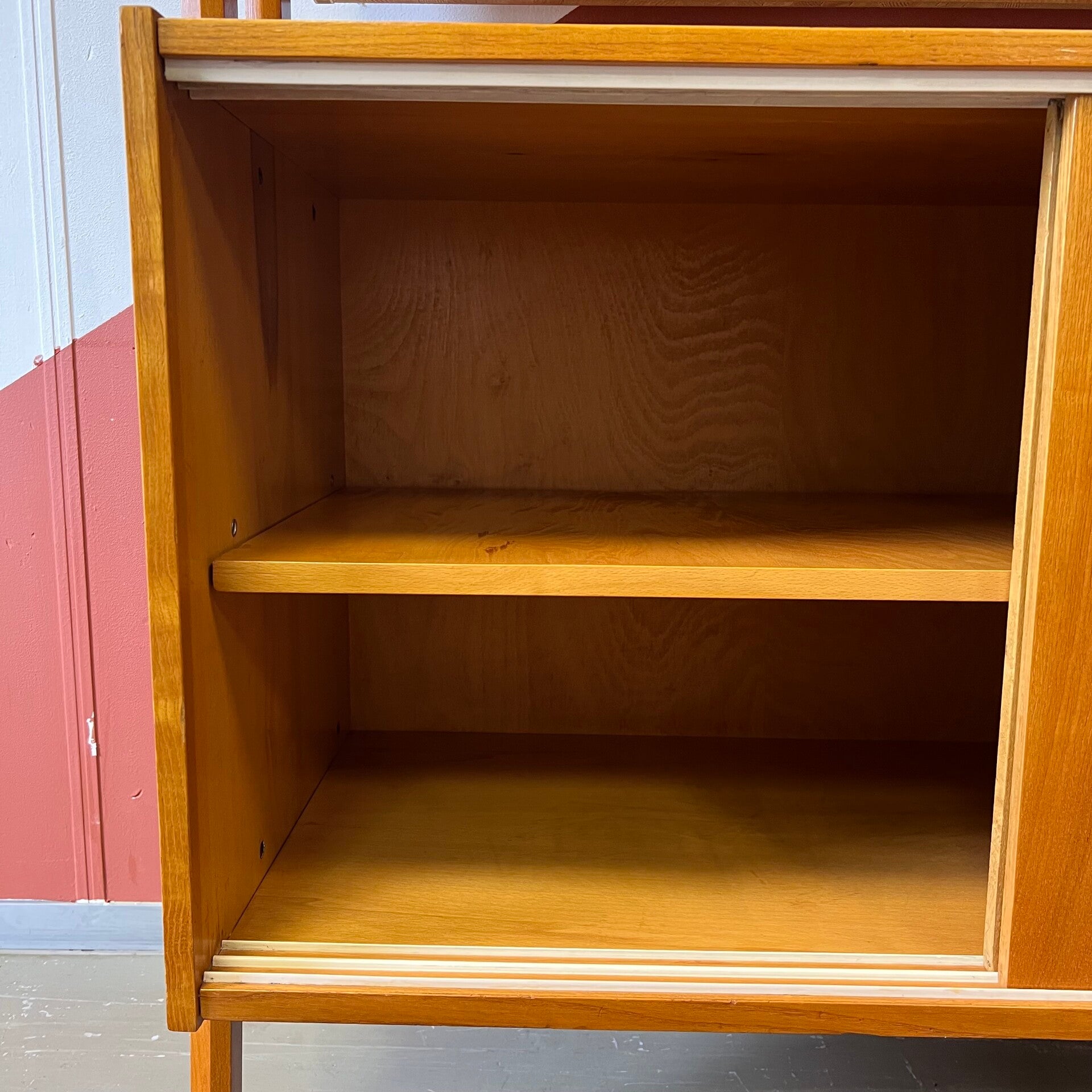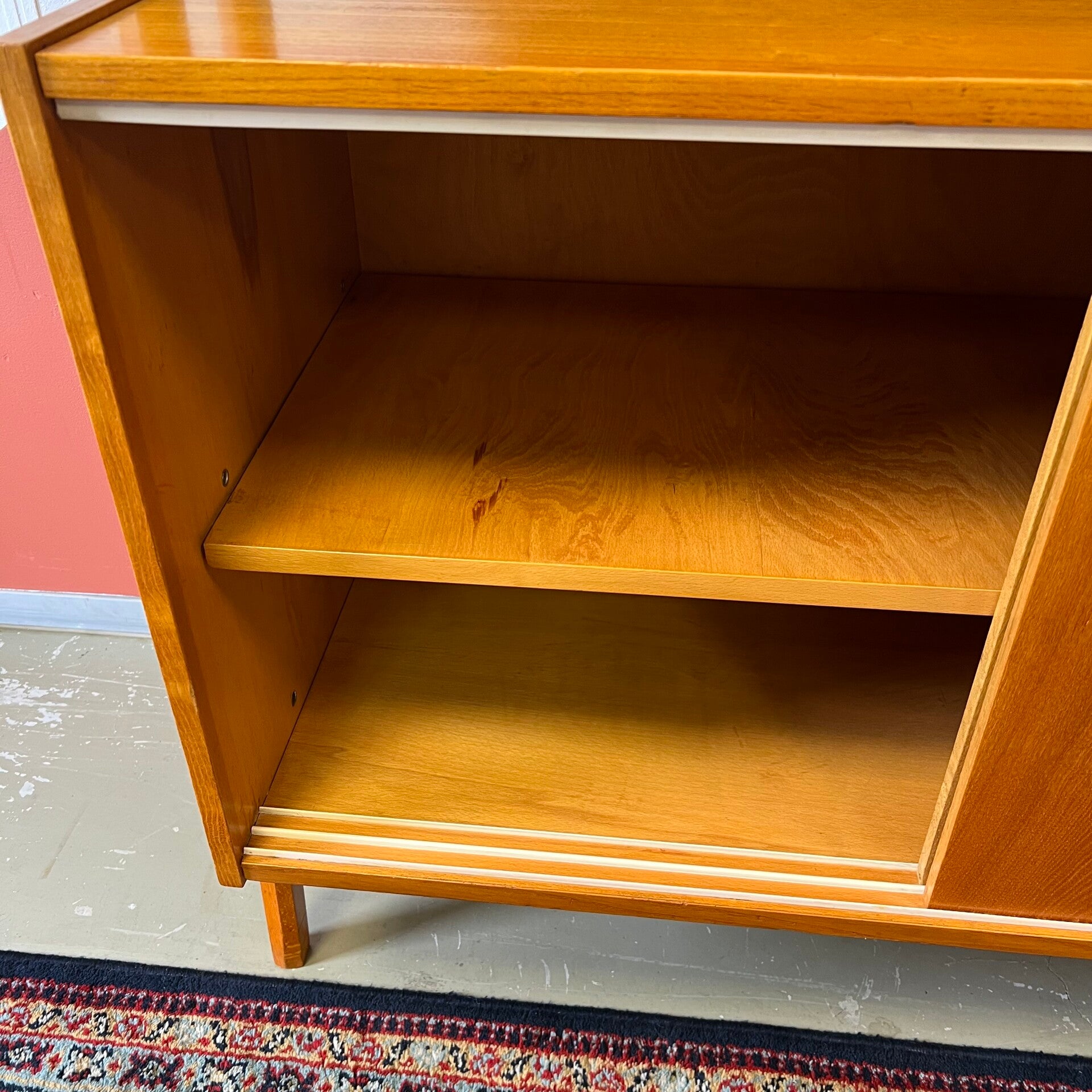 Onderin een schuifdeurkast met de originele kunststof handgrepen en uitneembare plank.