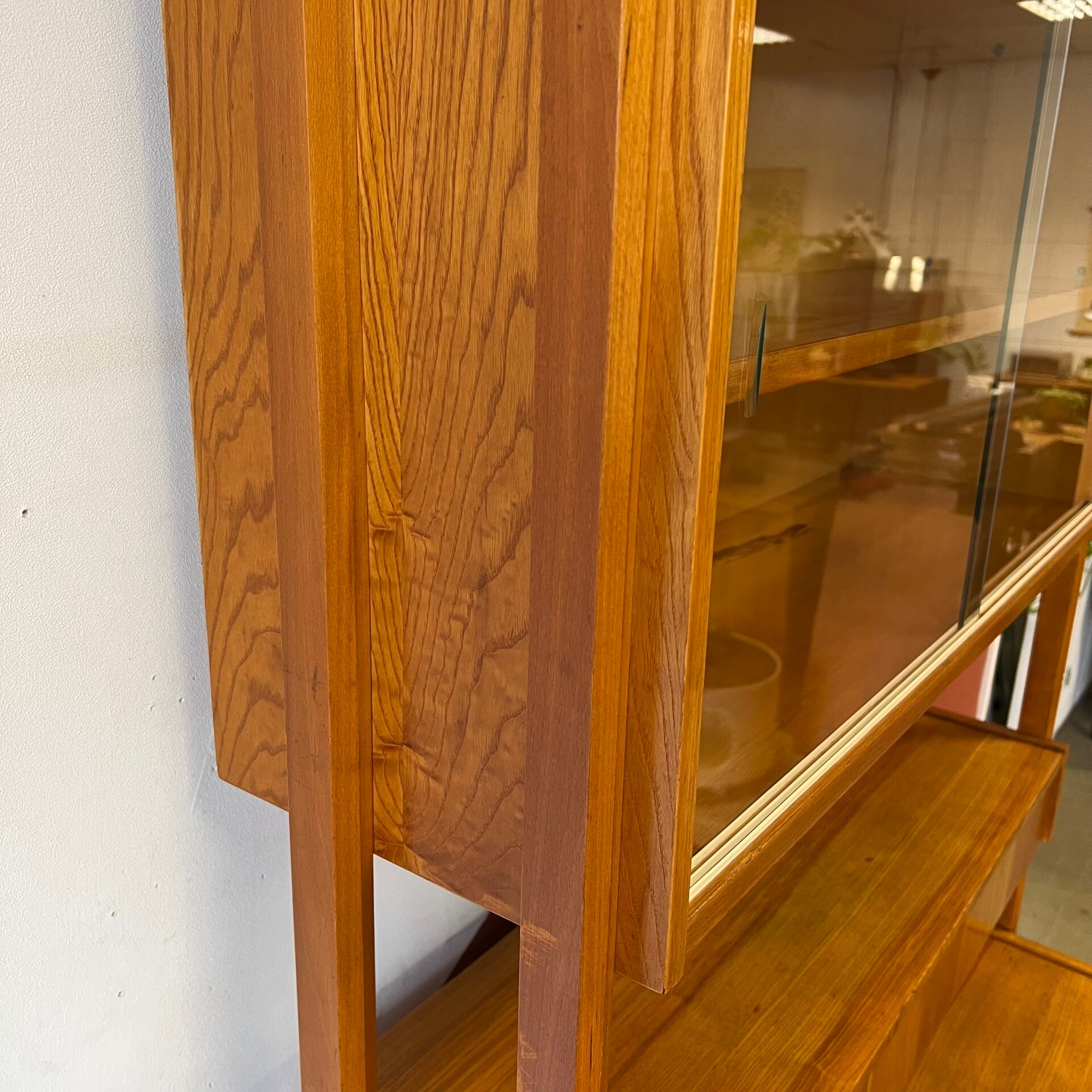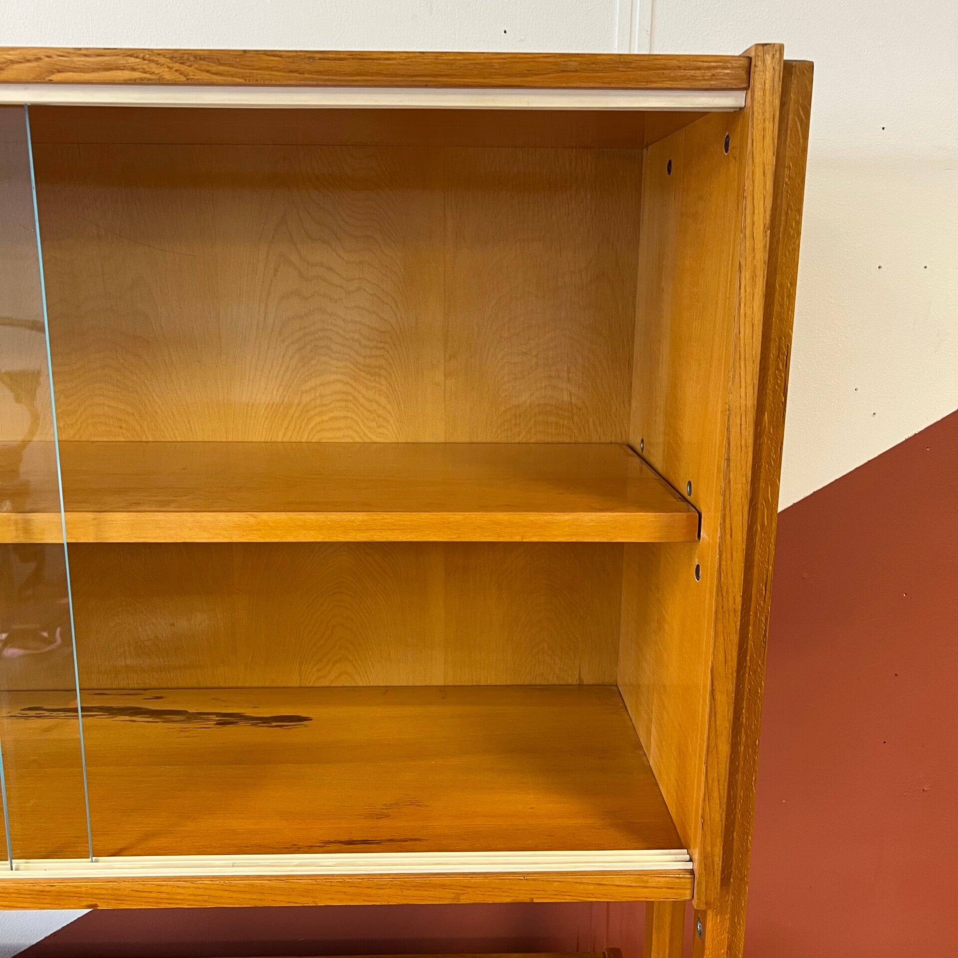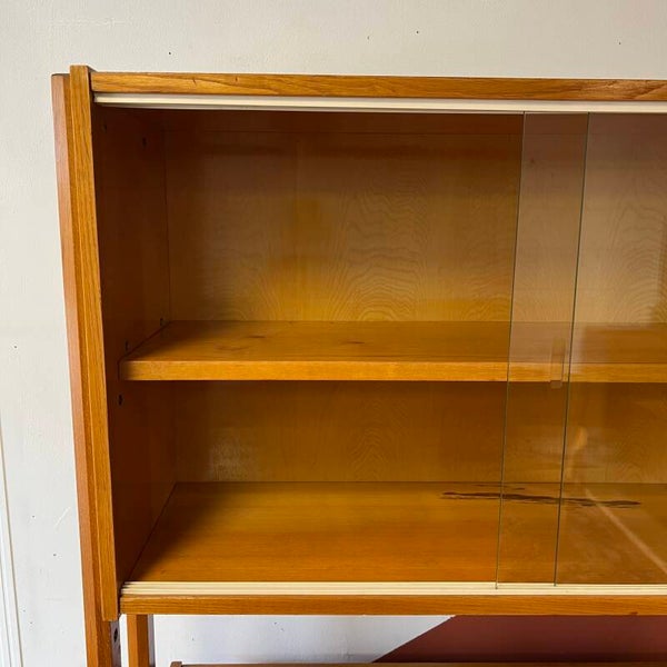 Het meubel heeft bovenin een vitrinekast met glazen schuifruitjes en een uitneembare plank.
