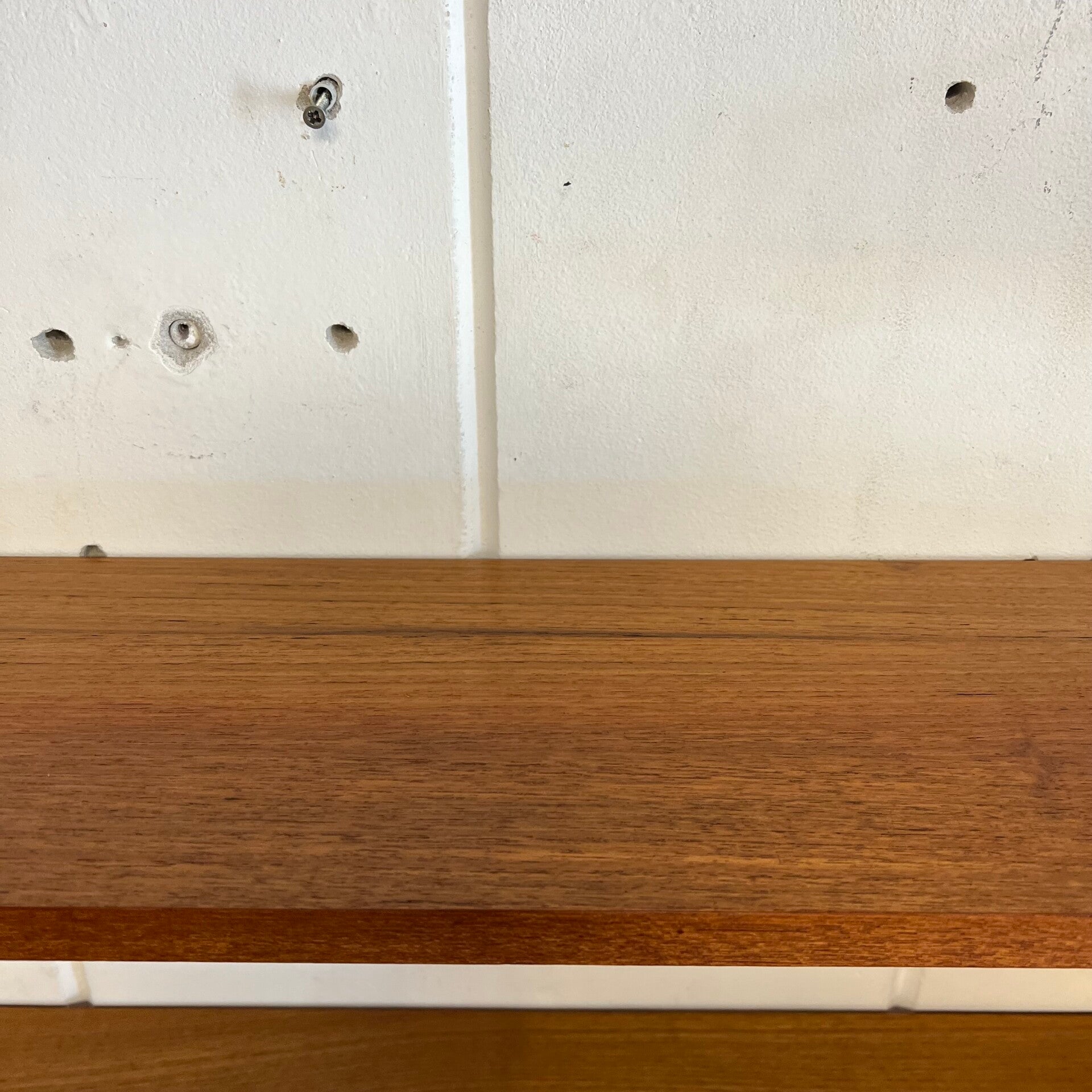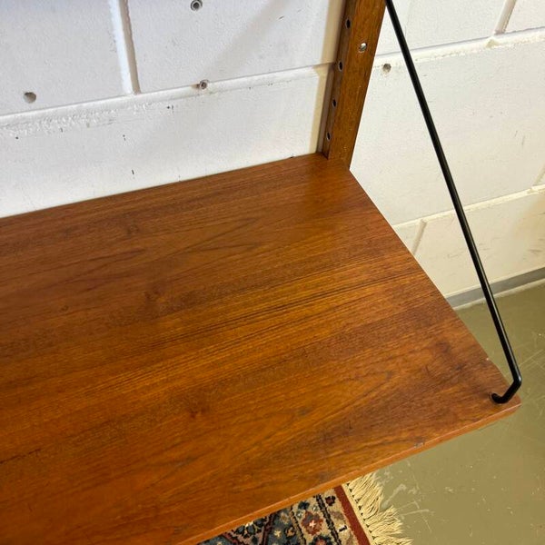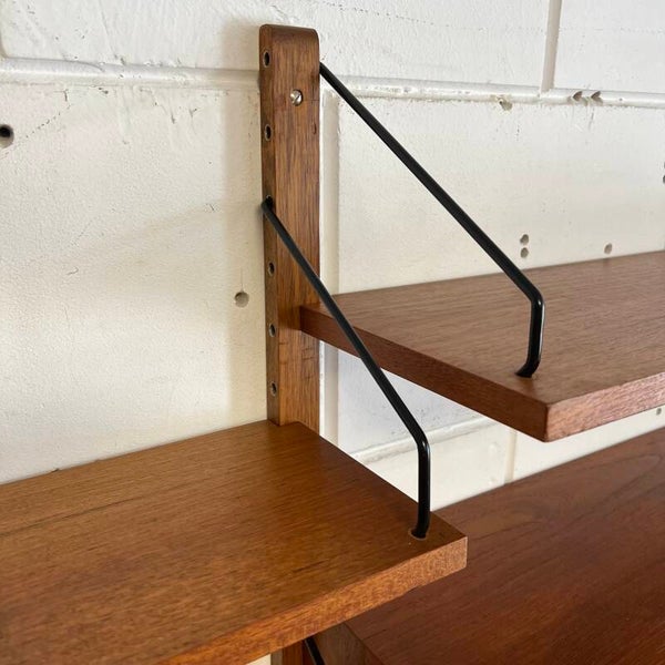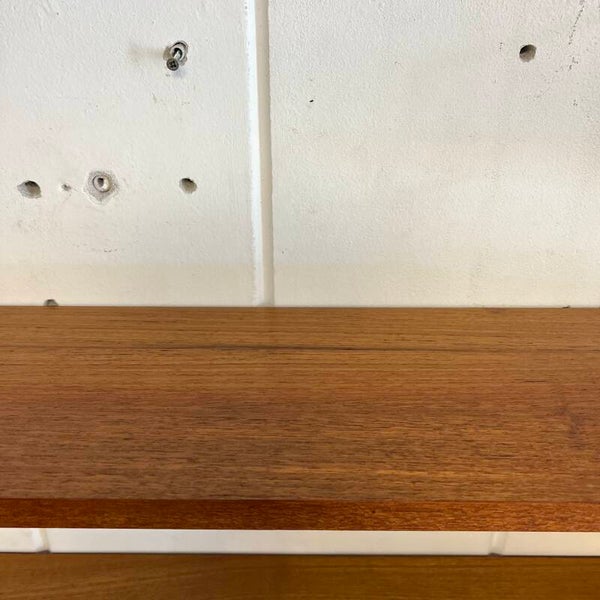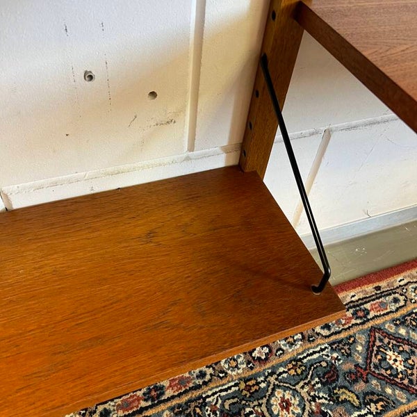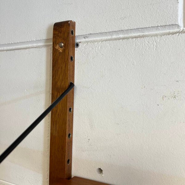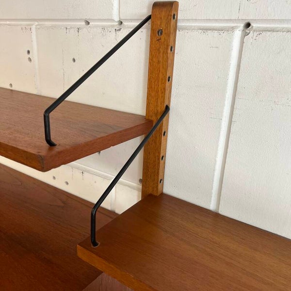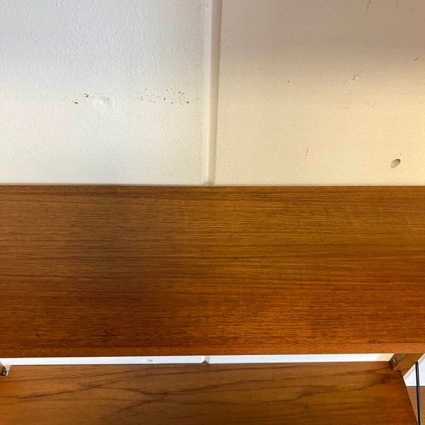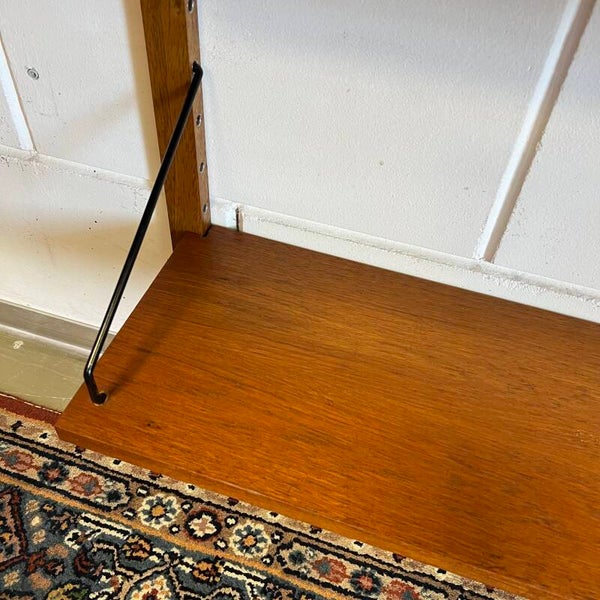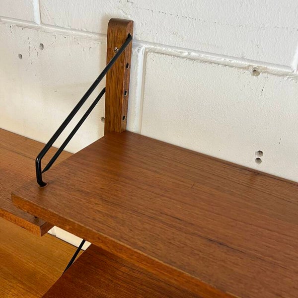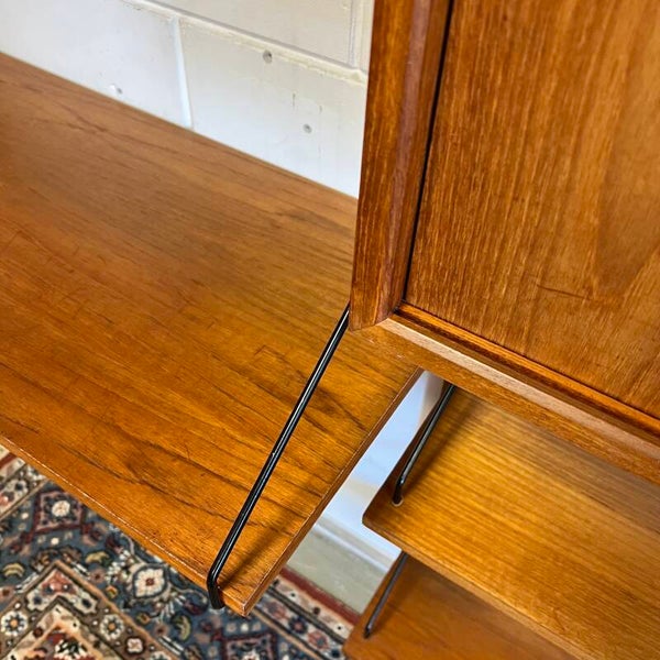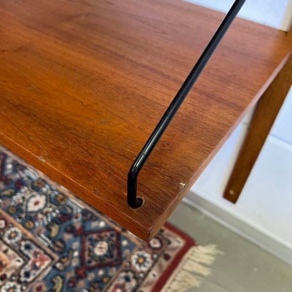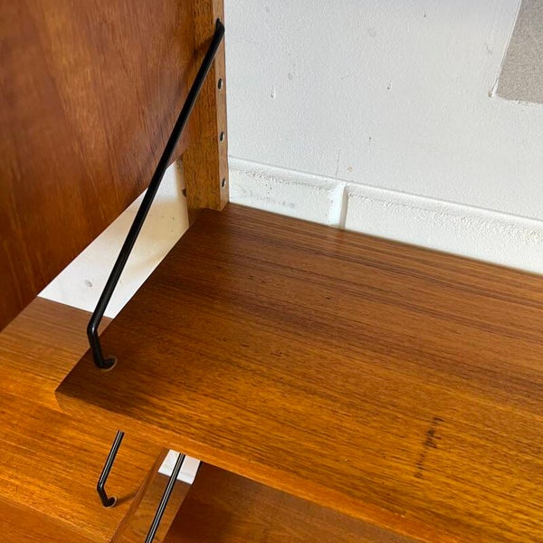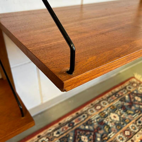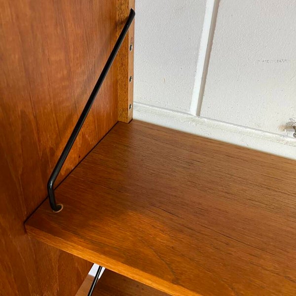 Prachtig vintage wandmeubel, wall unit uitgevoerd in teak (fineer) met zwart metalen beugels.