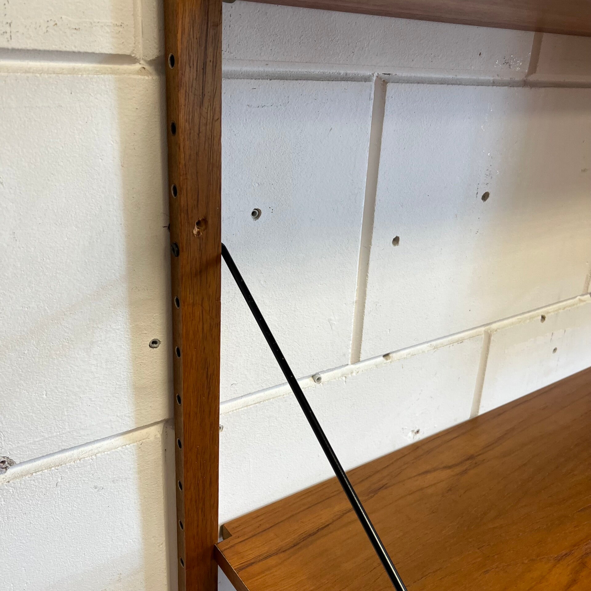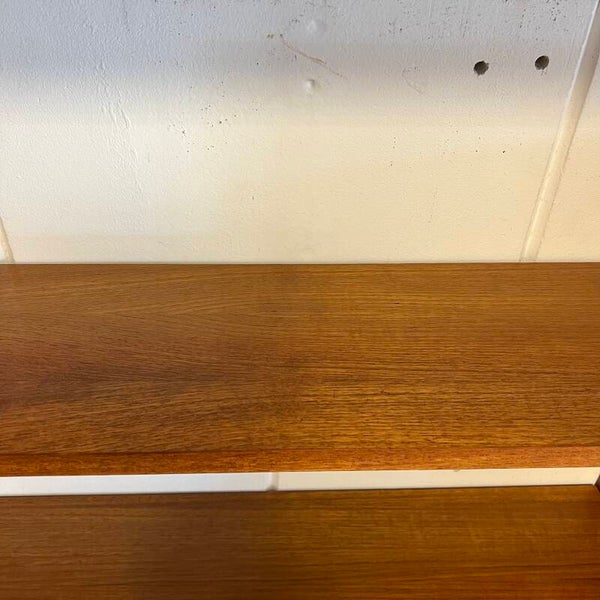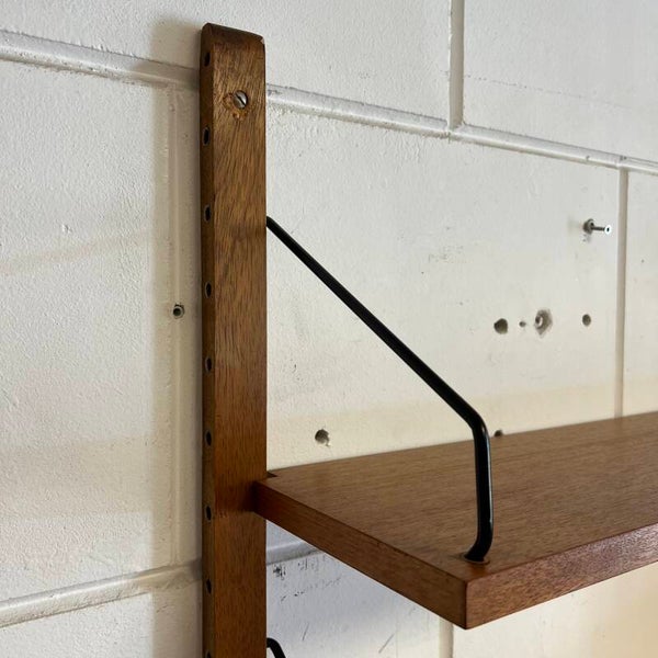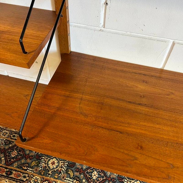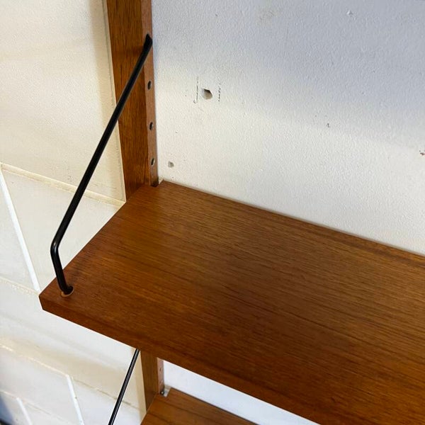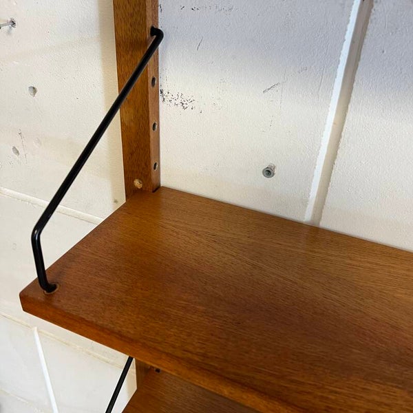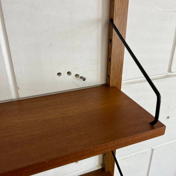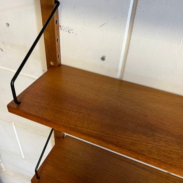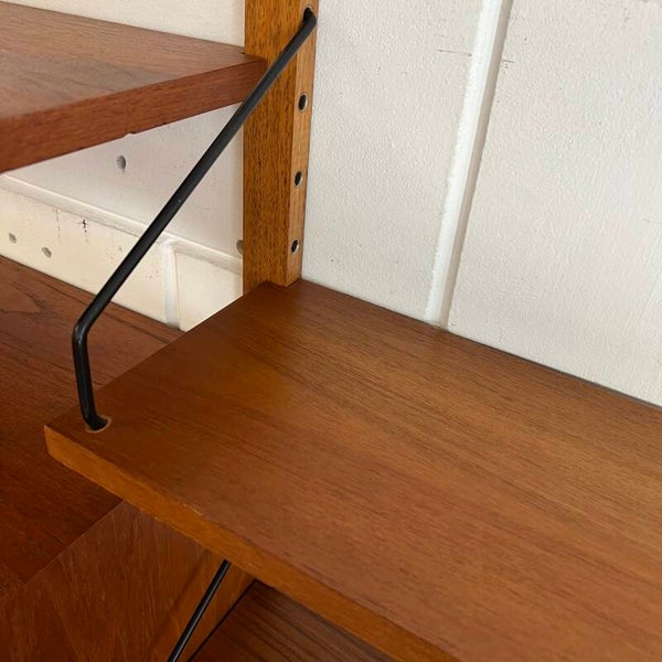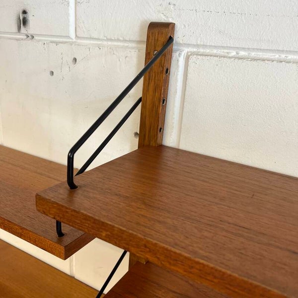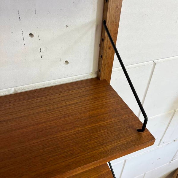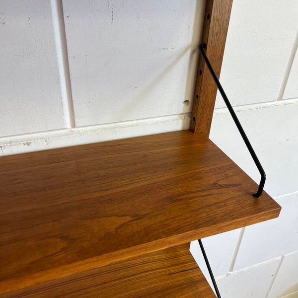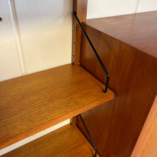 Prachtig vintage wandmeubel, wall unit uitgevoerd in teak (fineer) met zwart metalen beugels.