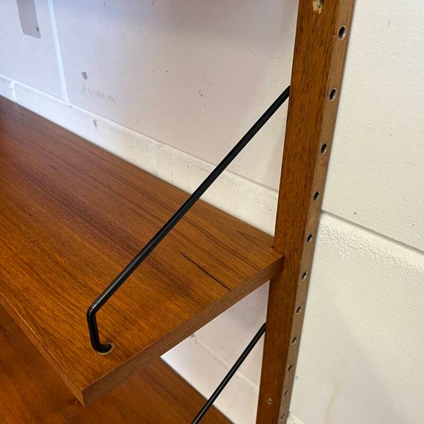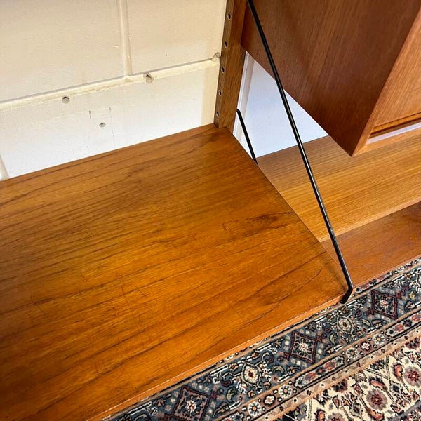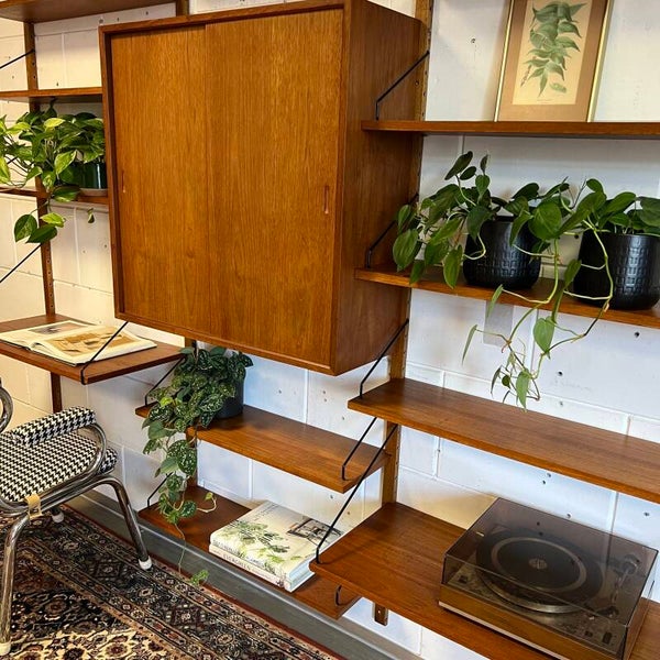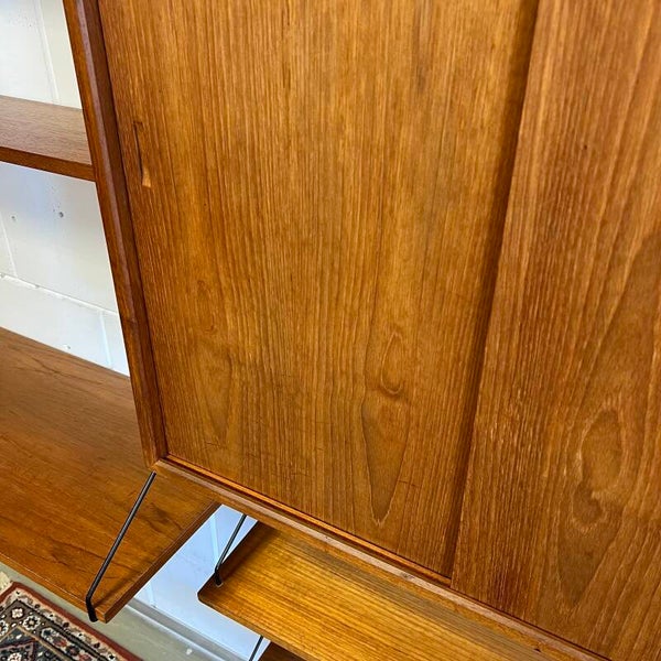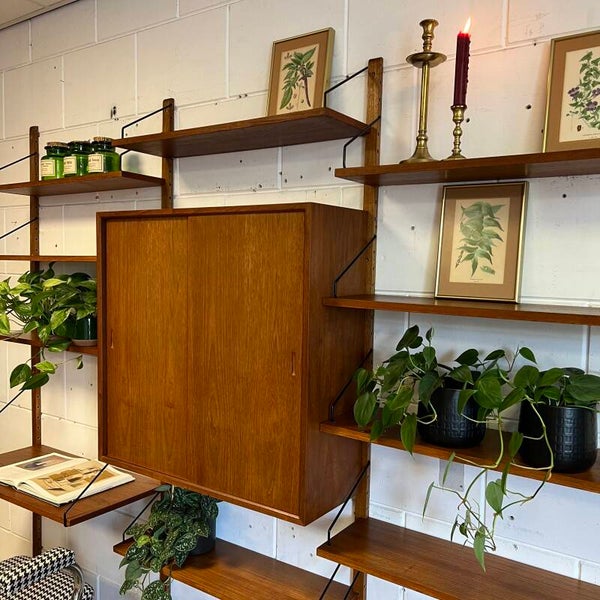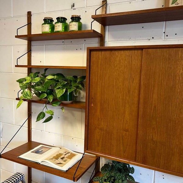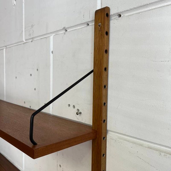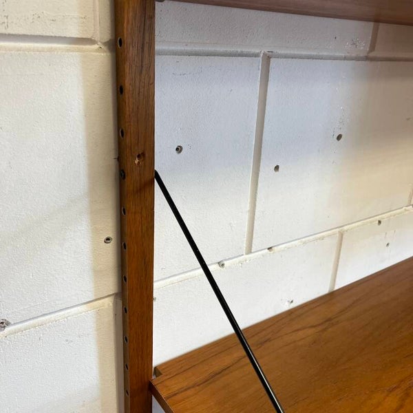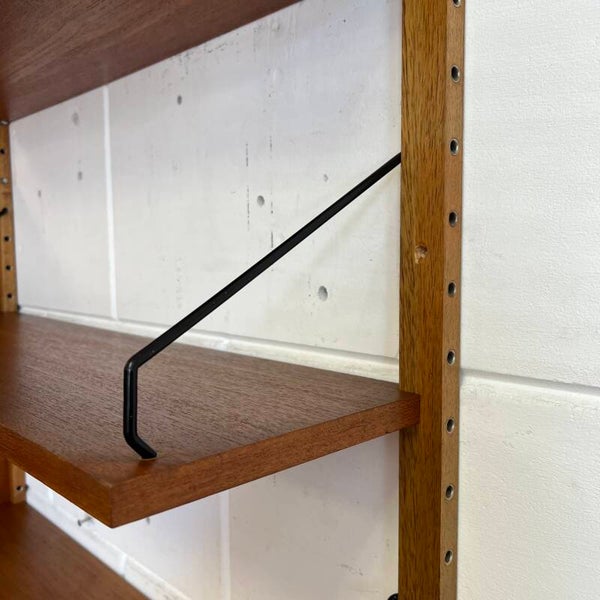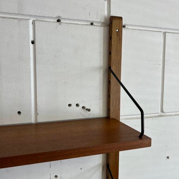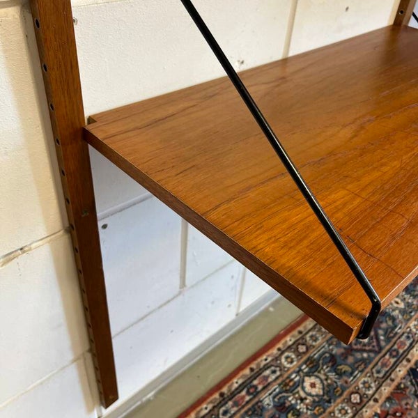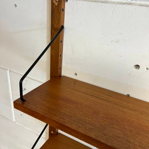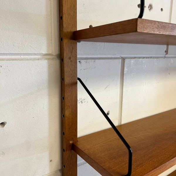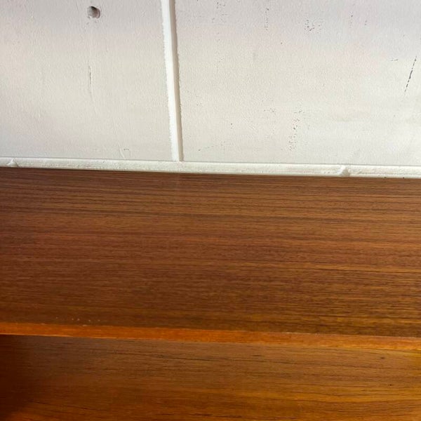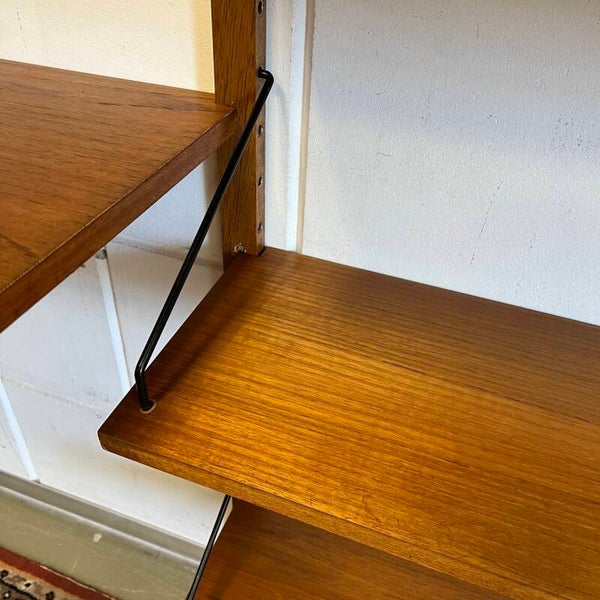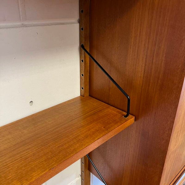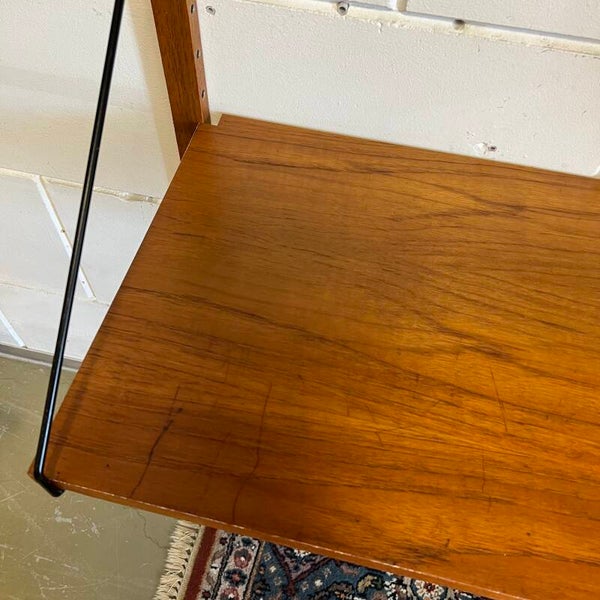Prachtig vintage wandmeubel, wall unit uitgevoerd in teak (fineer) met zwart metalen beugels.