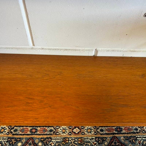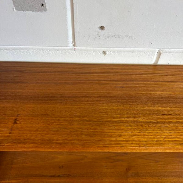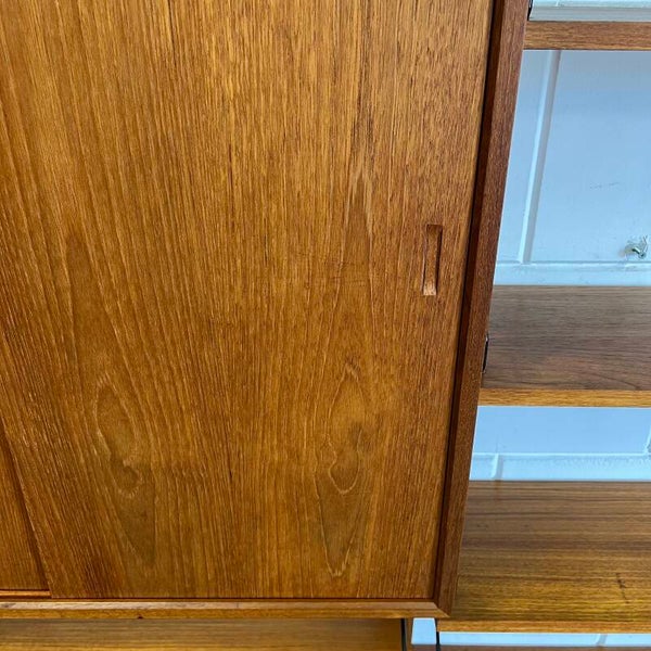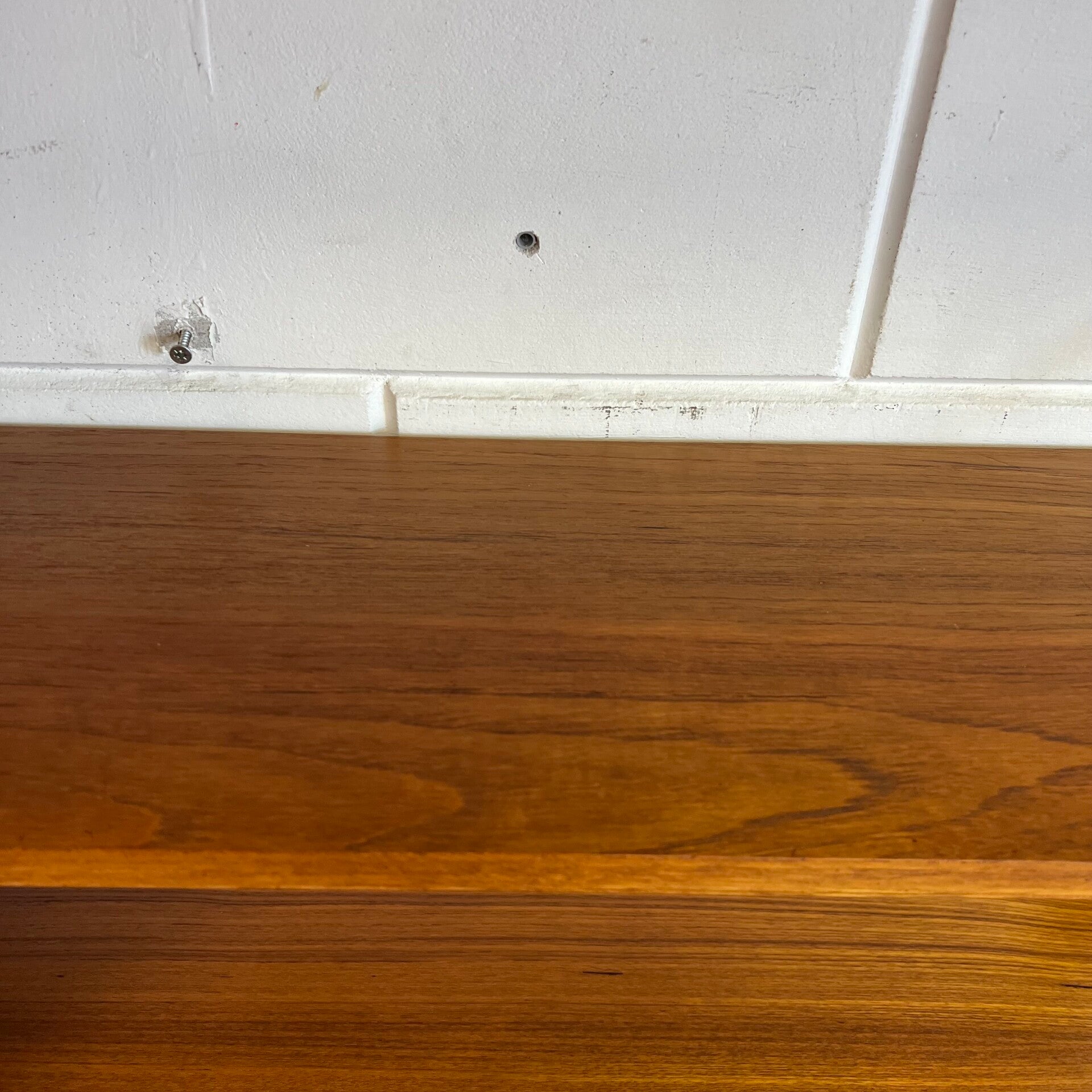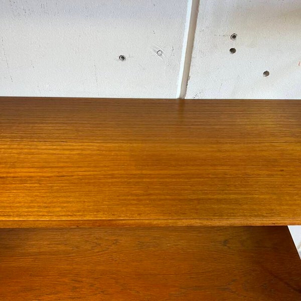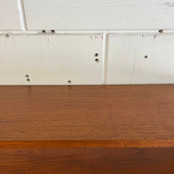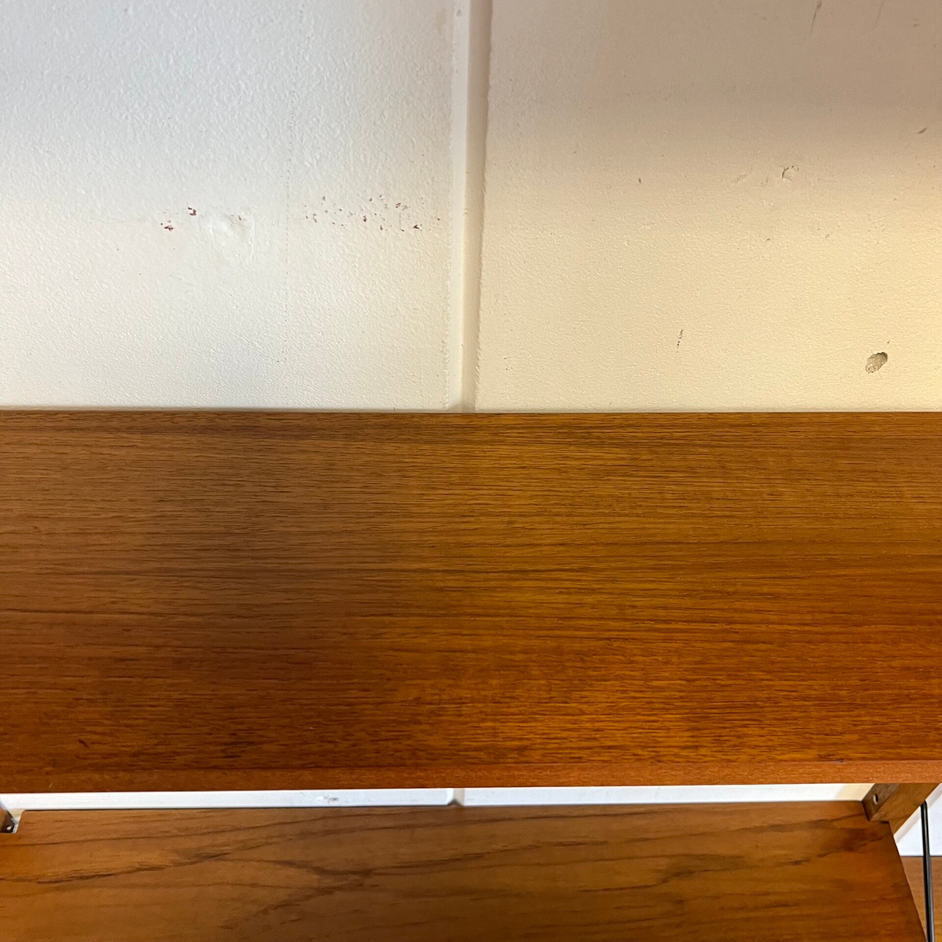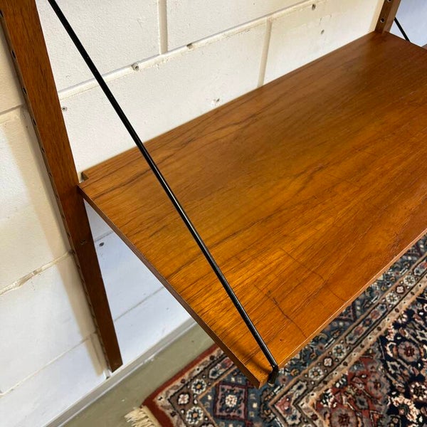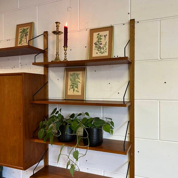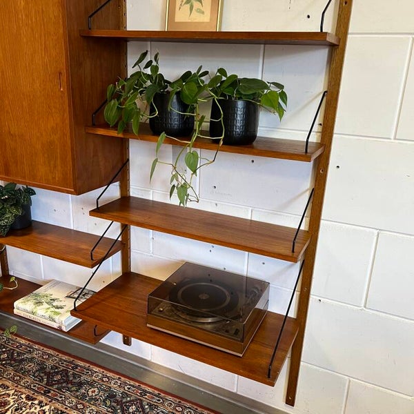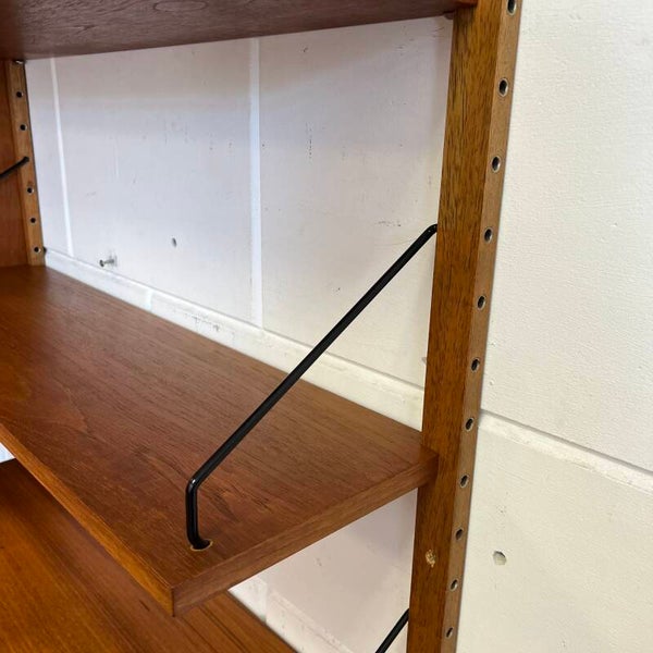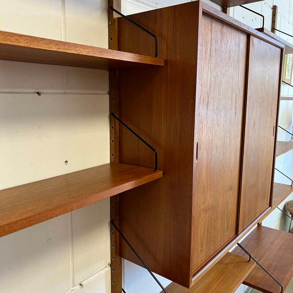 Prachtig vintage wandmeubel, wall unit uitgevoerd in teak (fineer) met zwart metalen beugels.