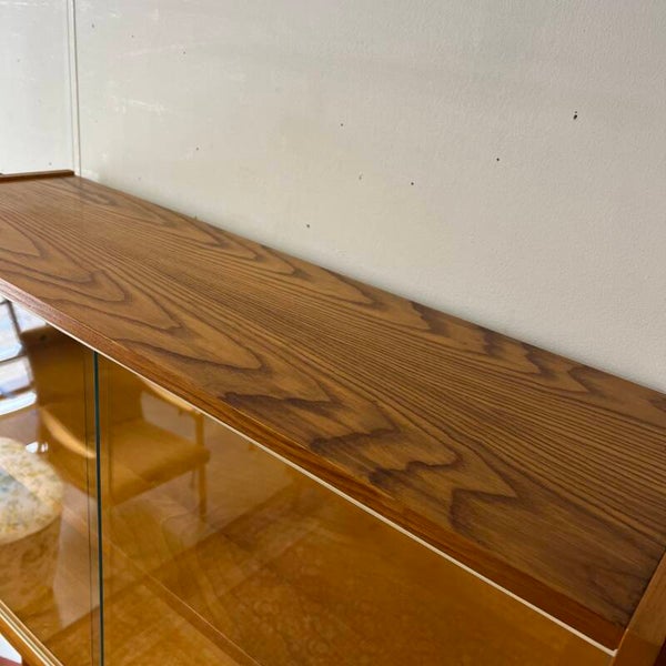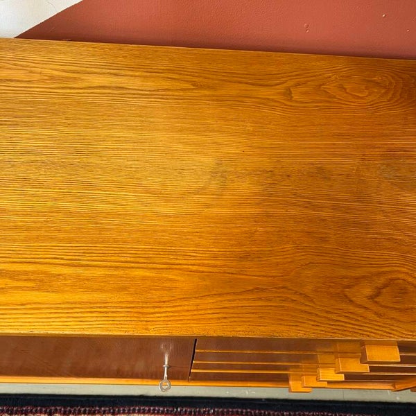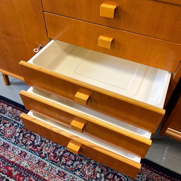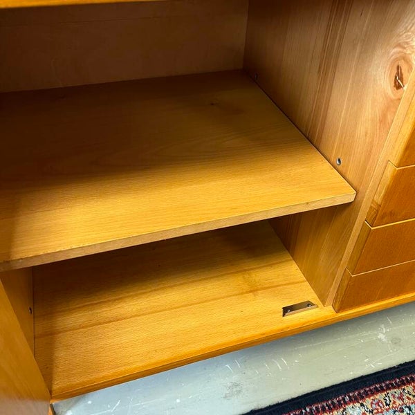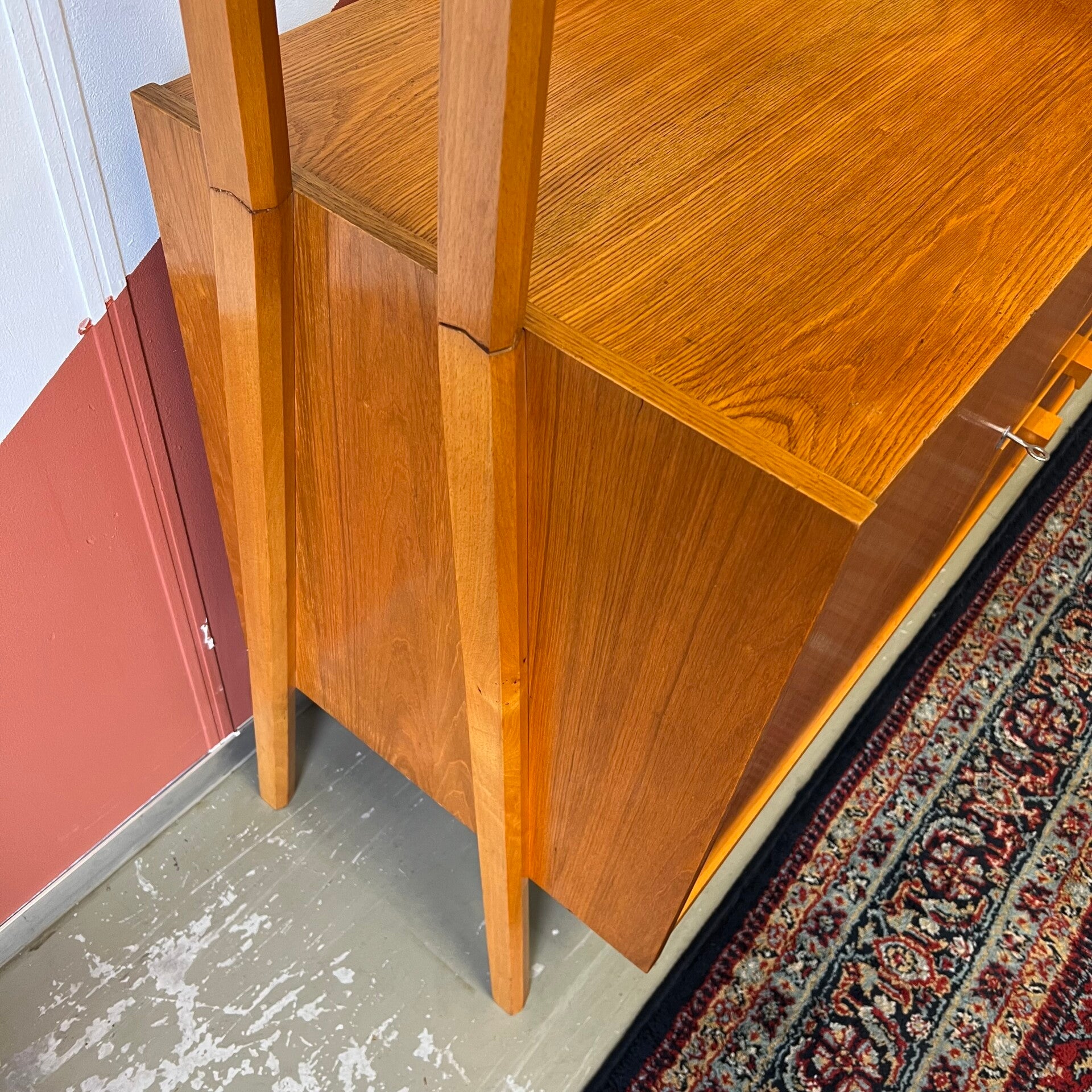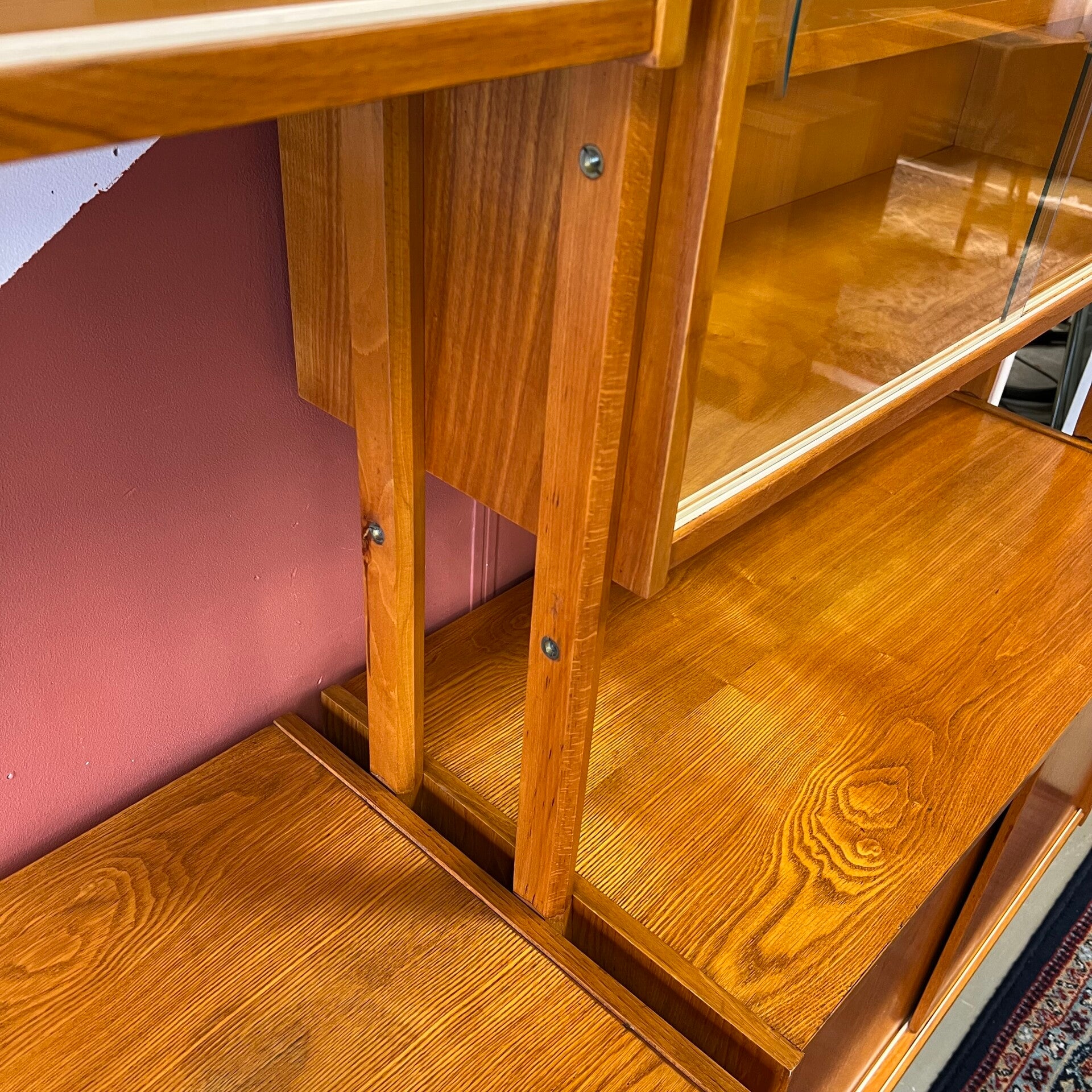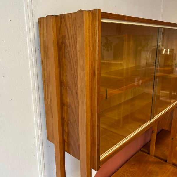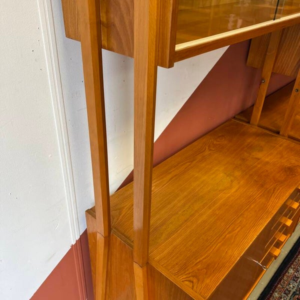 Het deel links heeft bovenin een vitrinekast met glazen schuifruitjes en een uitneembare plank. Onderin een gesloten kast met slot (sleutel aanwezig), uitneembare plank en 5 ruime lades met originele kunststof binnenzijde.