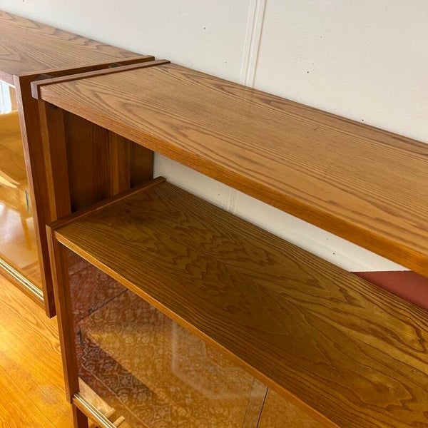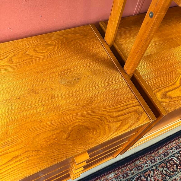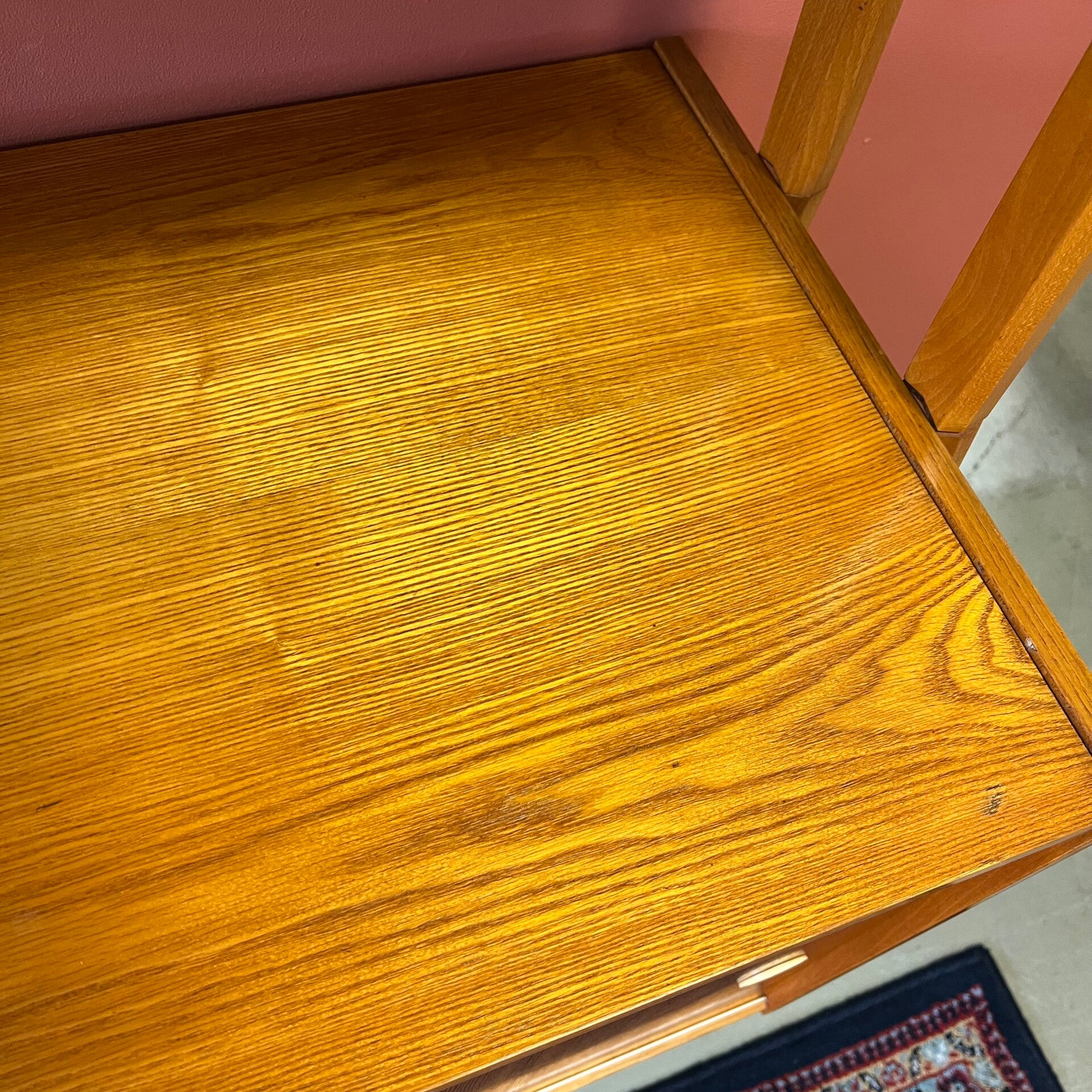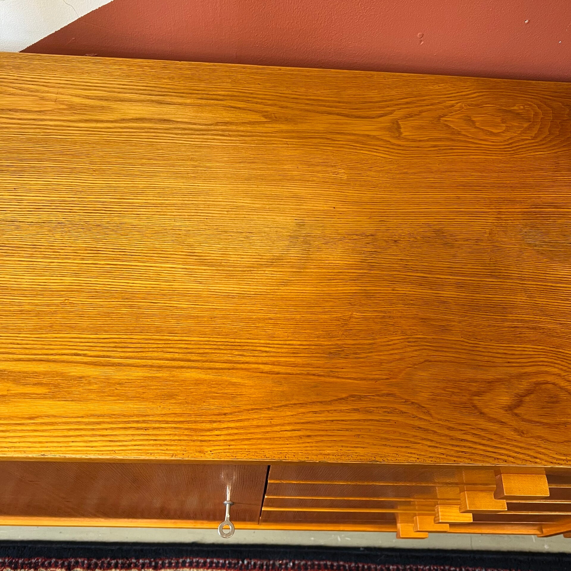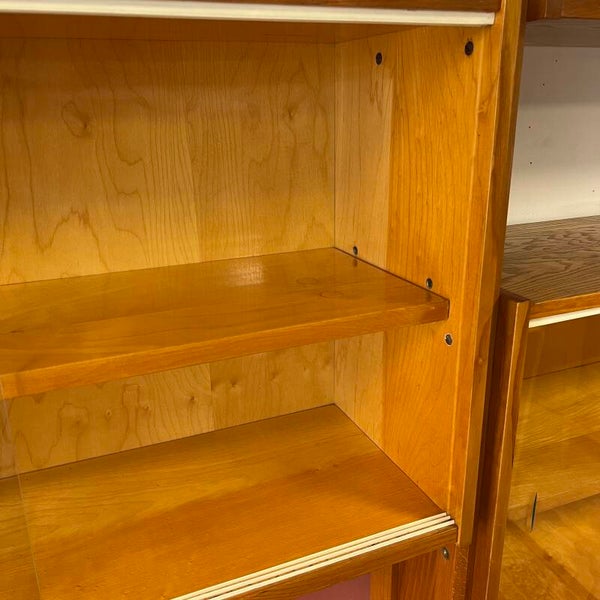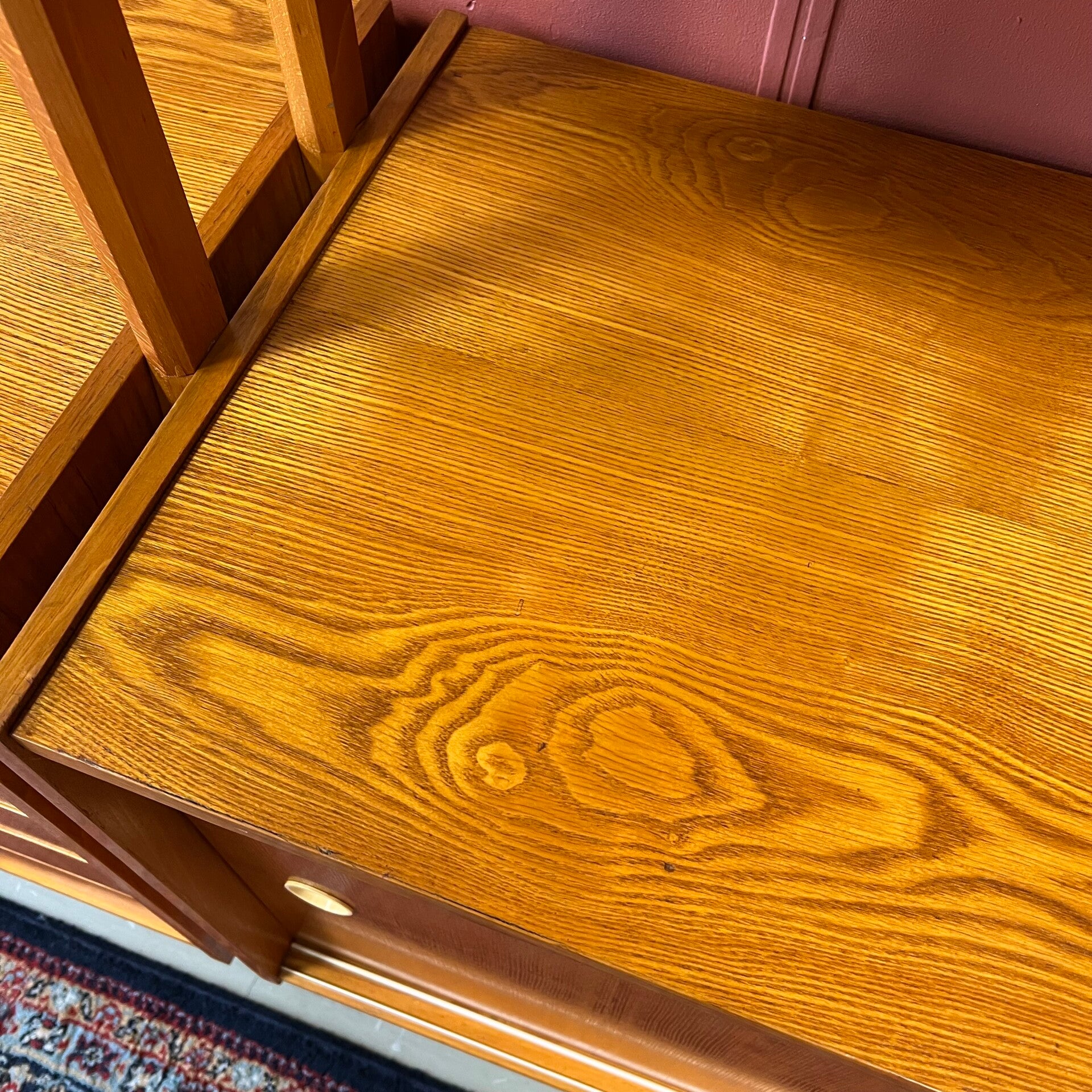 Het deel links heeft bovenin een vitrinekast met glazen schuifruitjes en een uitneembare plank. Onderin een gesloten kast met slot (sleutel aanwezig), uitneembare plank en 5 ruime lades met originele kunststof binnenzijde.
