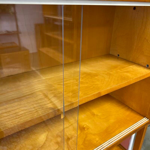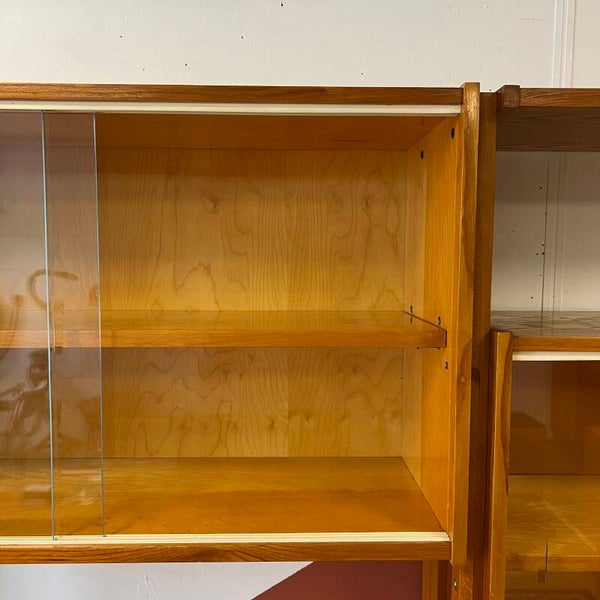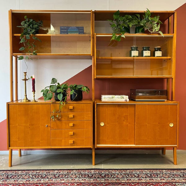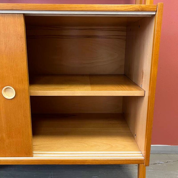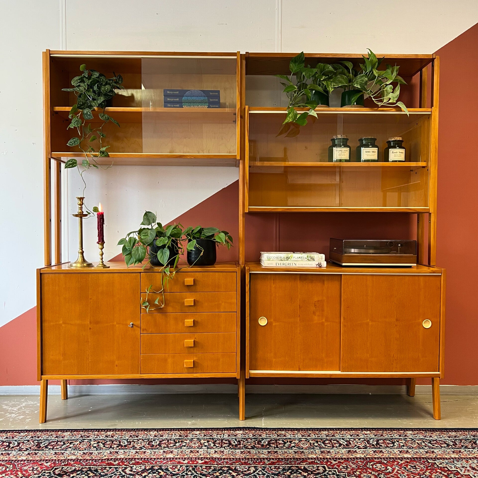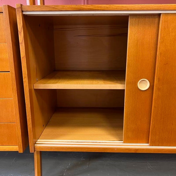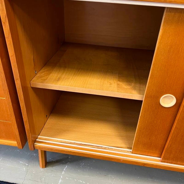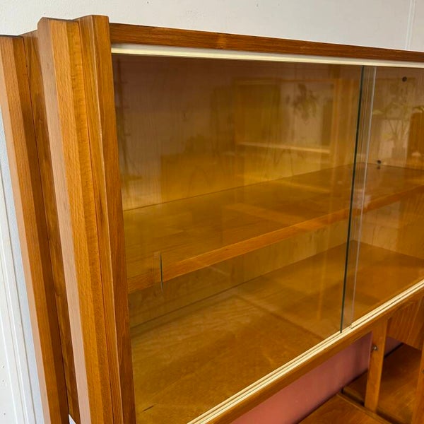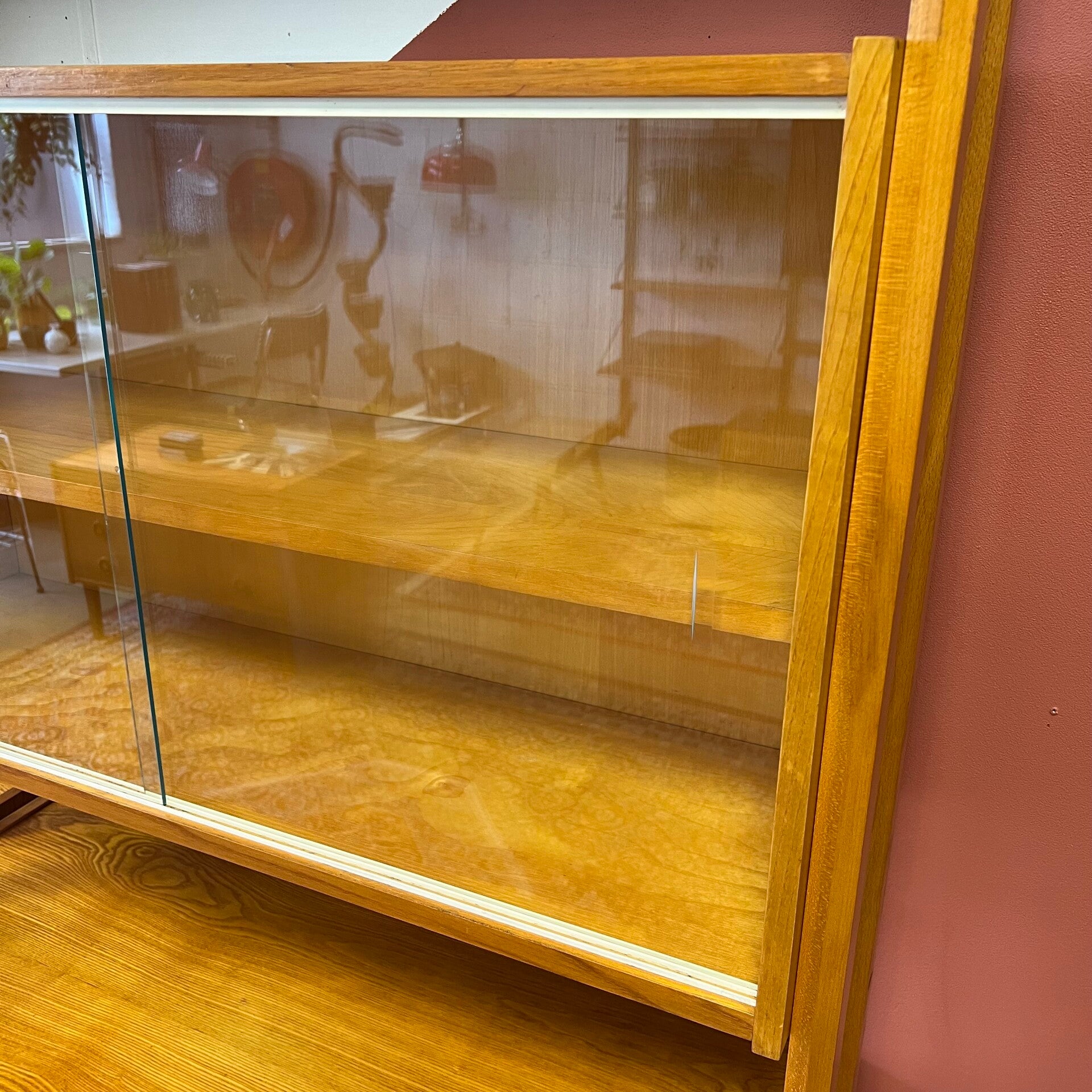 In het midden een vitrinekast met glazen schuifruitjes en een uitneembare plank. Onderin een schuifdeurkast met de originele kunststof handgrepen en uitneembare plank.