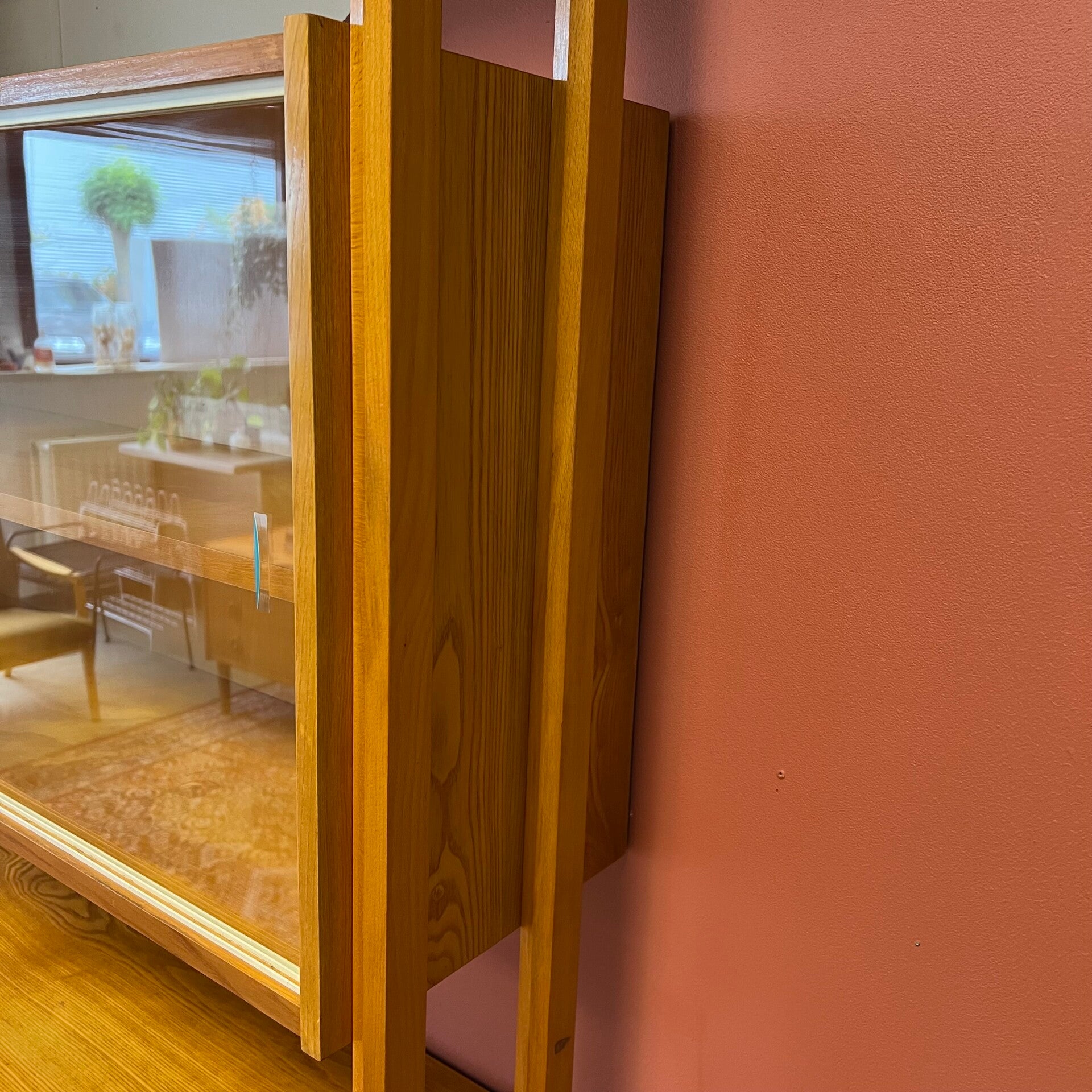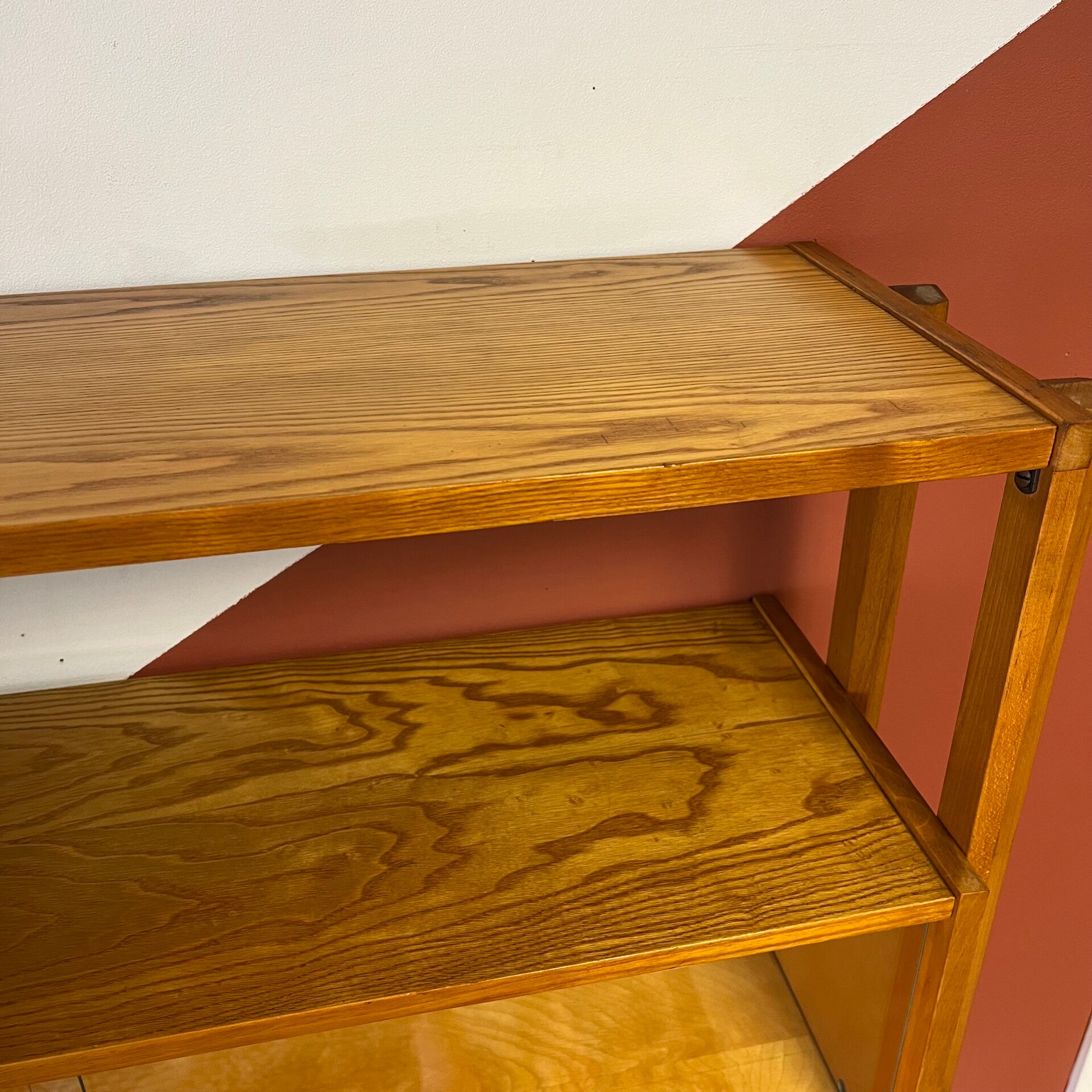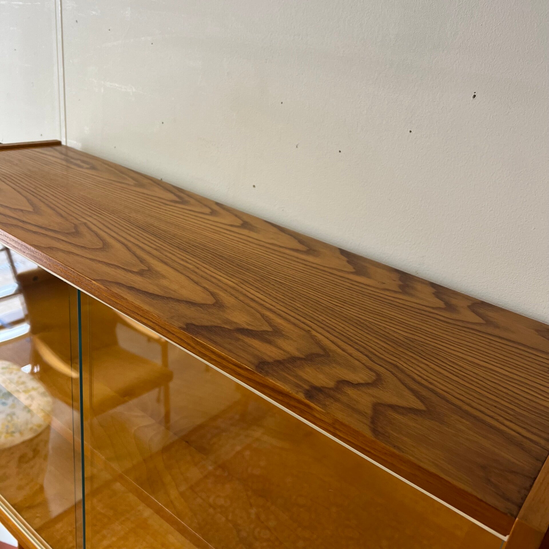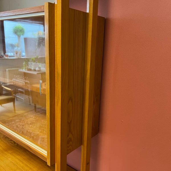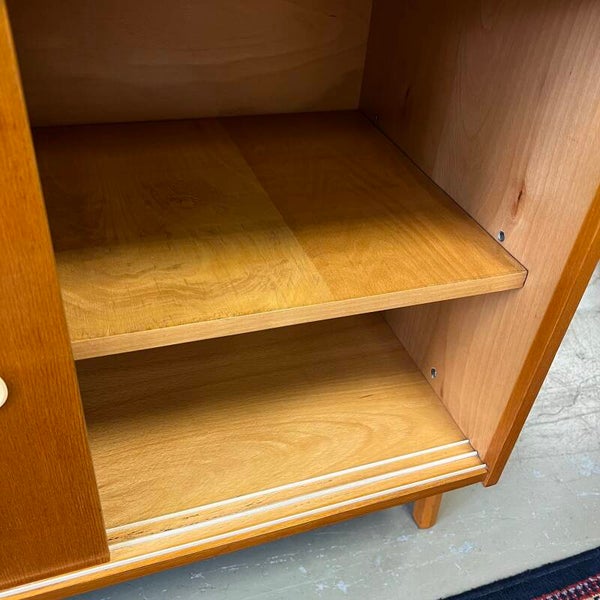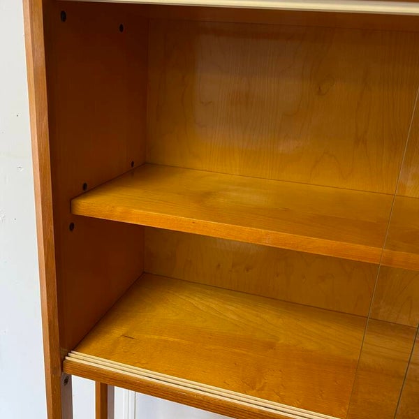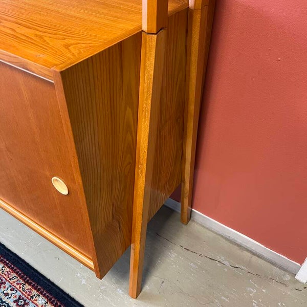 In het midden een vitrinekast met glazen schuifruitjes en een uitneembare plank. Onderin een schuifdeurkast met de originele kunststof handgrepen en uitneembare plank.