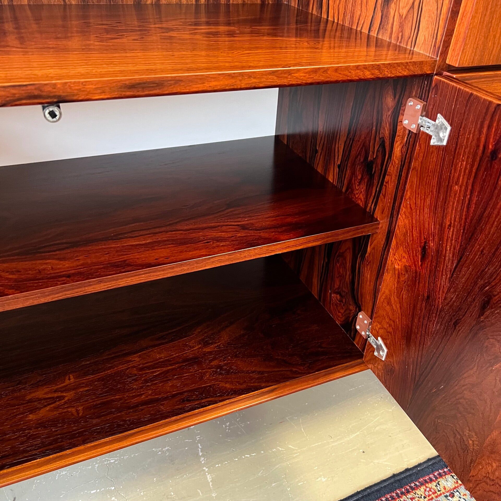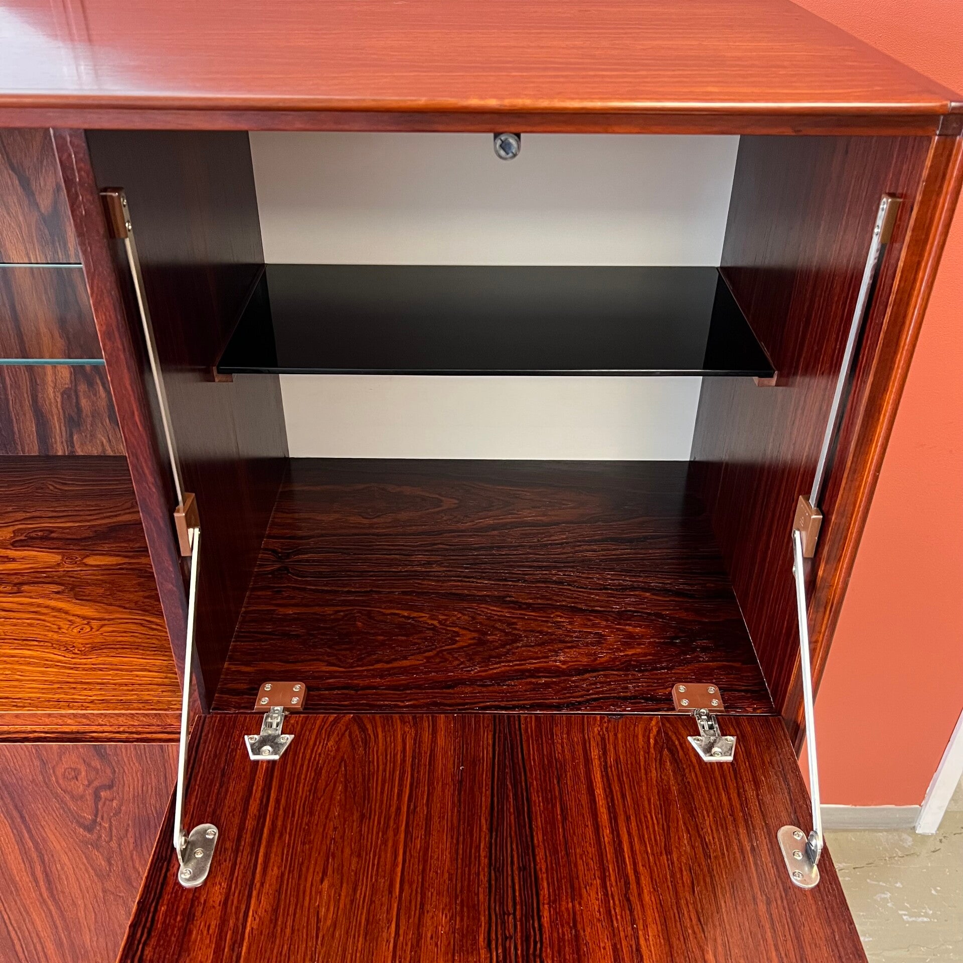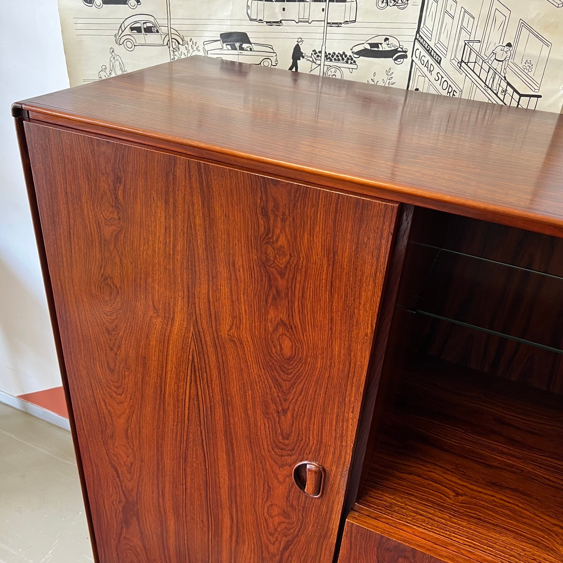 Rechts een klepkast, barkast met zwart glazen plaat. Eronder 4 ruime lades waarvan de bovenste met vakverdeling en vilt (oorspronkelijke bestemming-, zilverlade).