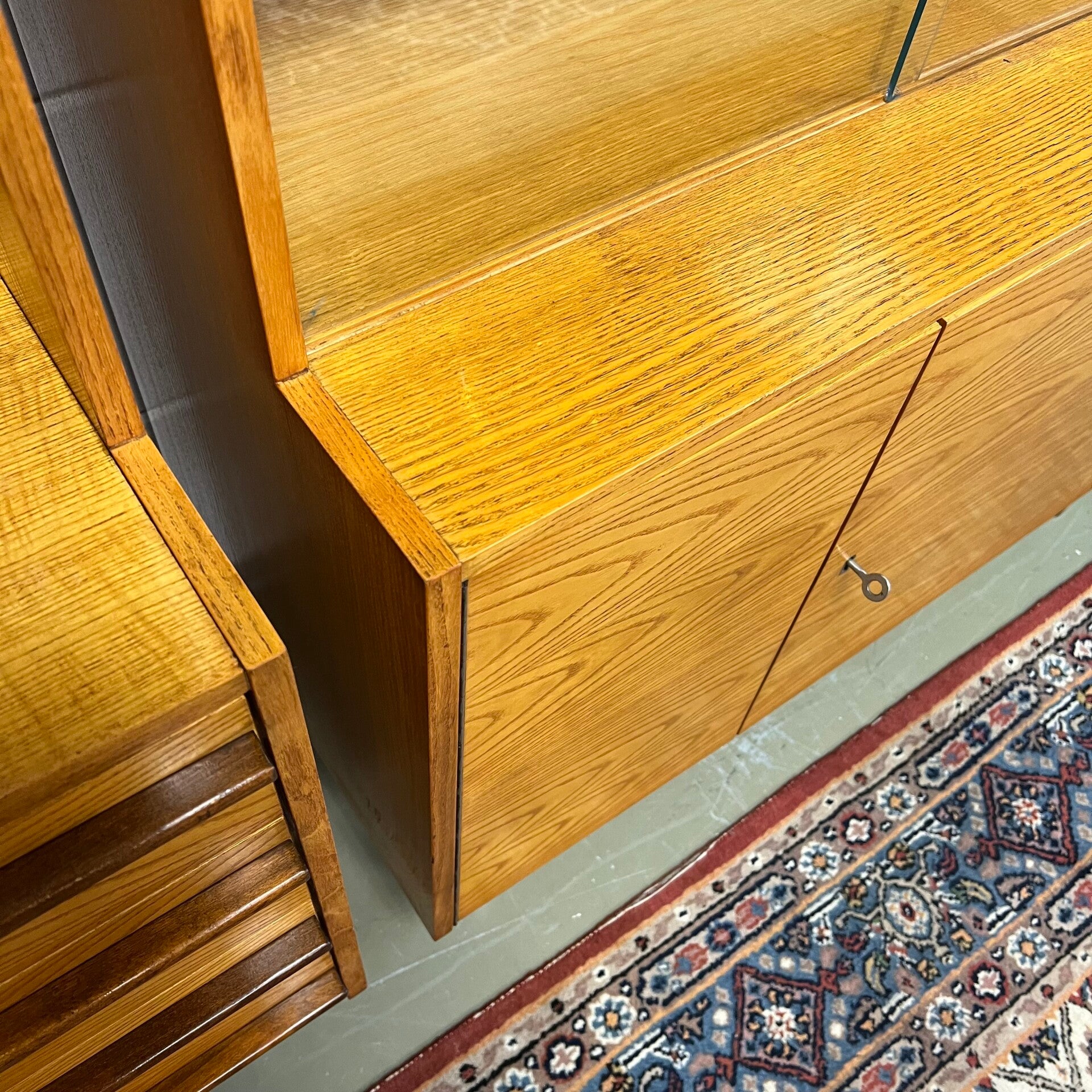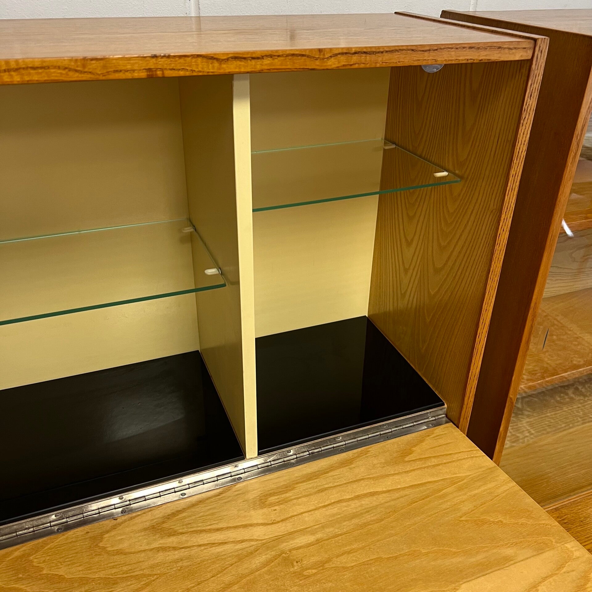 Bovenin een klepkast, barkast met slot (sleutel aanwezig). Uitneembare glazen platen.