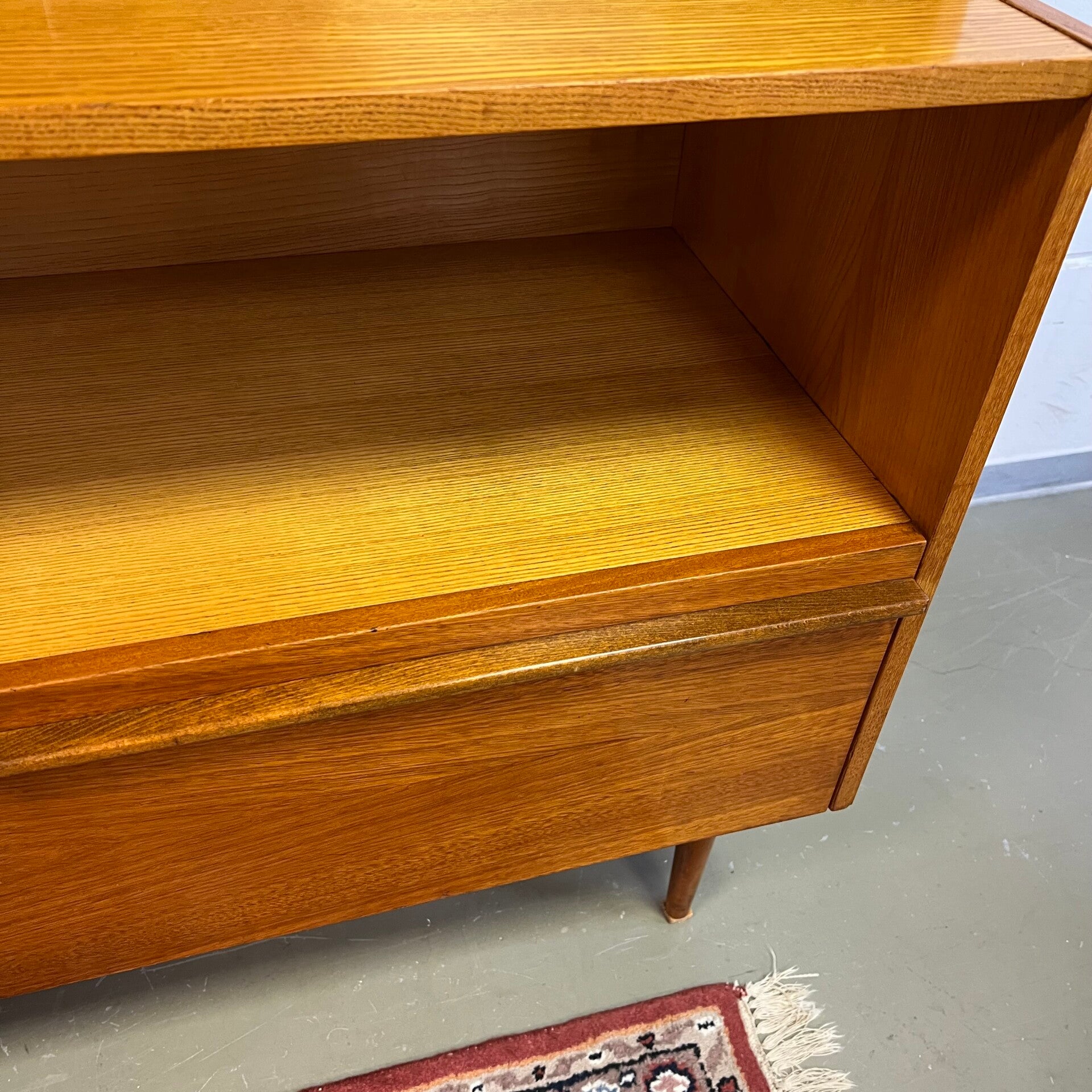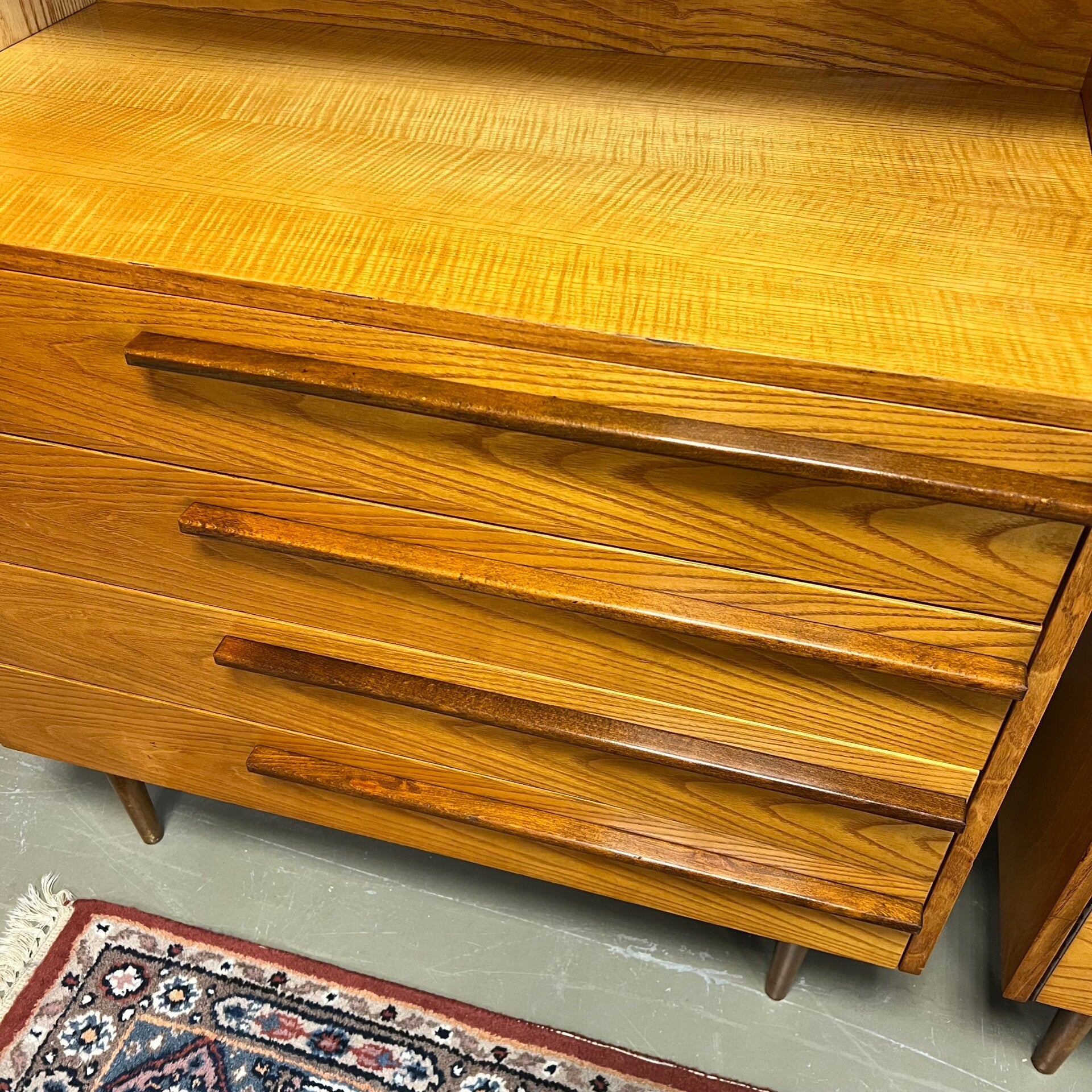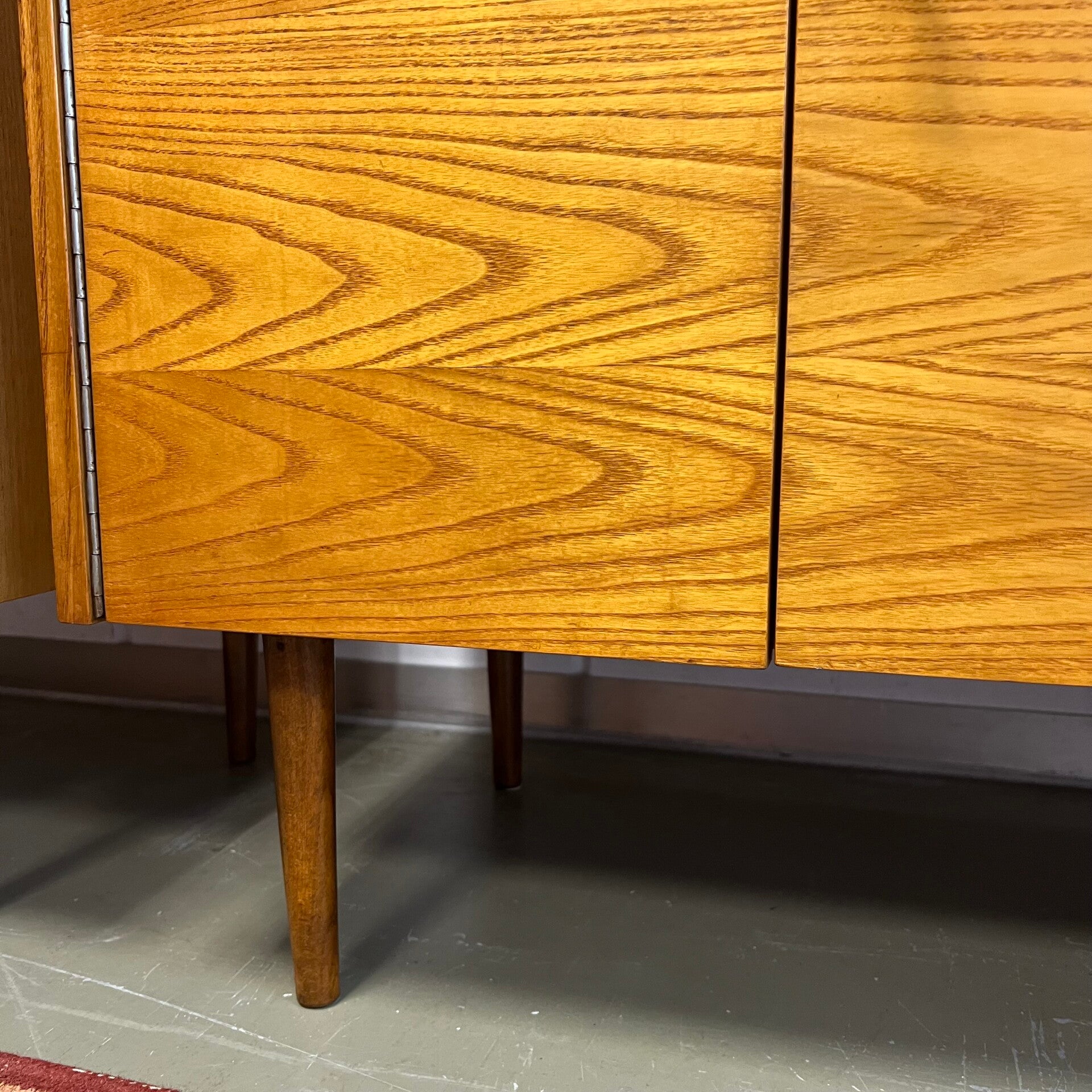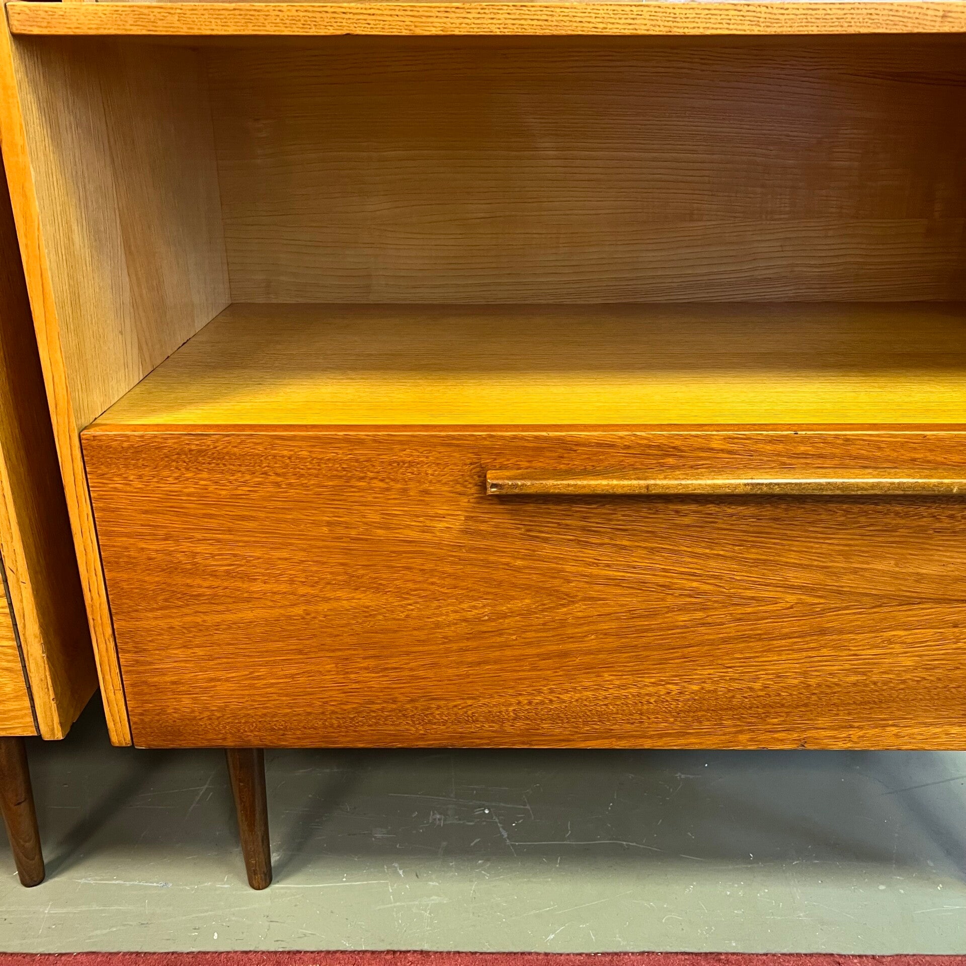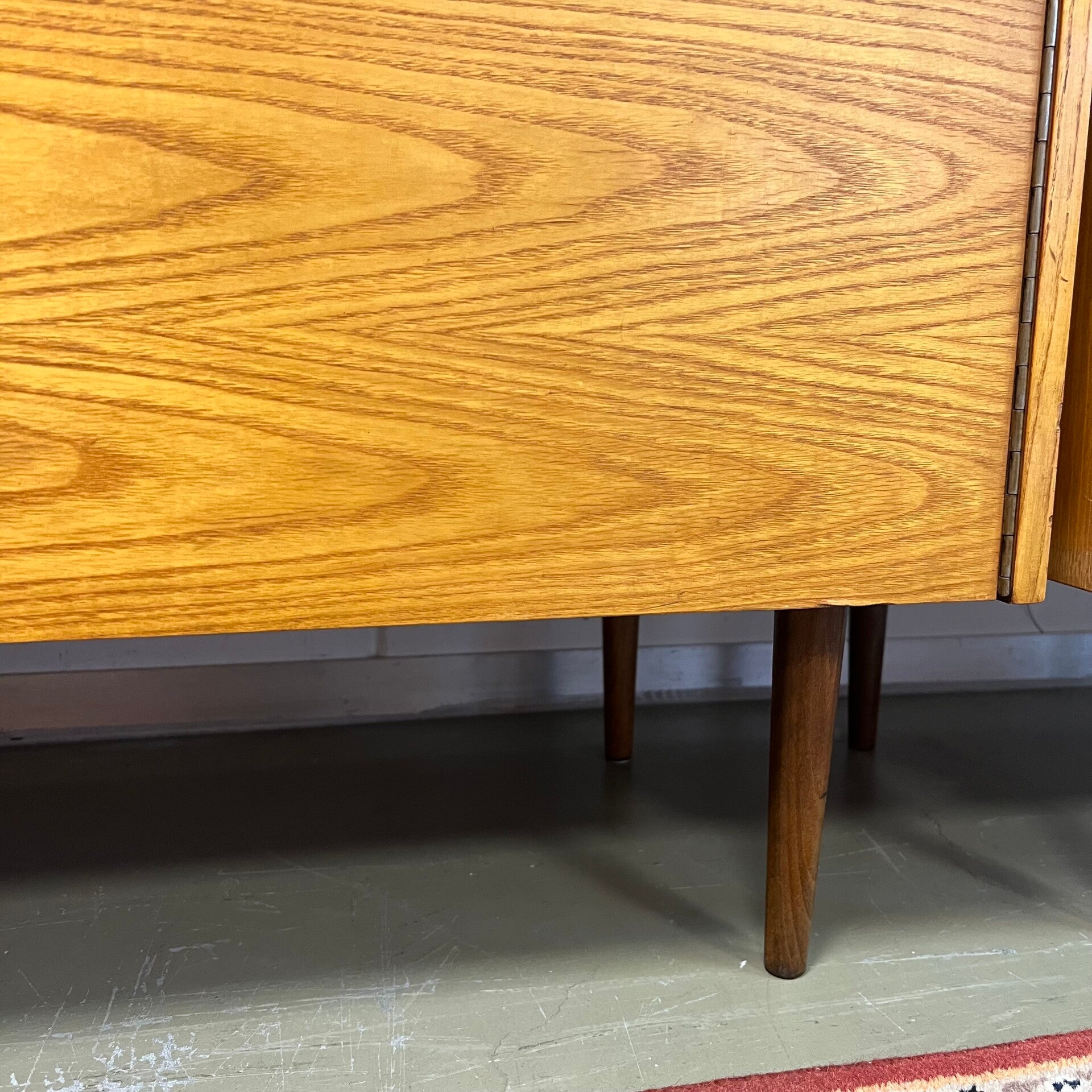 De kasten staan op slanke conische pootjes, deze zijn origineel maar zit wat natuurlijke beweging op.