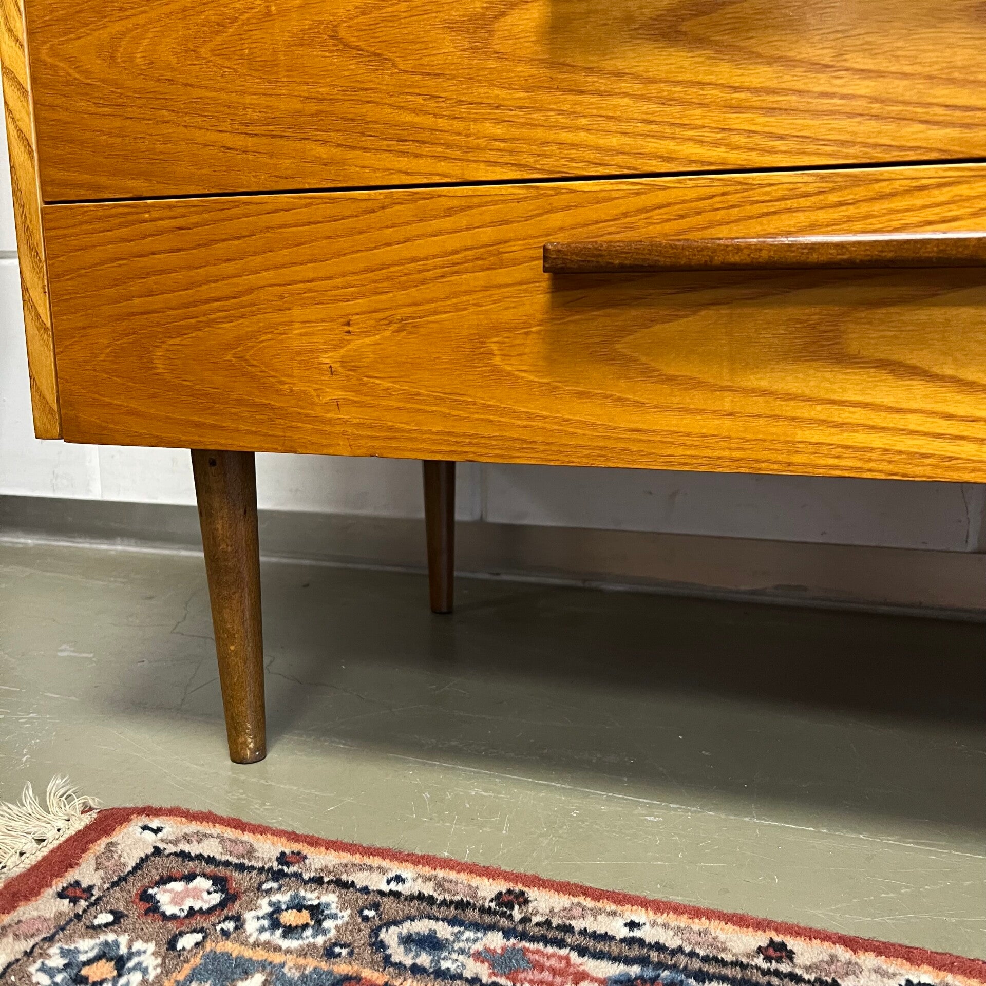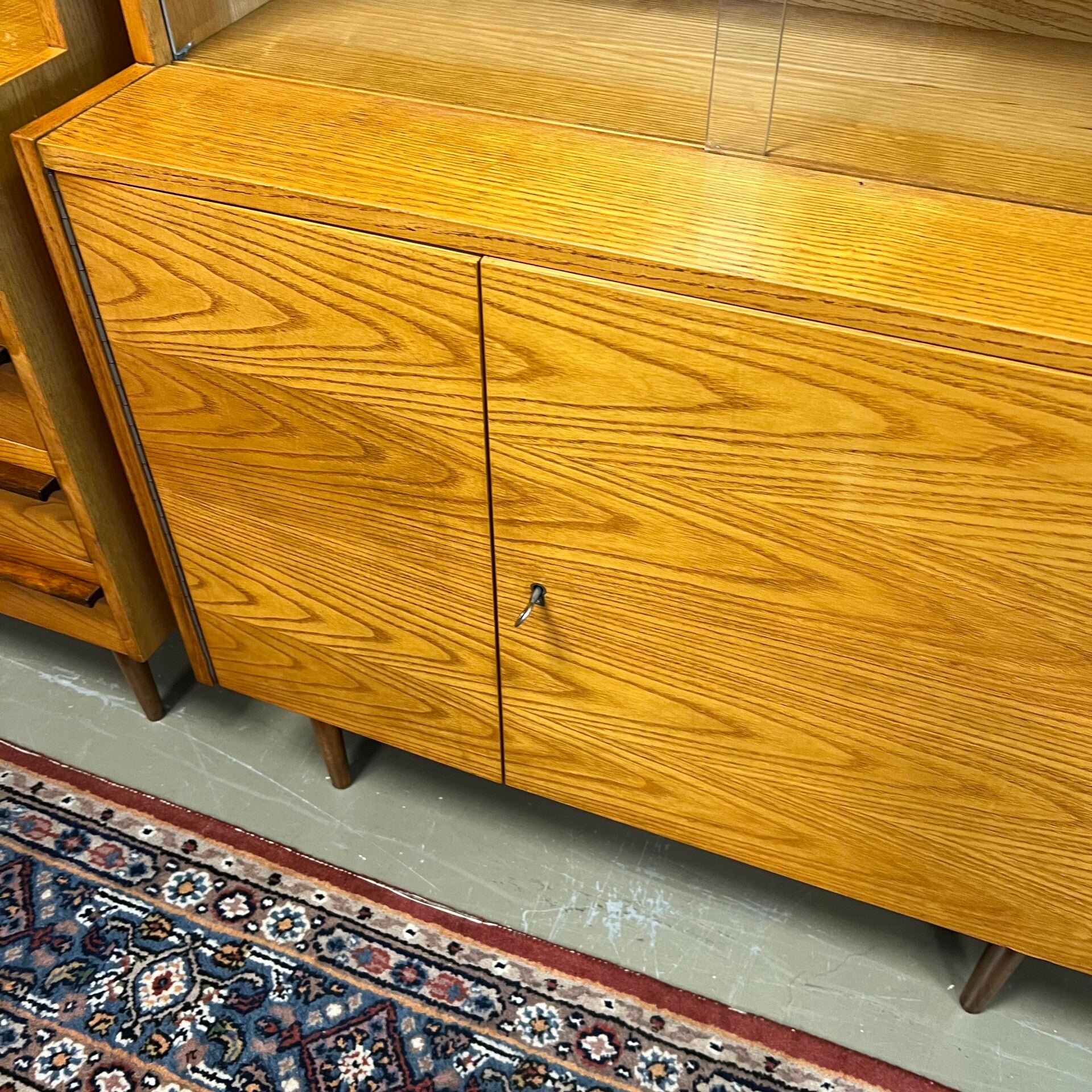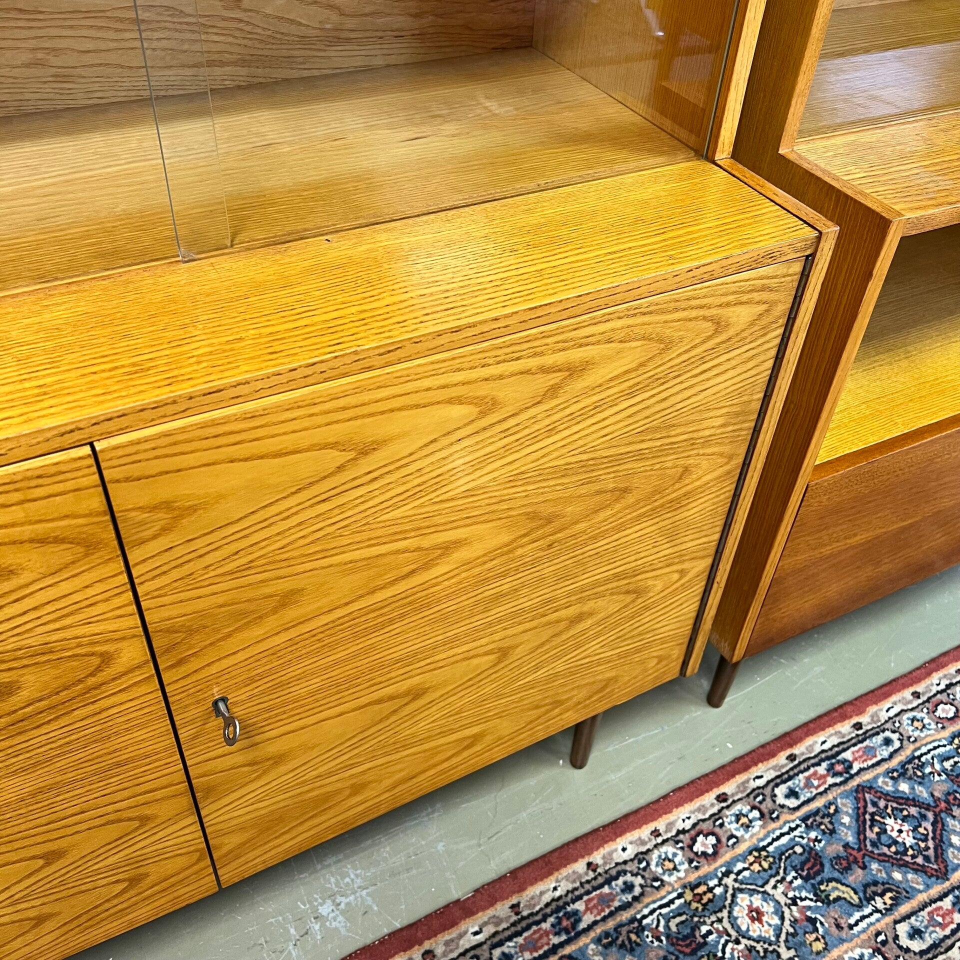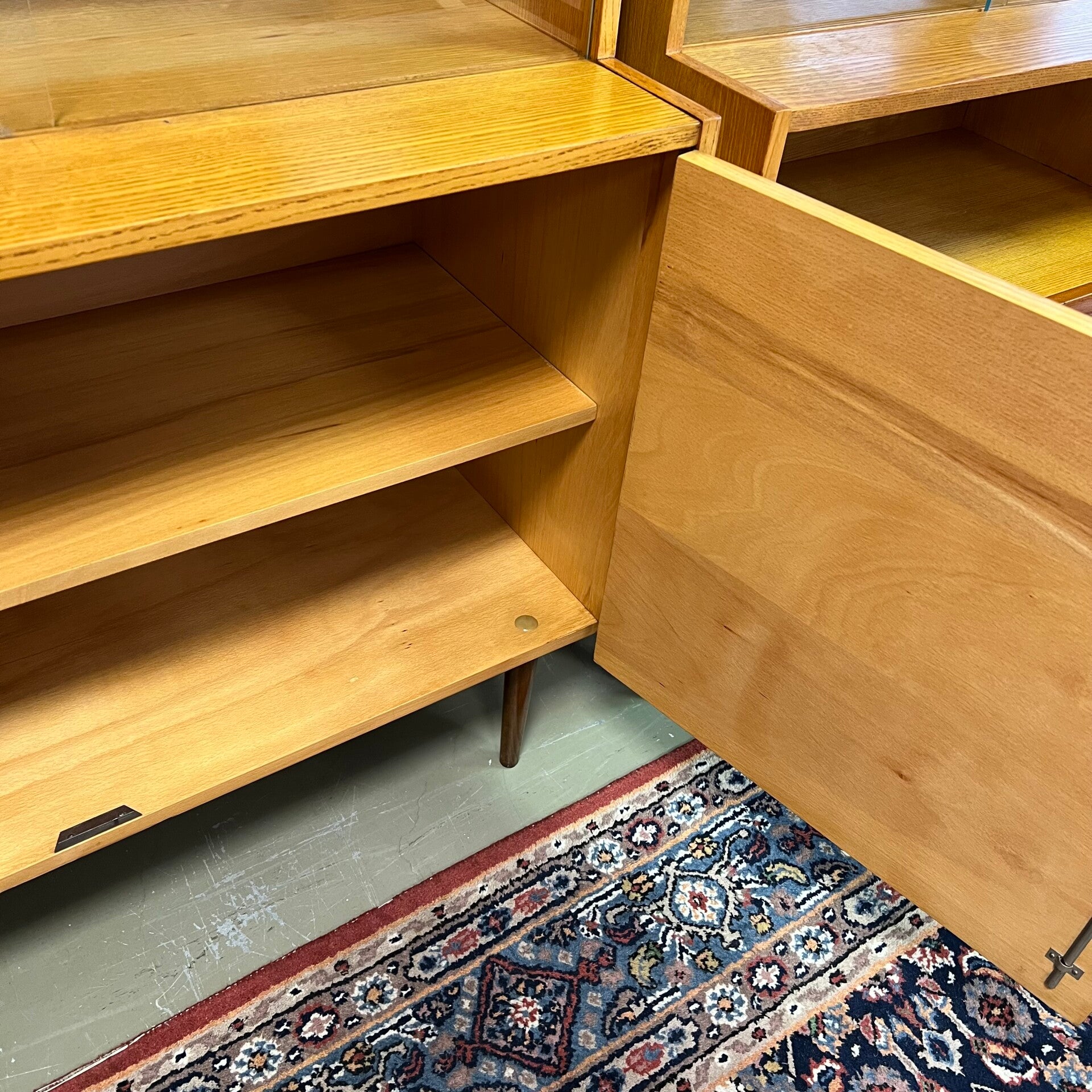 De kasten staan op slanke conische pootjes, deze zijn origineel maar zit wat natuurlijke beweging op.