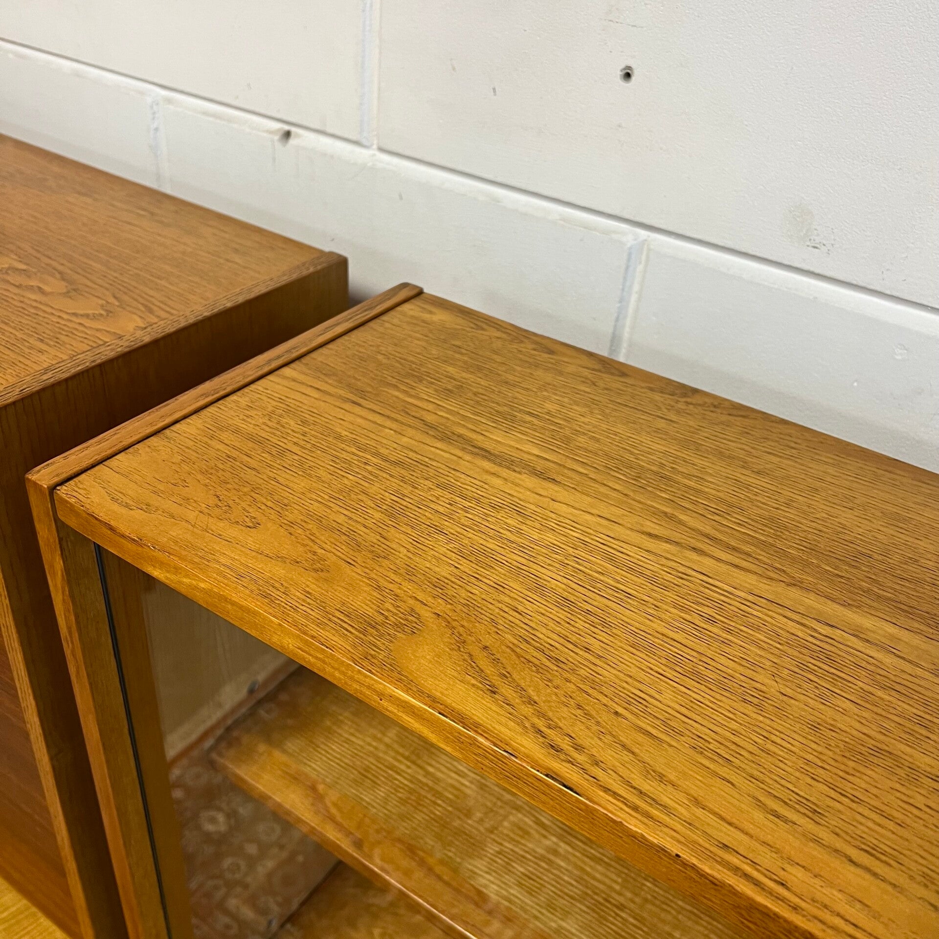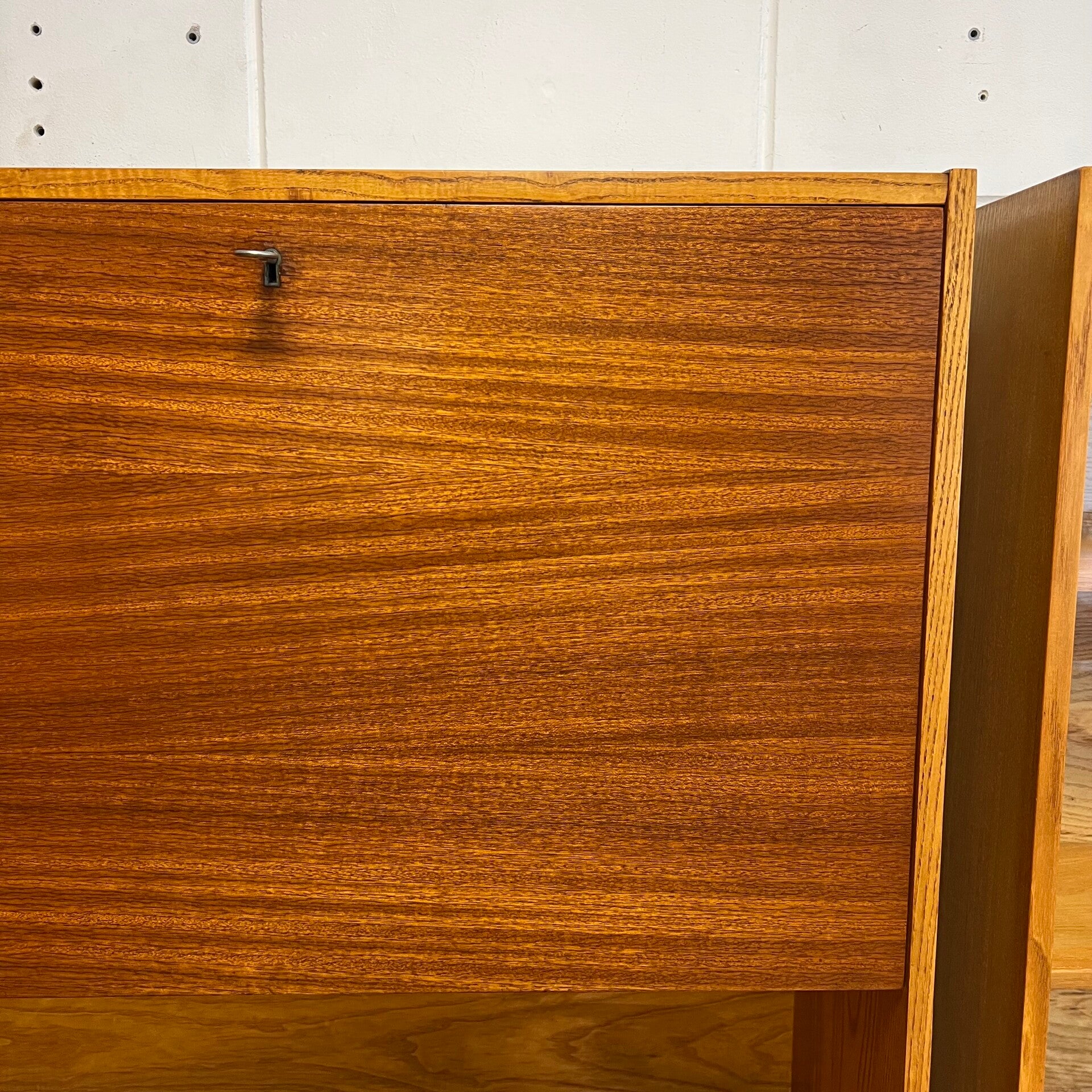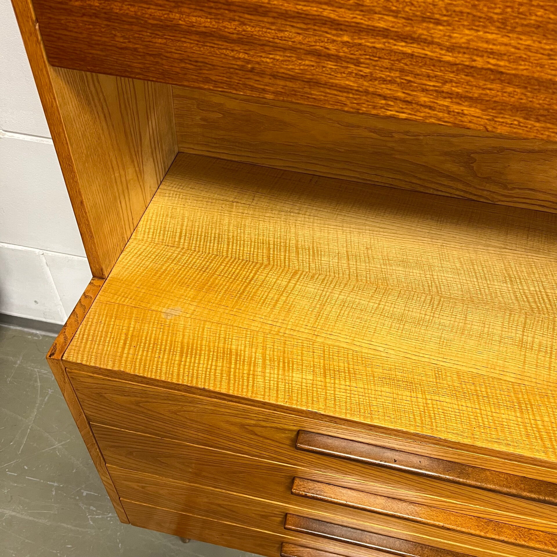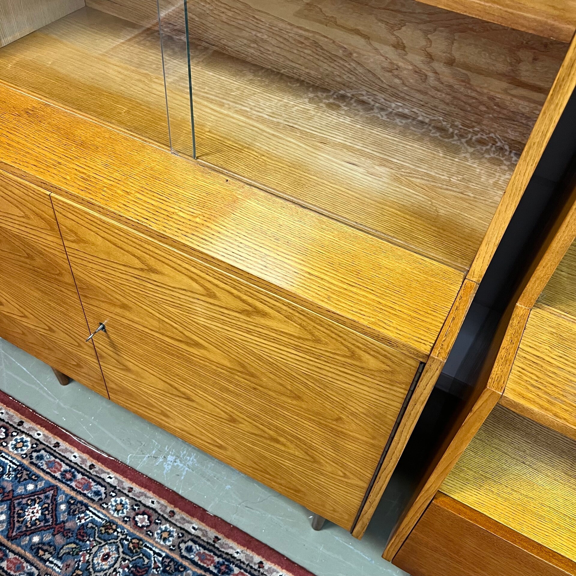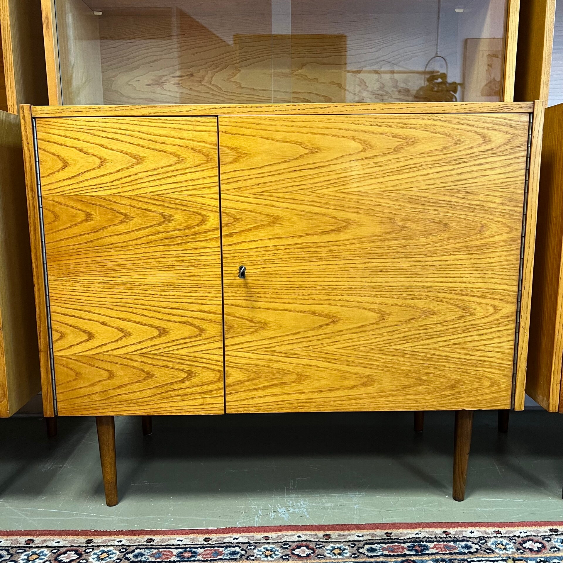 De kasten staan op slanke conische pootjes, deze zijn origineel maar zit wat natuurlijke beweging op.