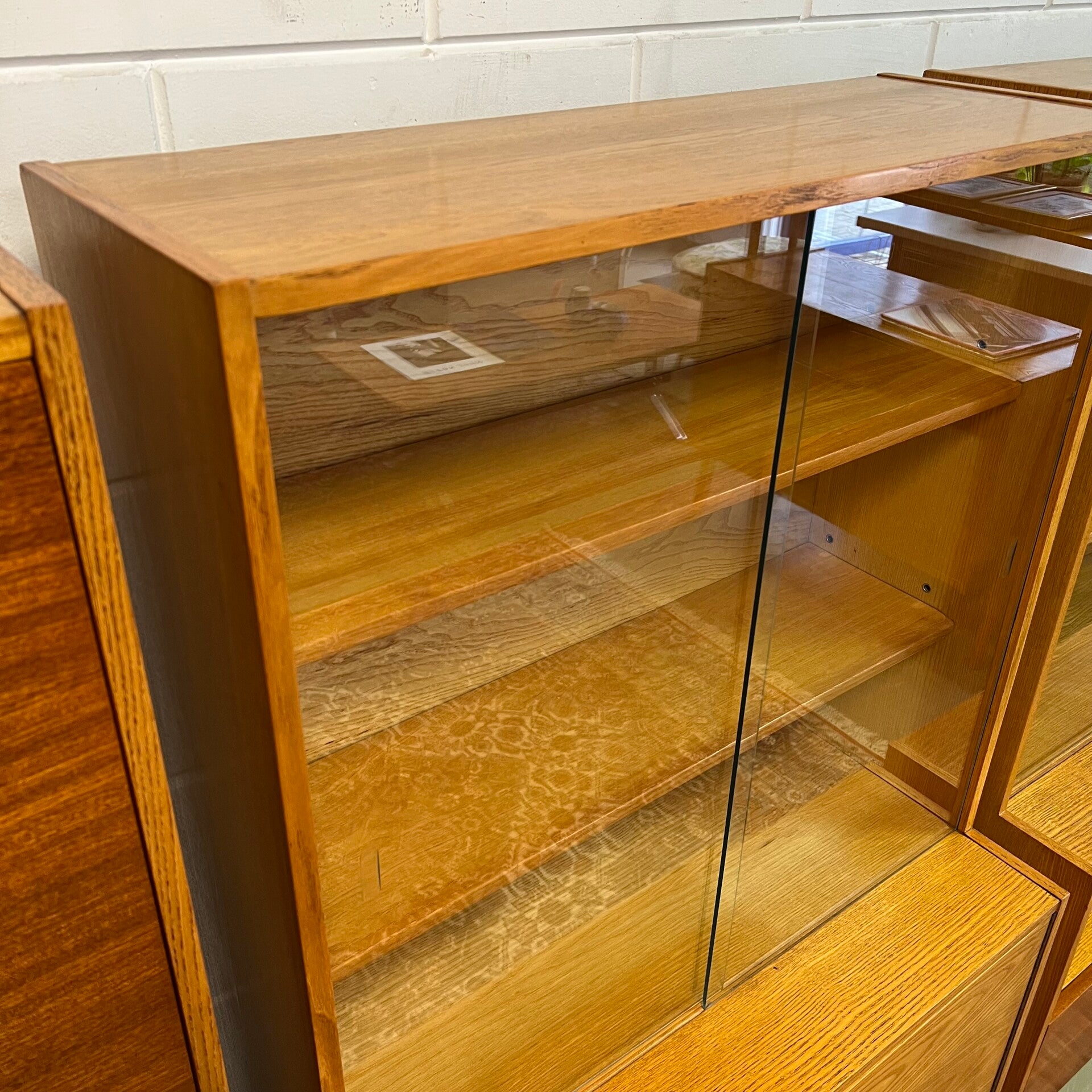 Bovenin een vitrinekast met 2 glazen schuifdeuren en 2 uitneembare planken. De ruitjes missen hier en daar een chip (nauwelijks zichtbaar).