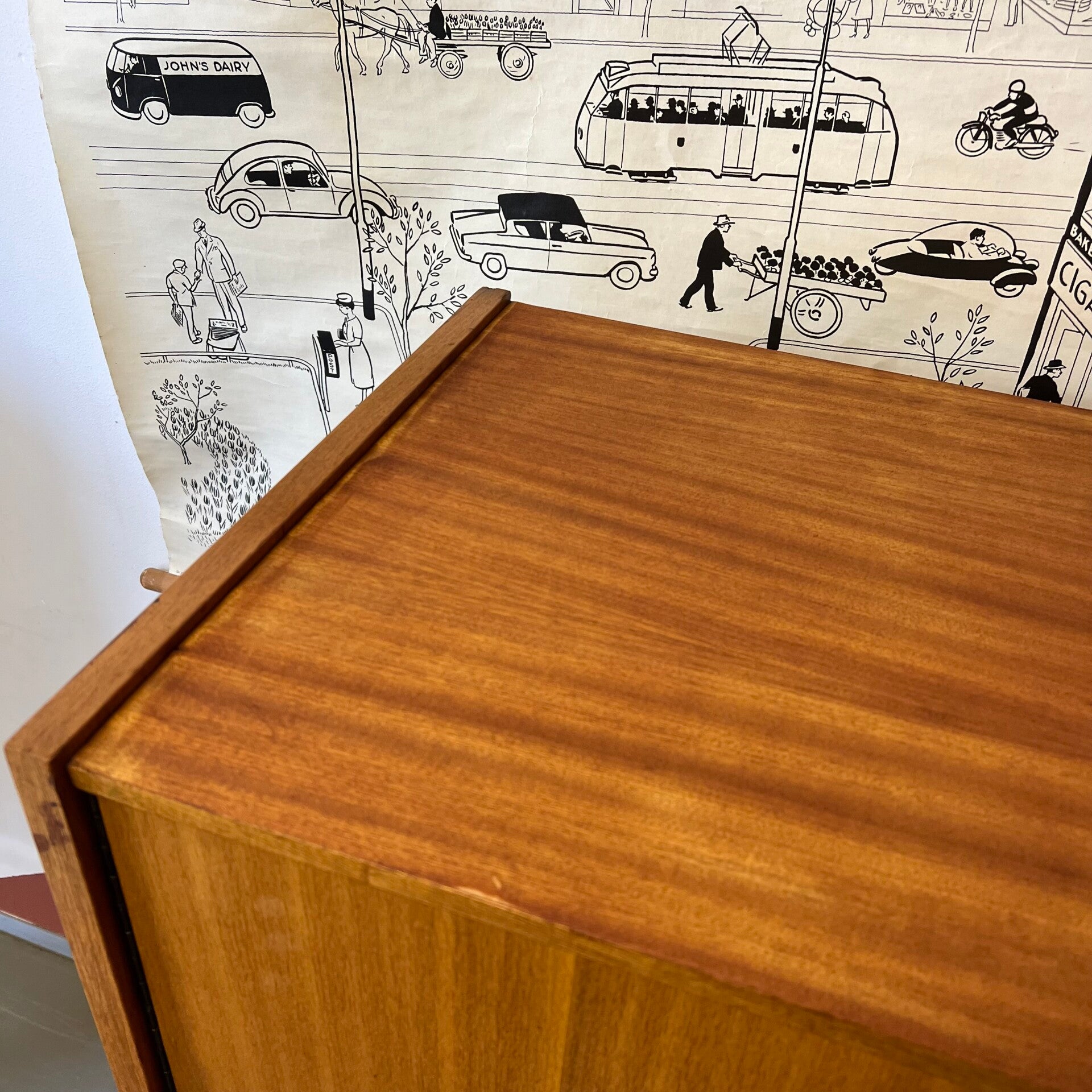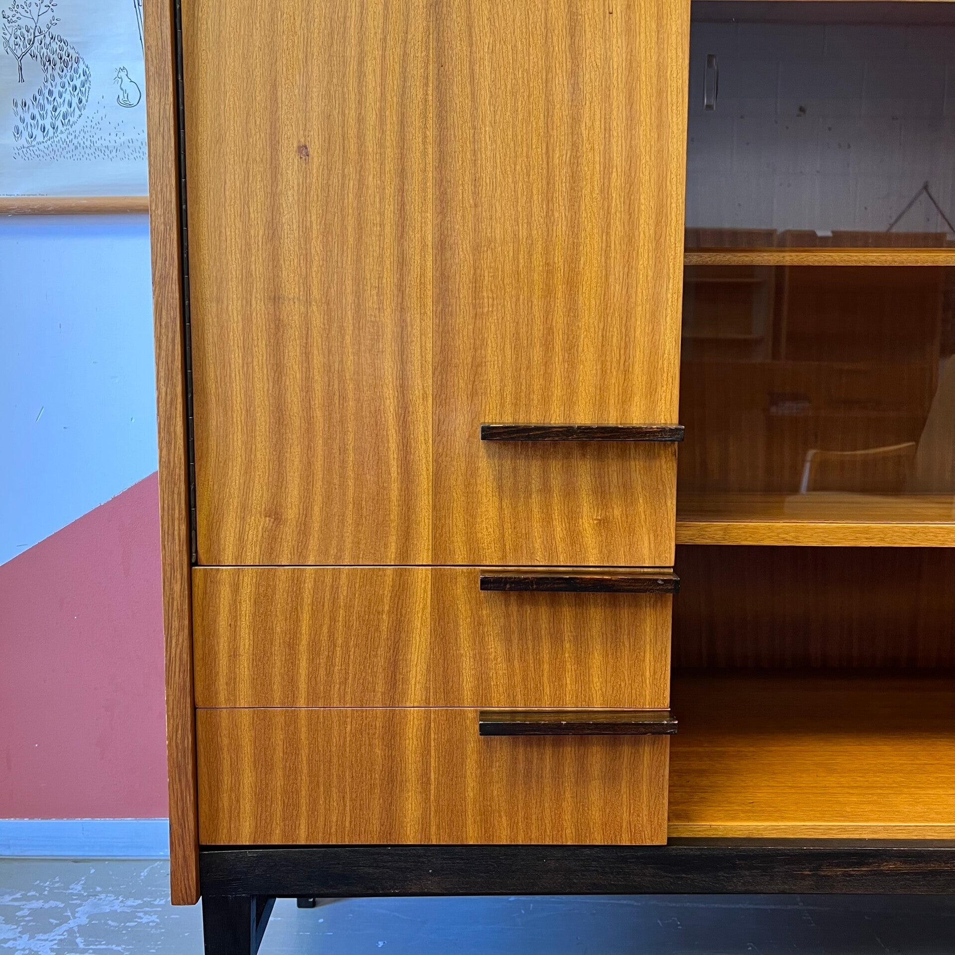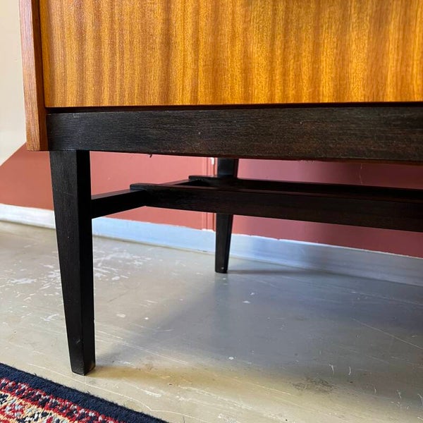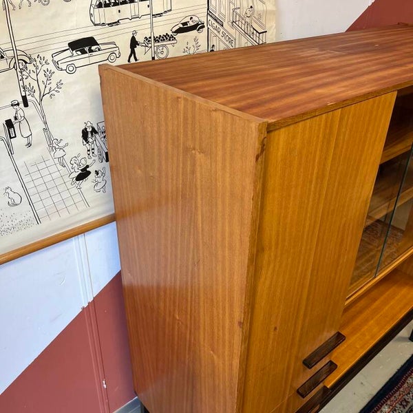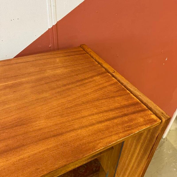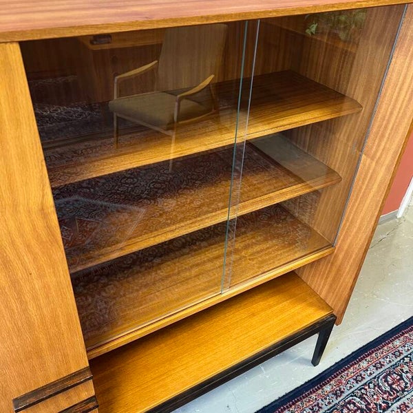 Mooie vitrinekast of buffetkast, uitgevoerd in mahoniehout met donkere contrasterende grepen en poten.