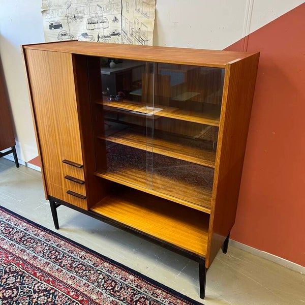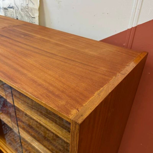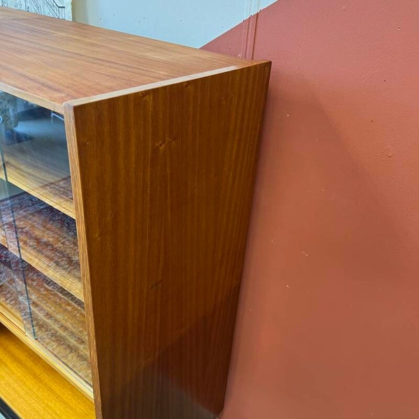 Rechts een glazen vitrinedeel met 2 glazen schuifdeuren (enkele chipjes) en 2 uitneembare planken.