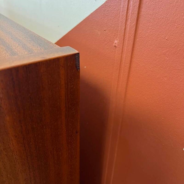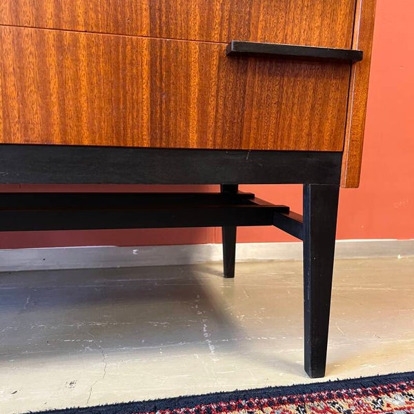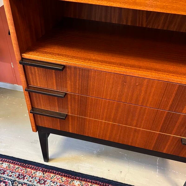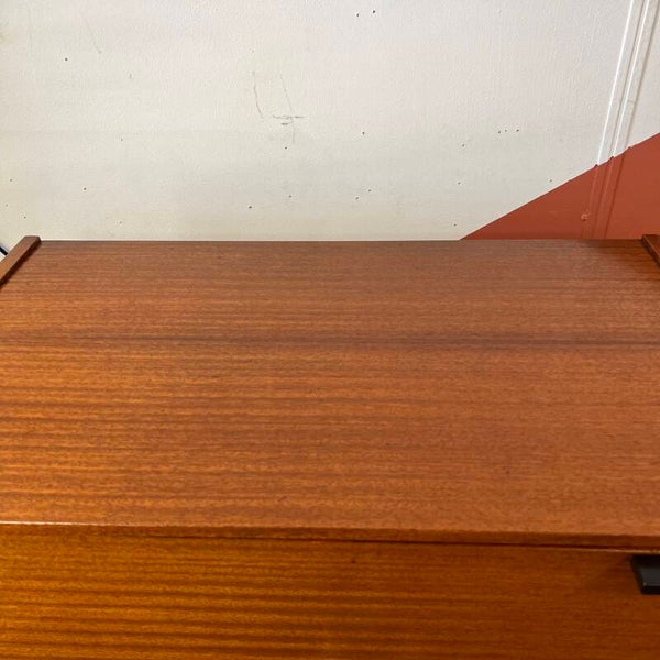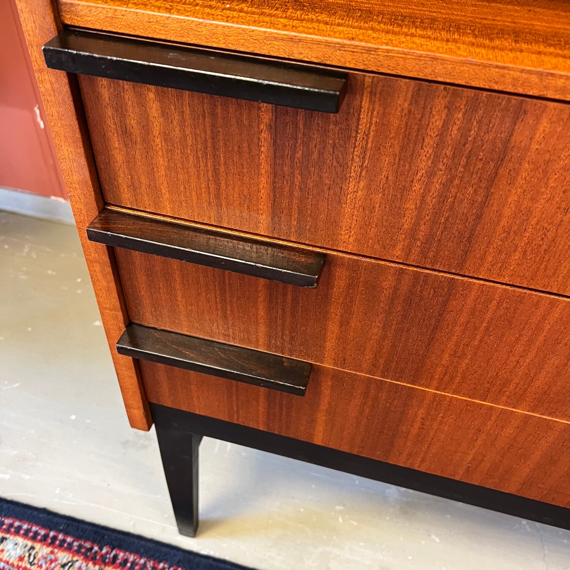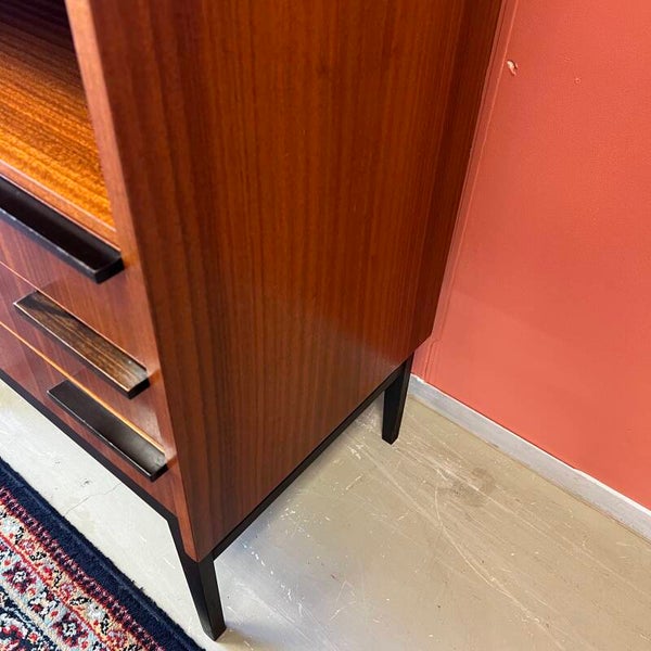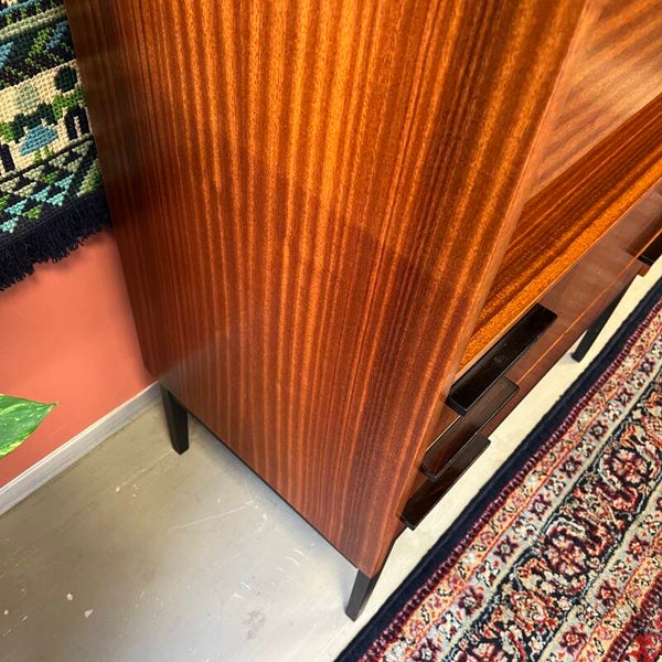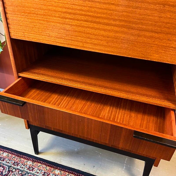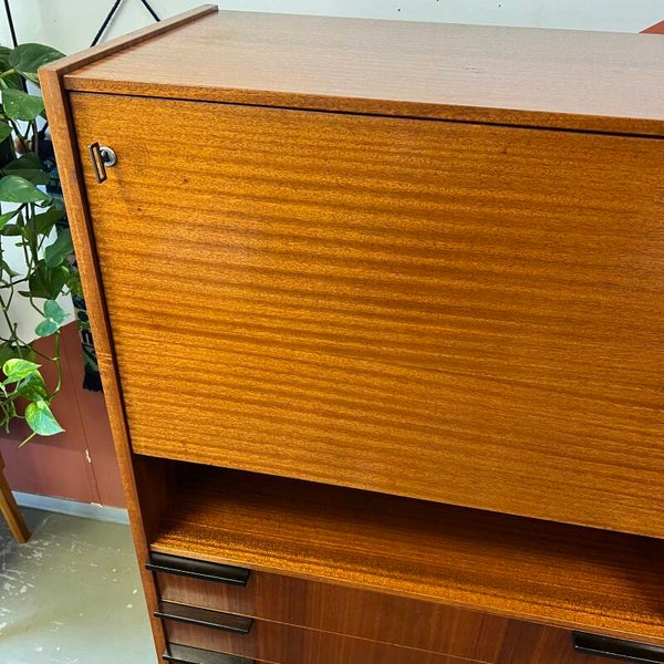 Mooie vintage secretaire of klepkast, uitgevoerd in mahoniehout/essenhout (fineer) met leuke contrasterende handgrepen en poten.