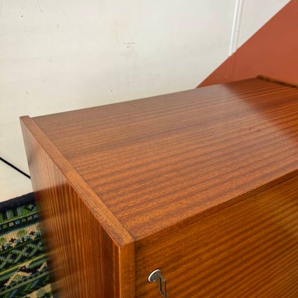 Het meubel heeft bovenin een klep met slot (sleutel aanwezig). Erachter een bureau gedeelte met vakkenplank.