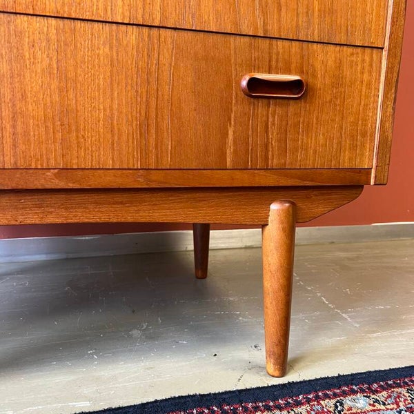 Uitgevoerd in teak (fineer) met organische vormen en handgrepen.
