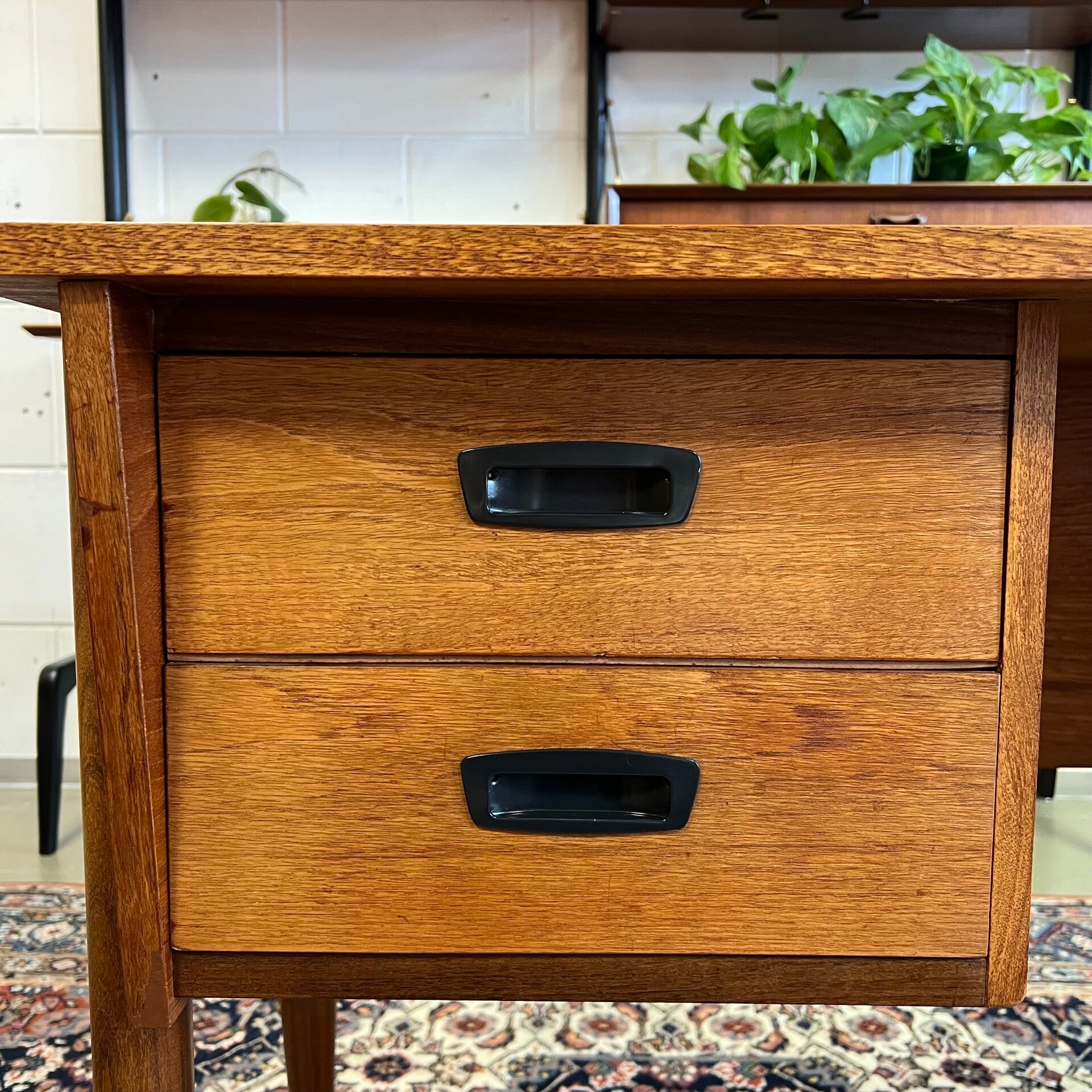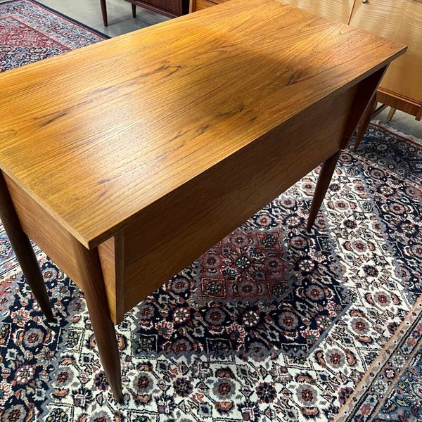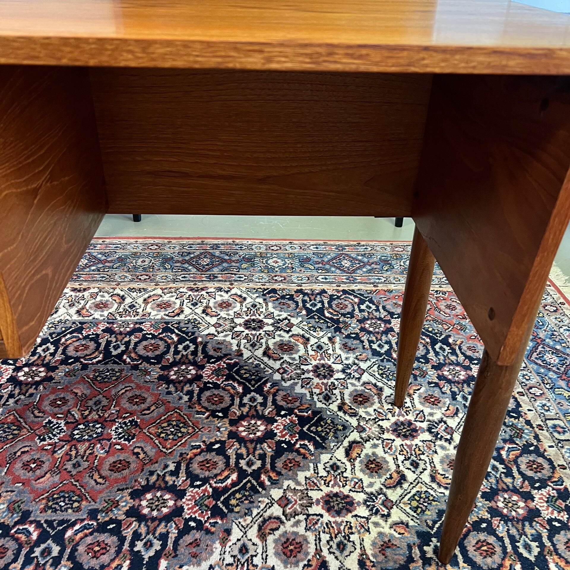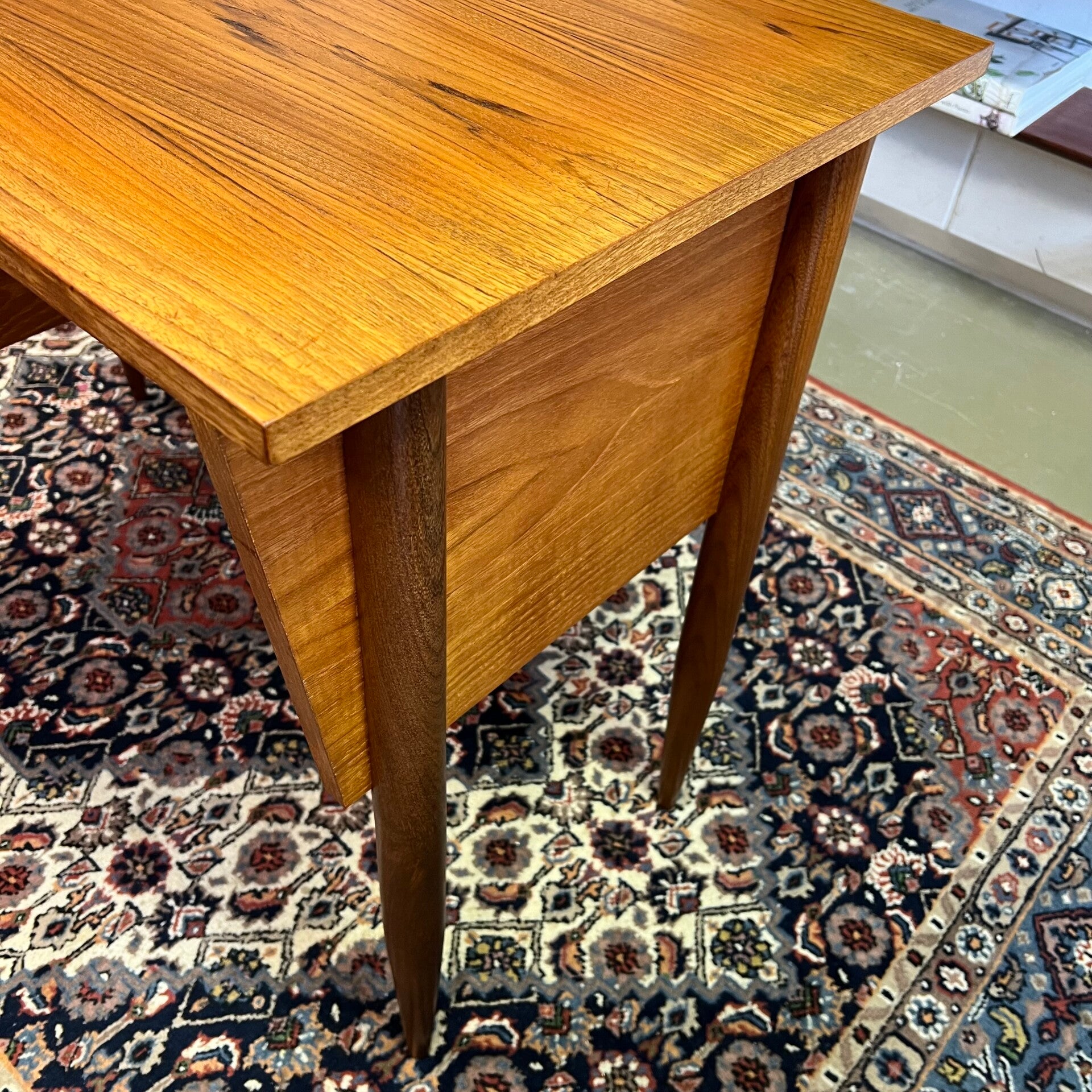 Leuk vintage teakhouten bureau (fineer) met elegante conische poten en ingelegde zwarte handgrepen.