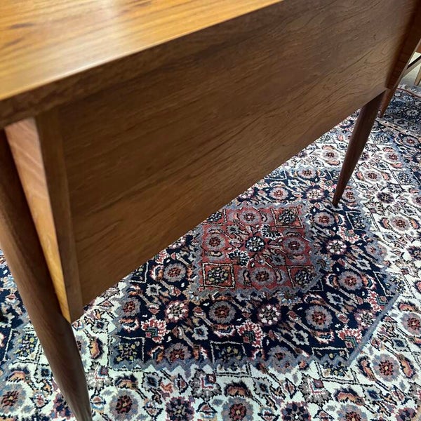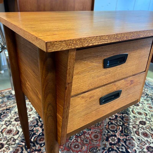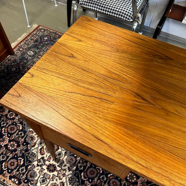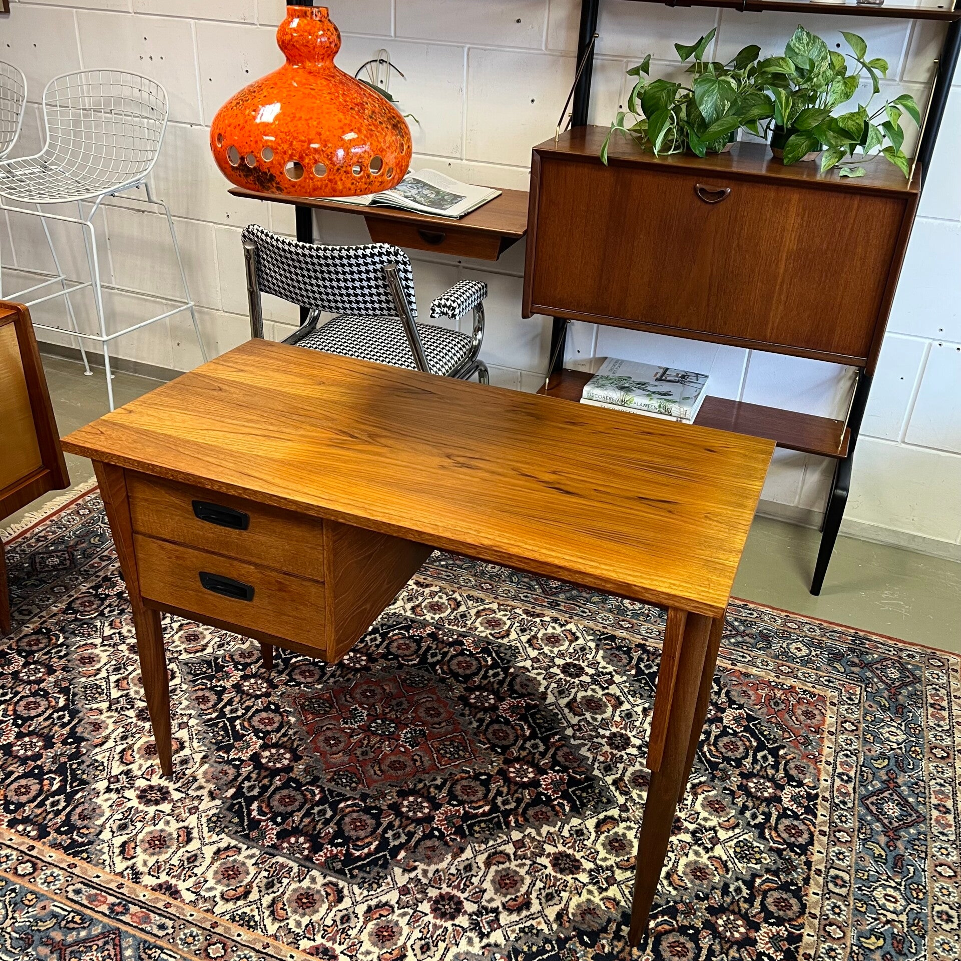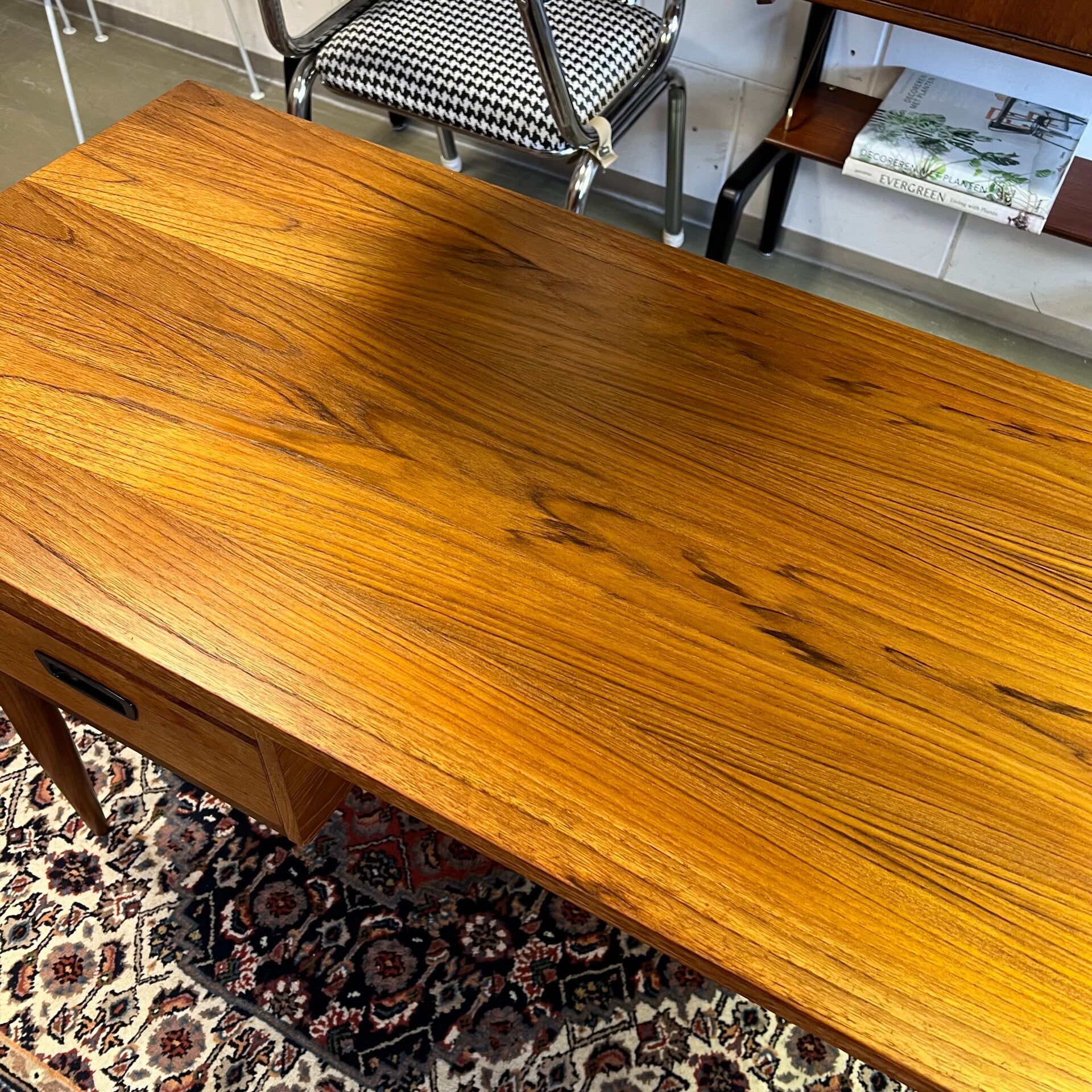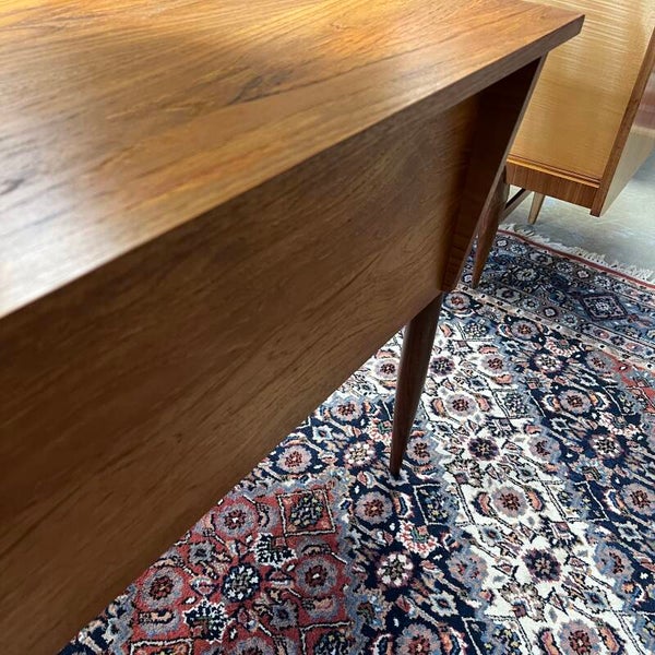 Leuk vintage teakhouten bureau (fineer) met elegante conische poten en ingelegde zwarte handgrepen.