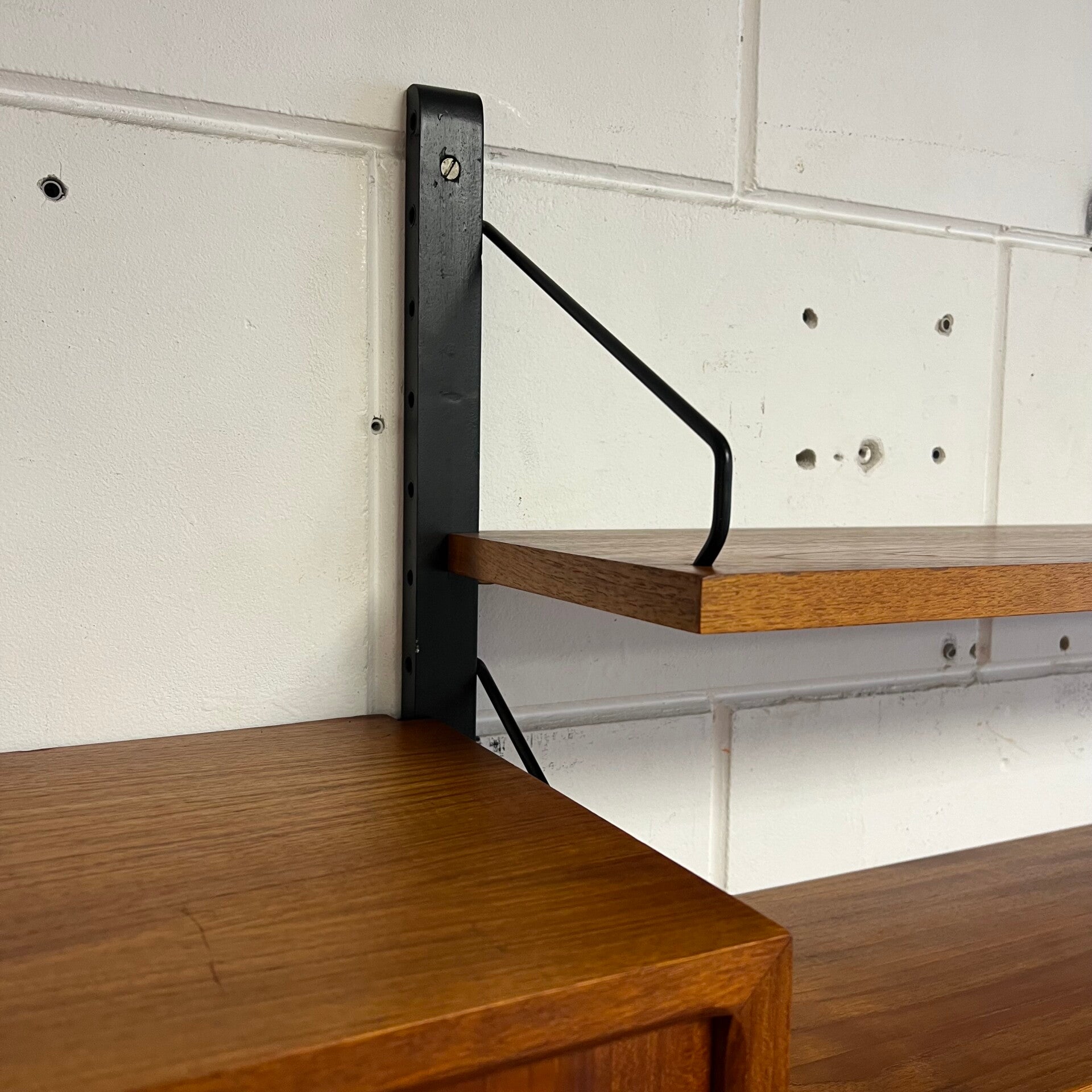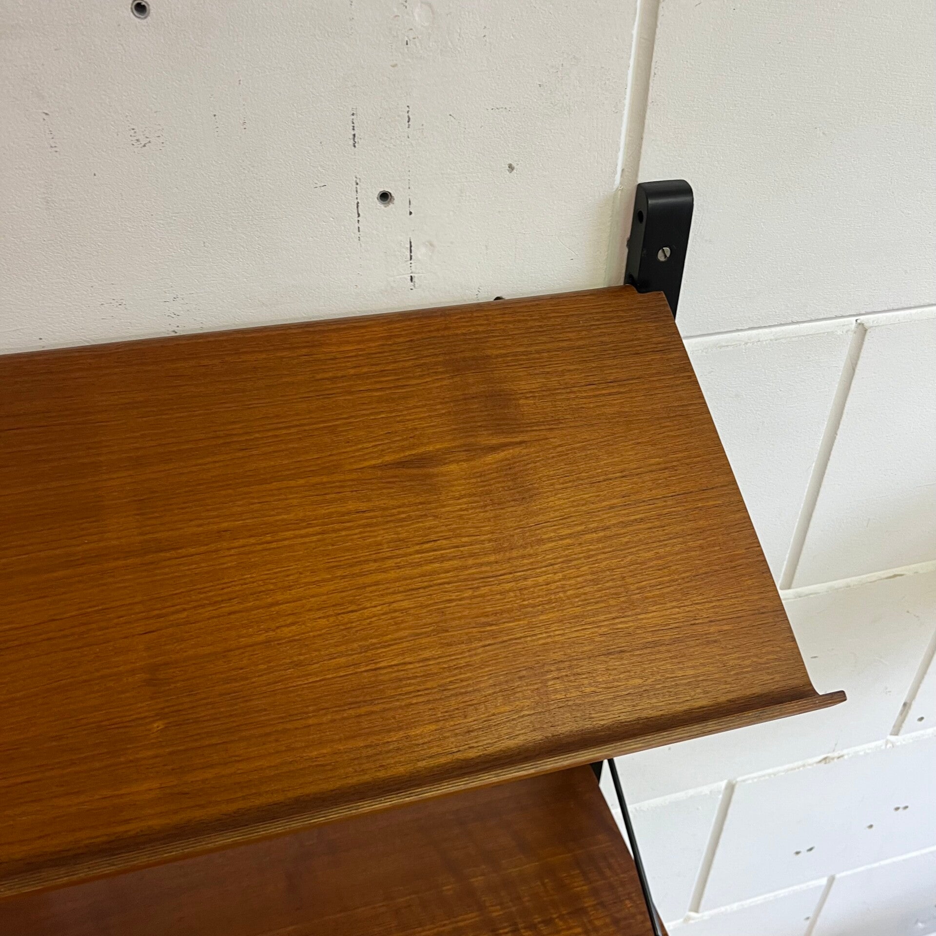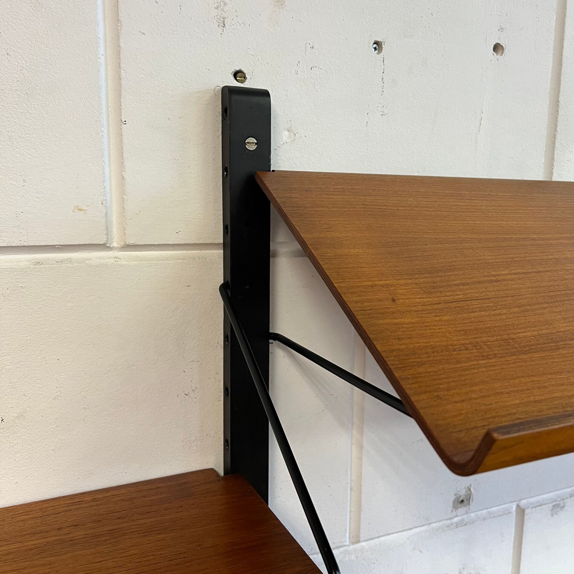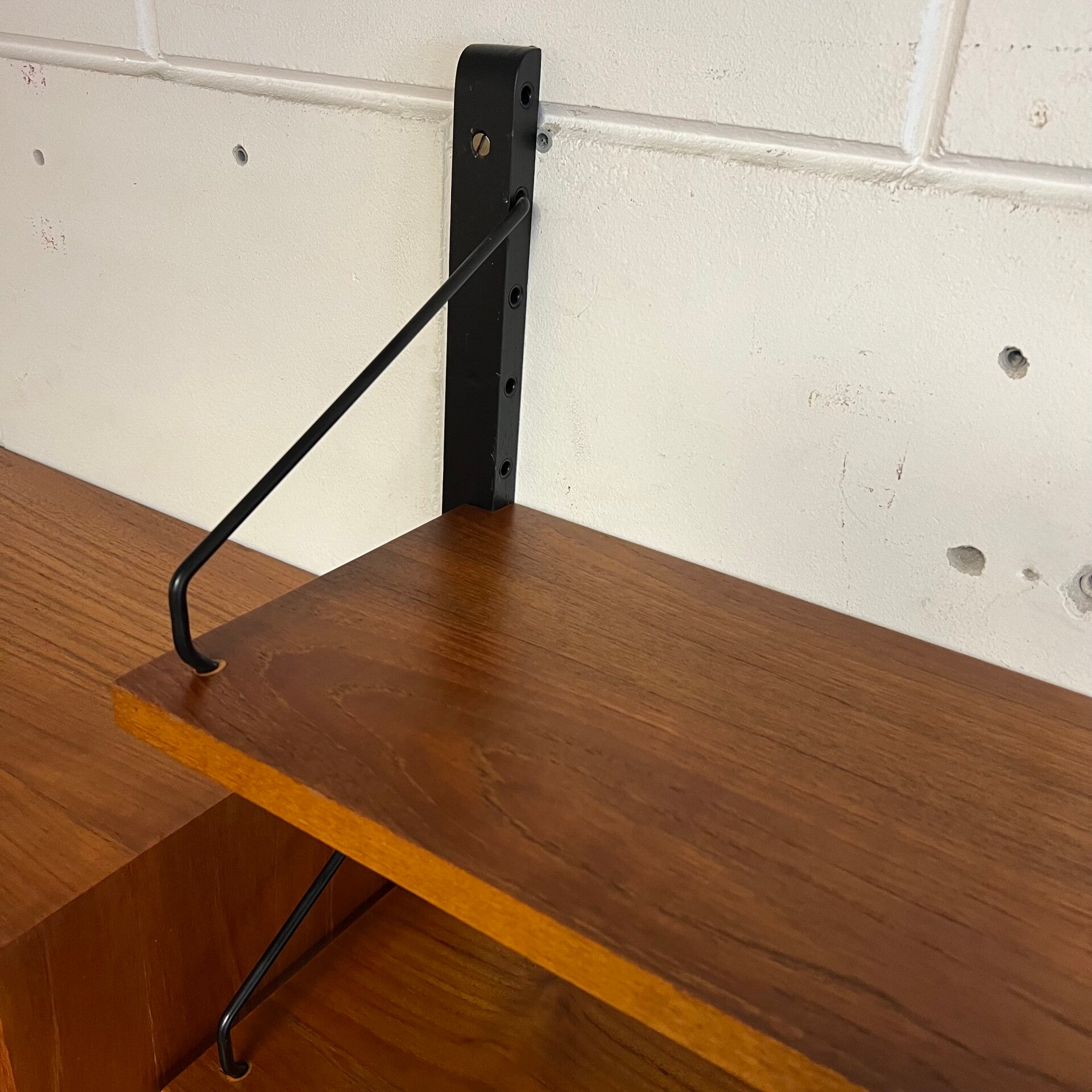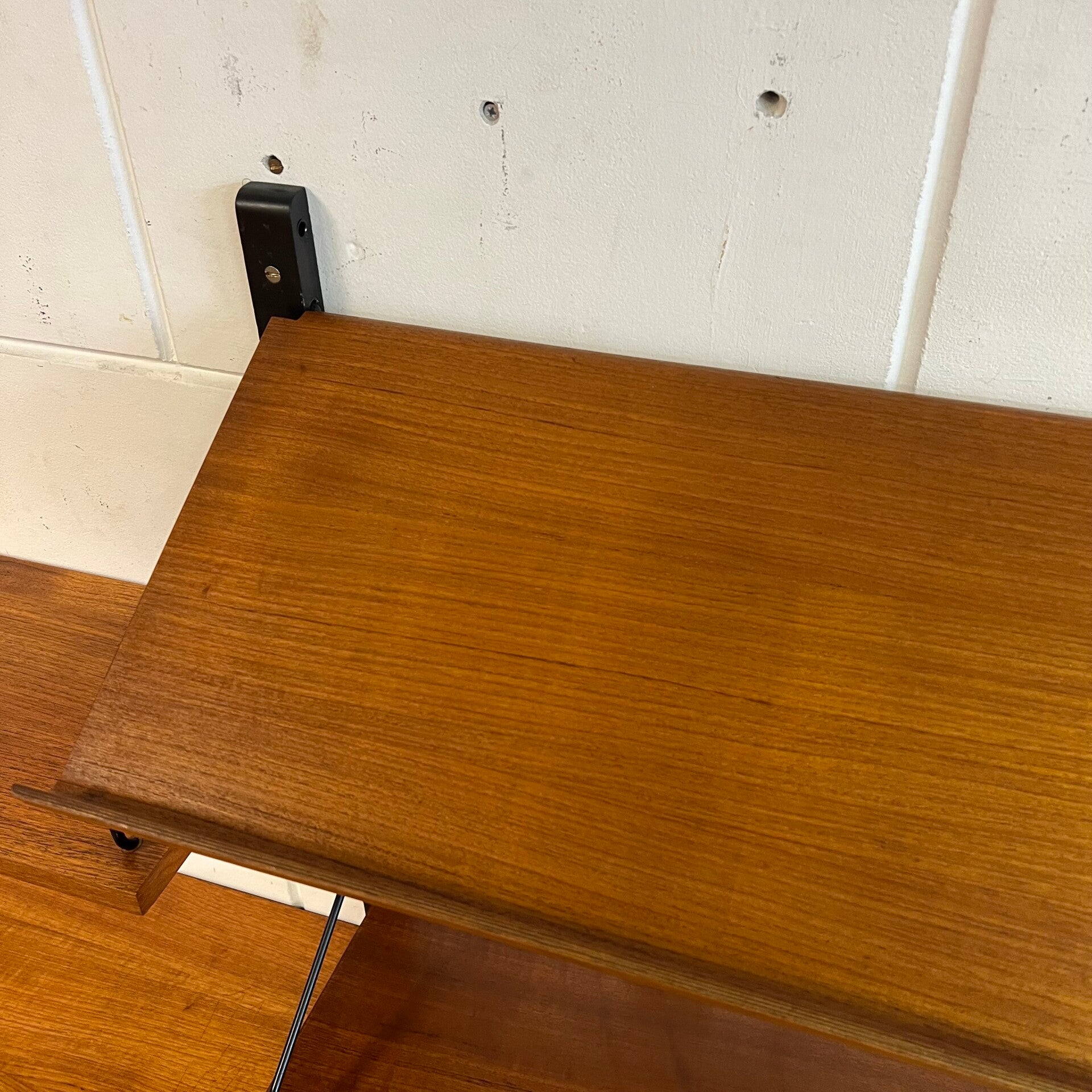 Prachtig vintage wandmeubel, wall unit uitgevoerd in teak (fineer) met zwart houten wandlatten en metalen beugels.