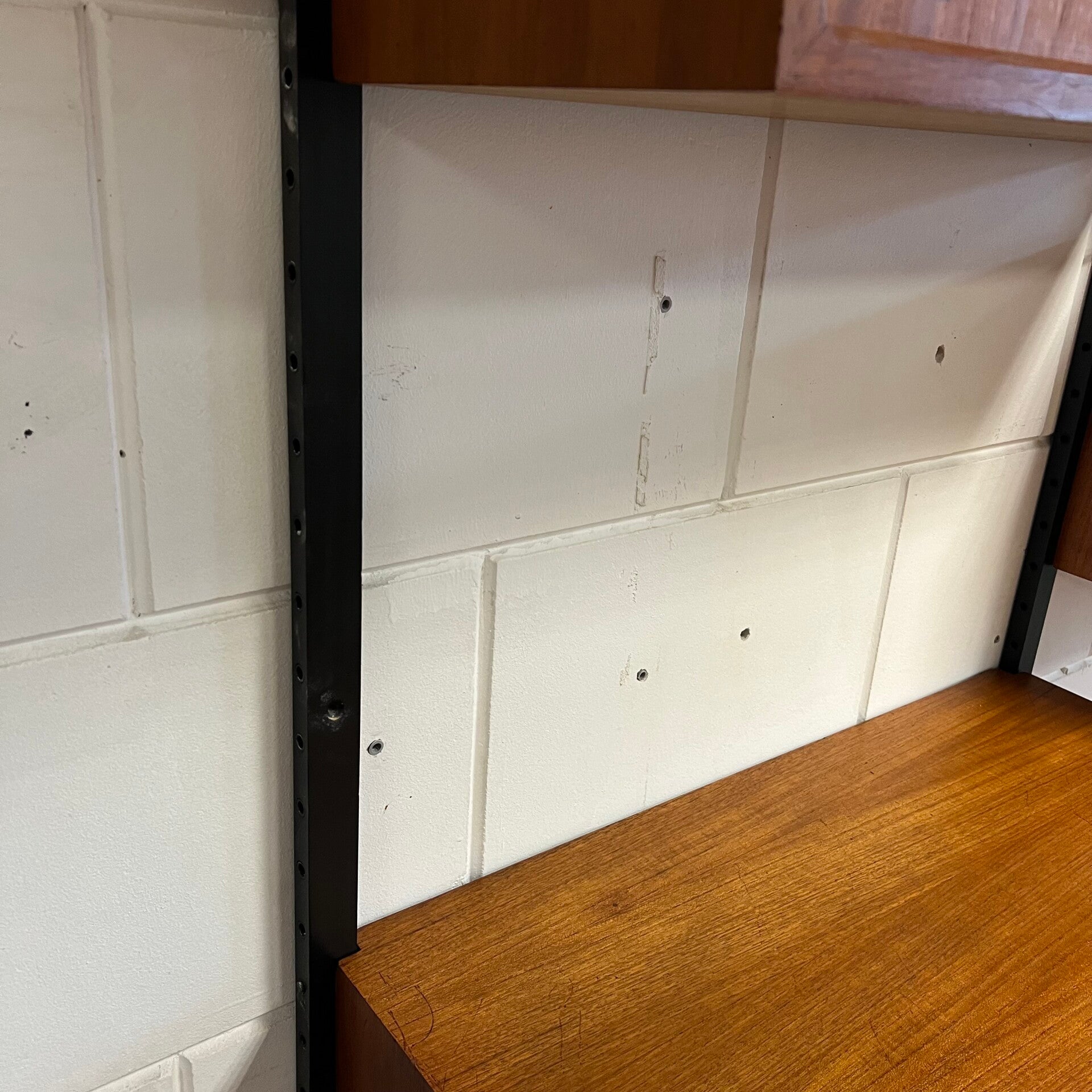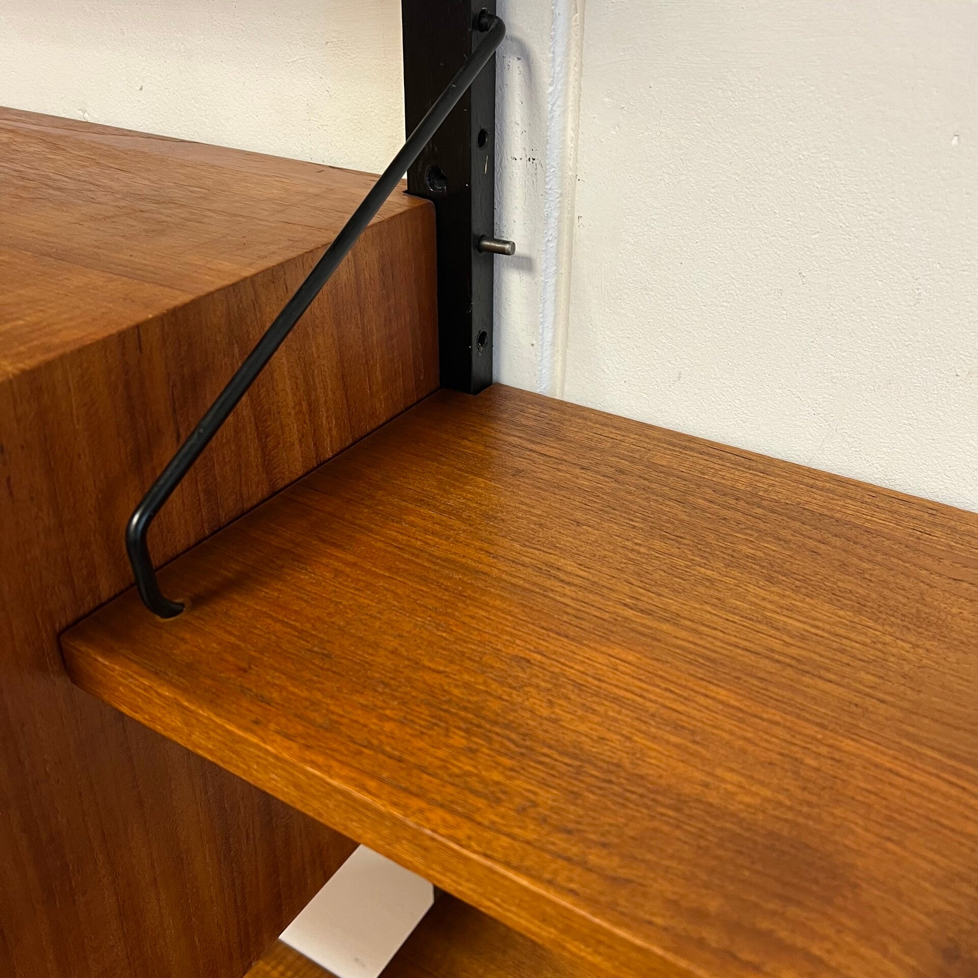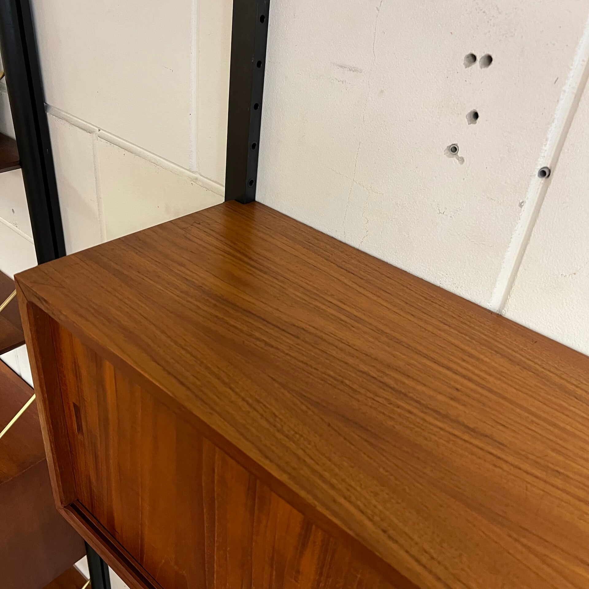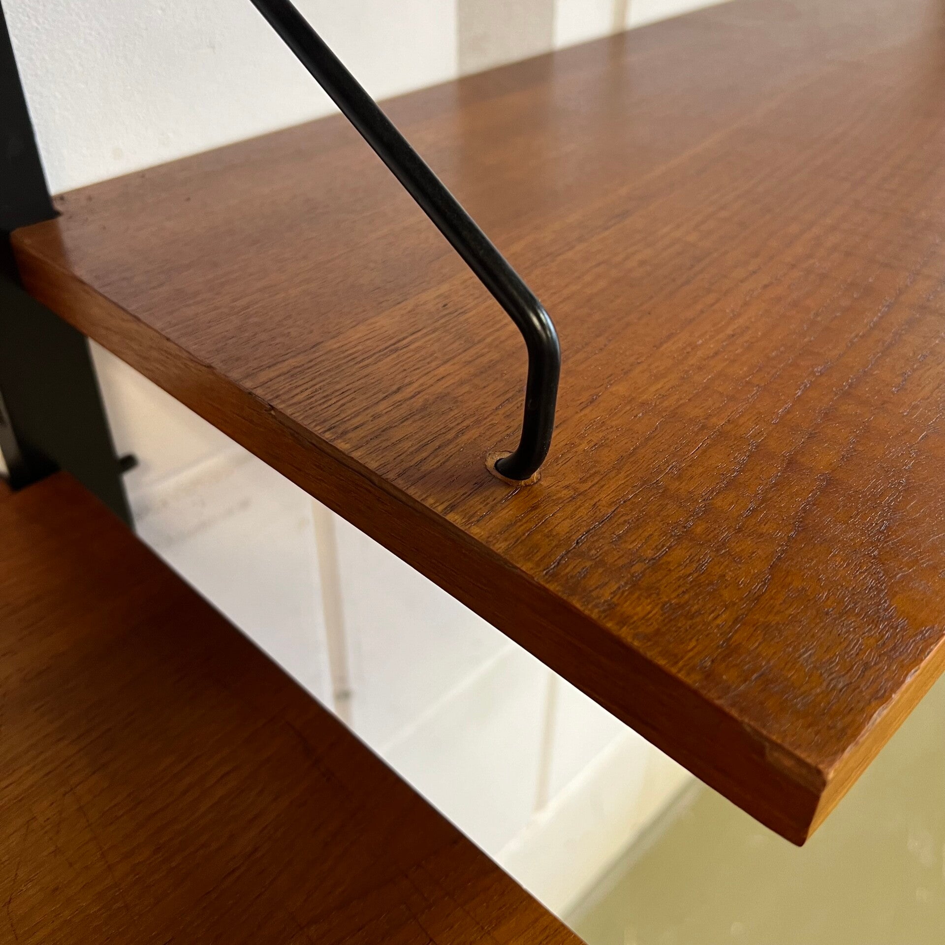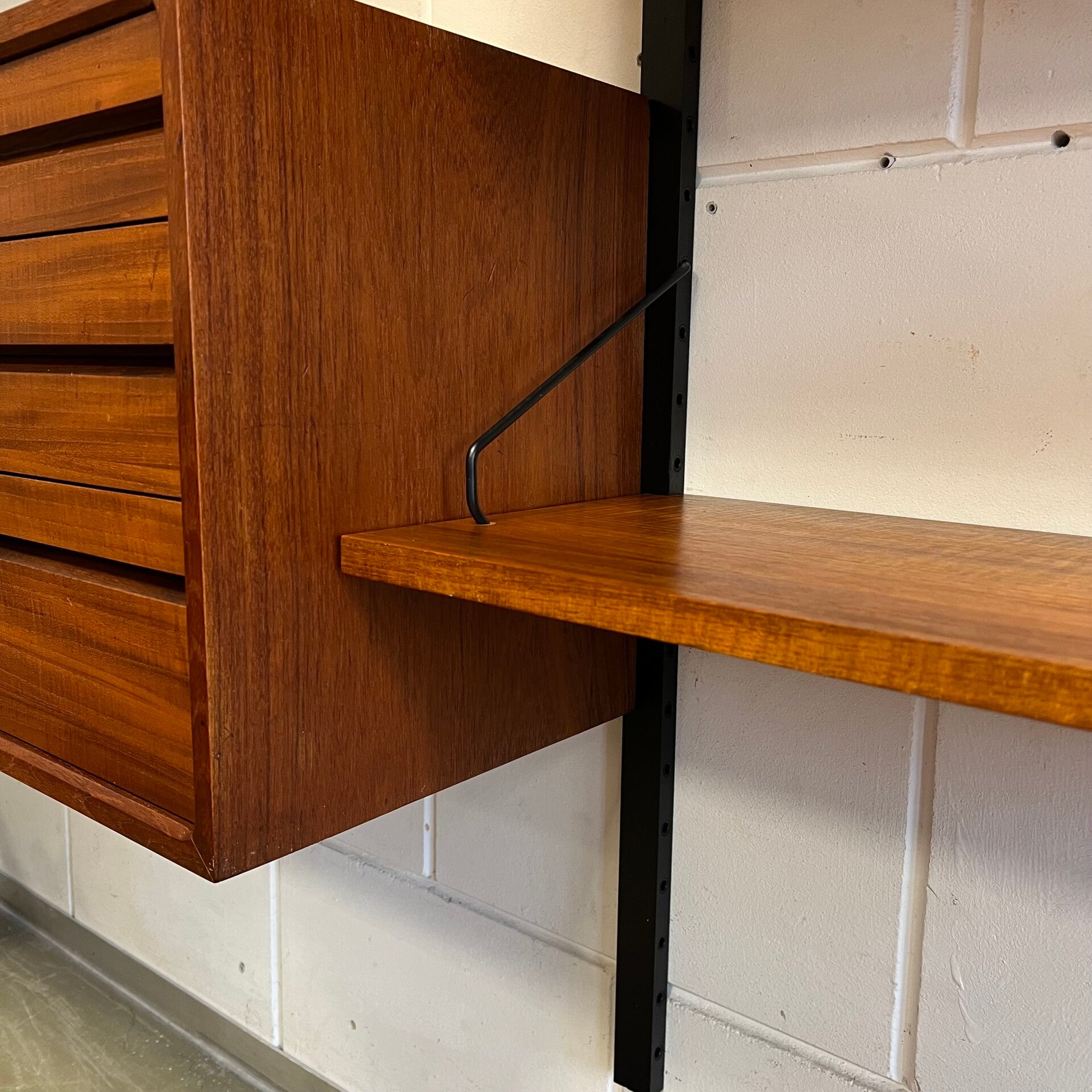 Prachtig vintage wandmeubel, wall unit uitgevoerd in teak (fineer) met zwart houten wandlatten en metalen beugels.