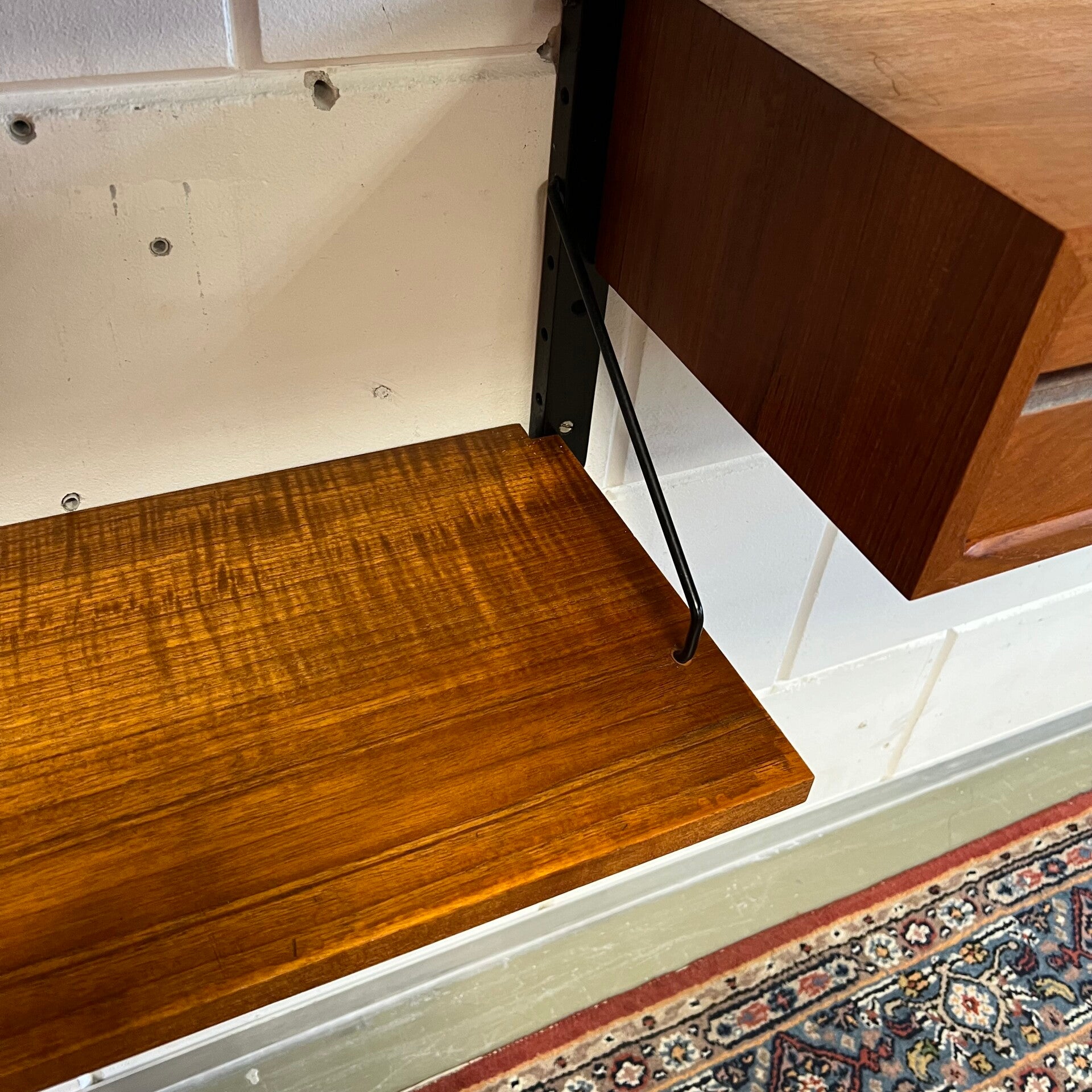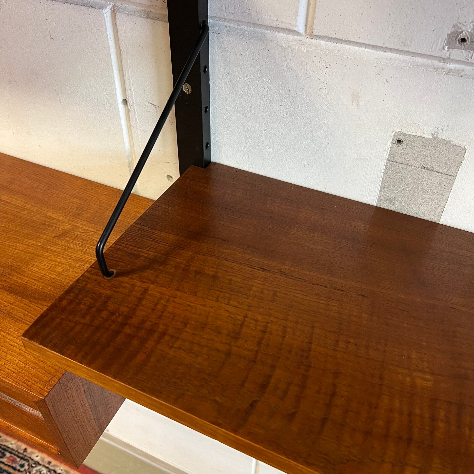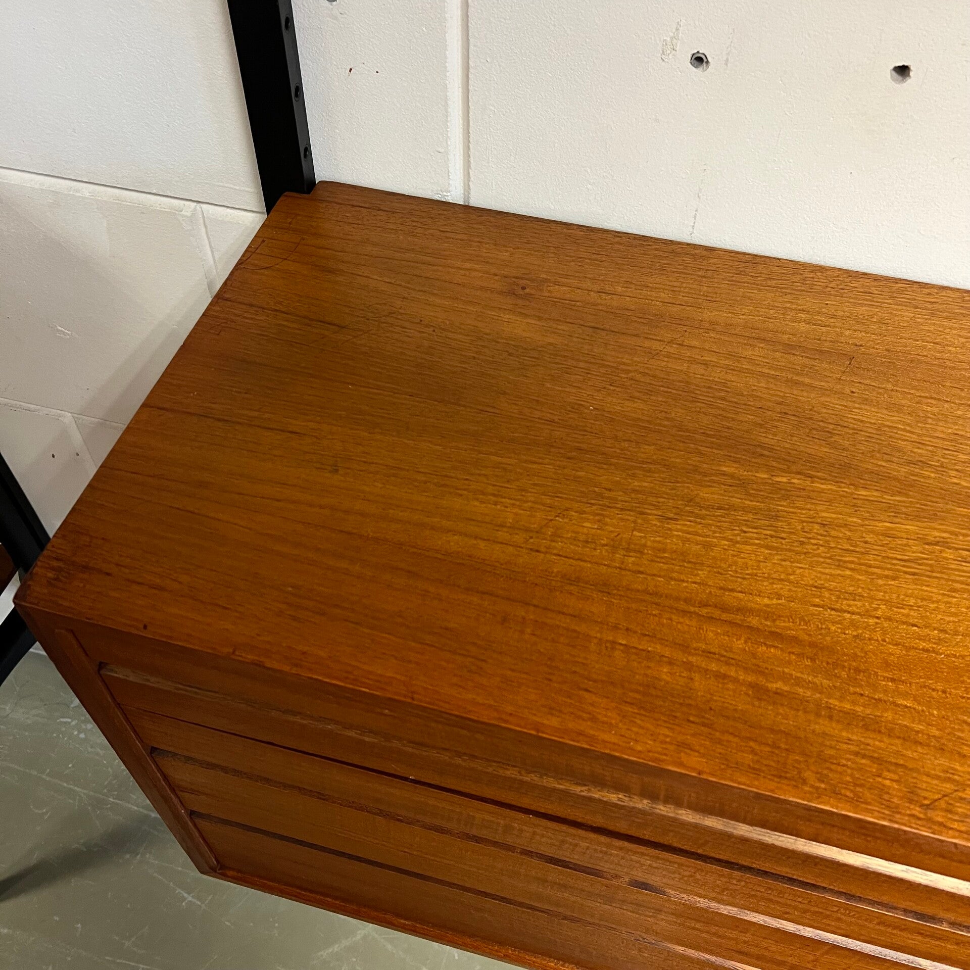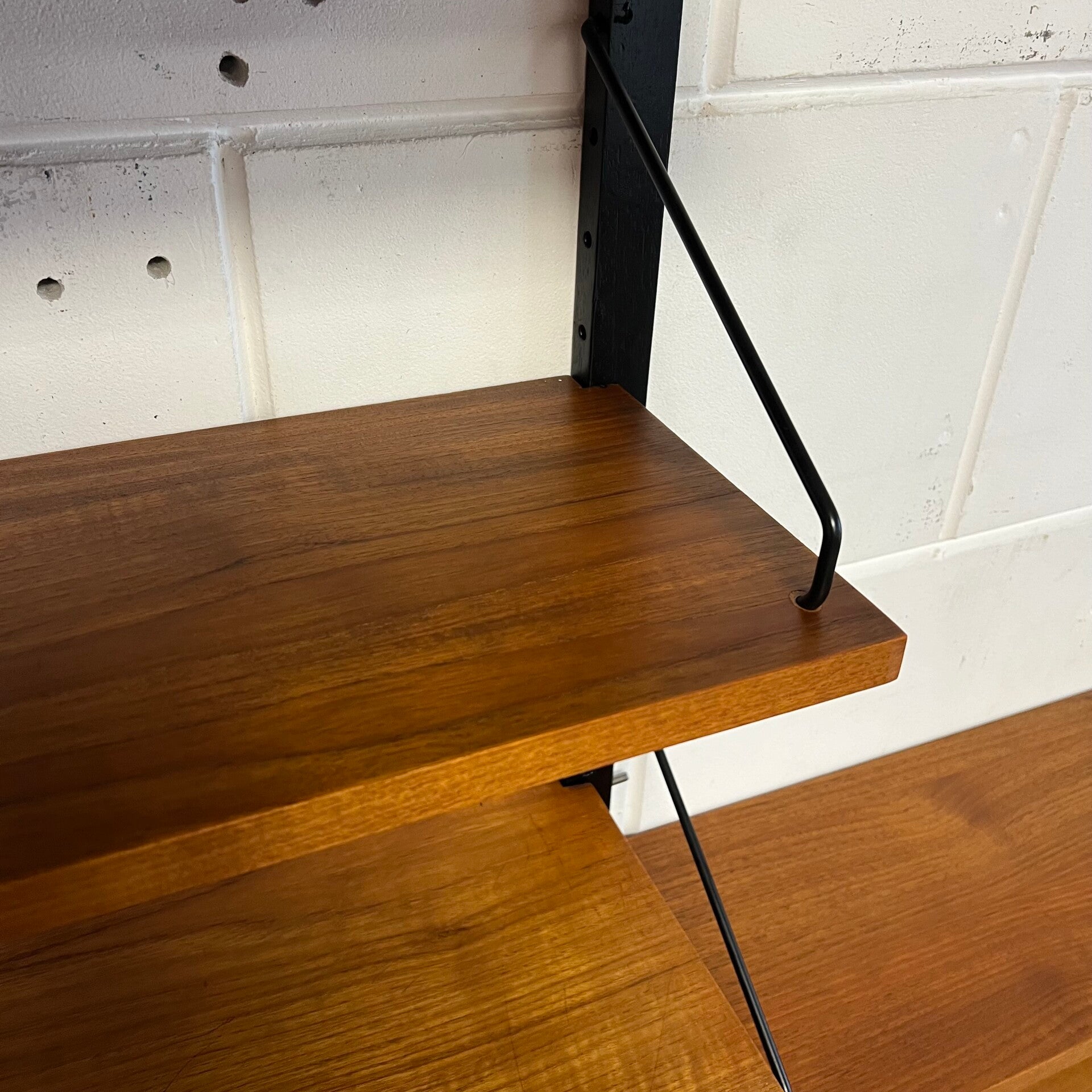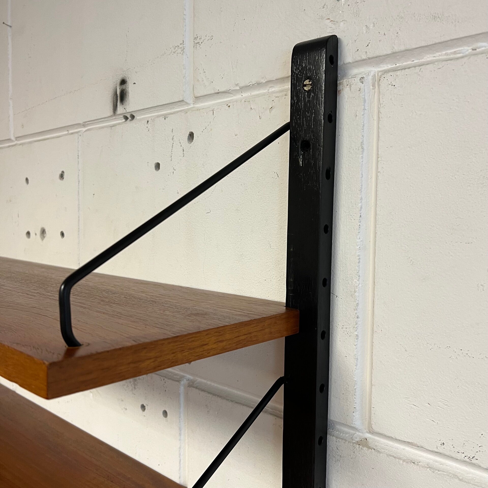 Prachtig vintage wandmeubel, wall unit uitgevoerd in teak (fineer) met zwart houten wandlatten en metalen beugels.