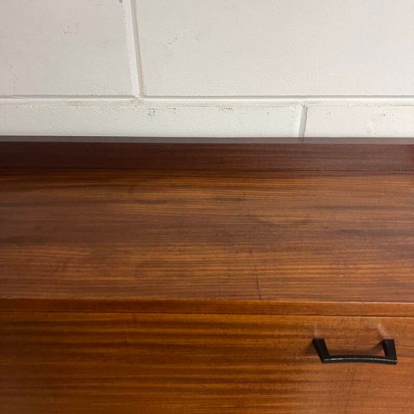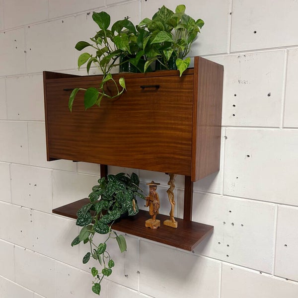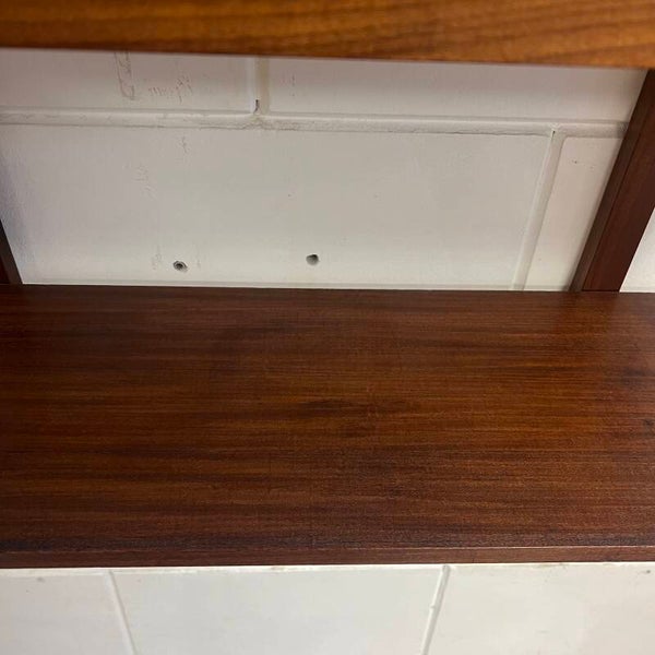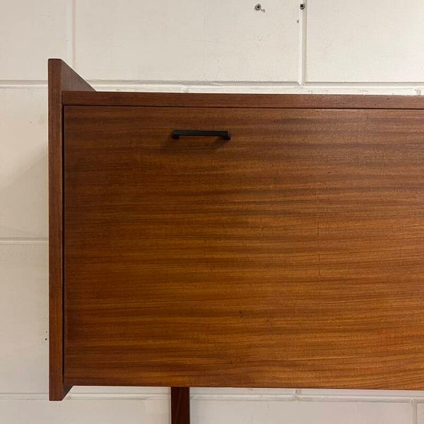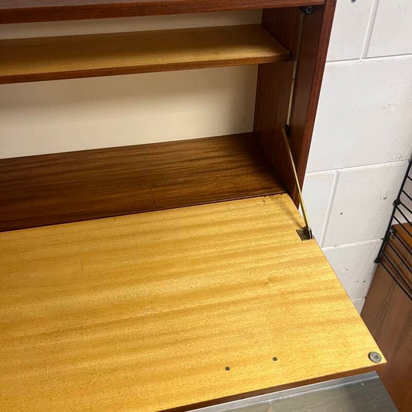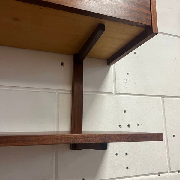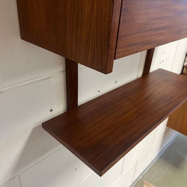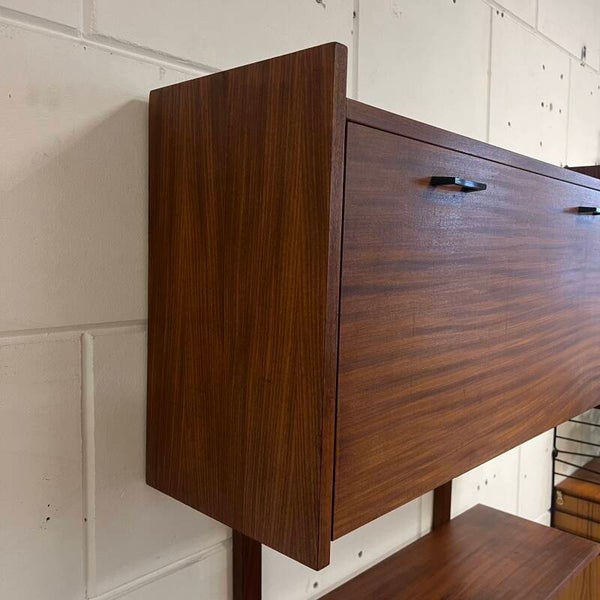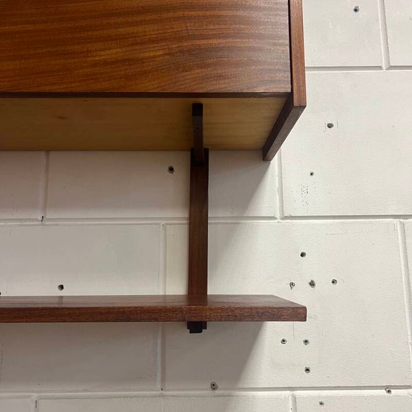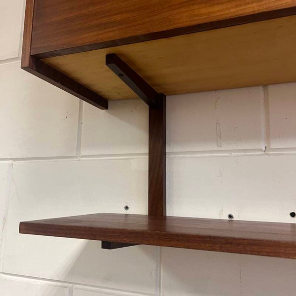 Leuk vintage wandmeubel, uitgevoerd in teak (fineer) met zwarte handgrepen.
