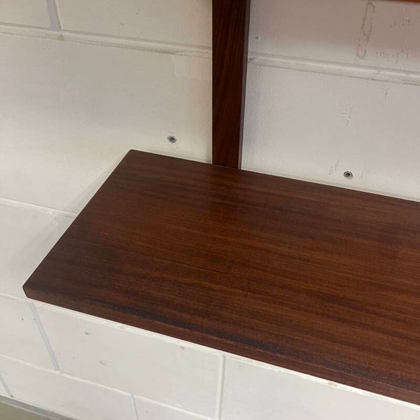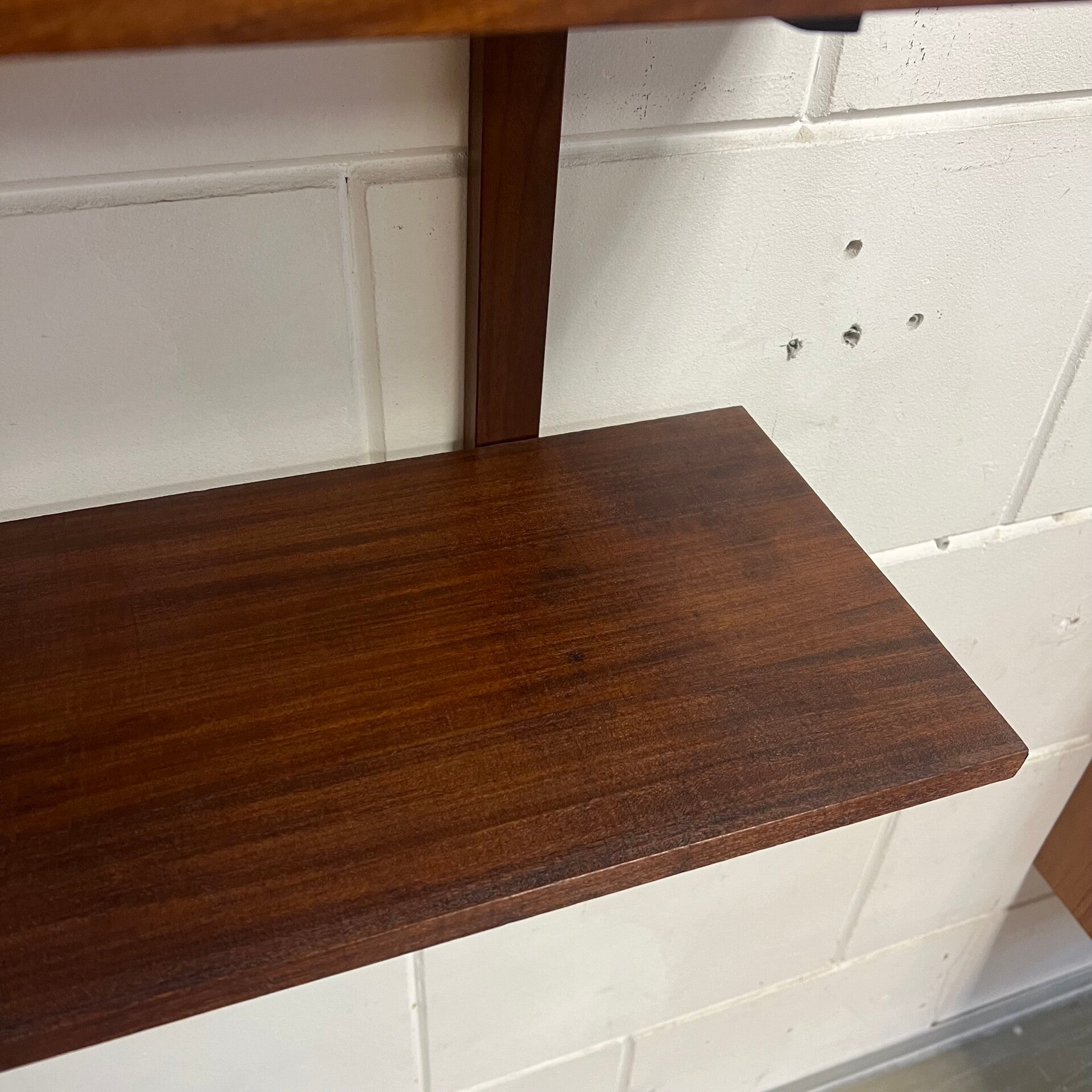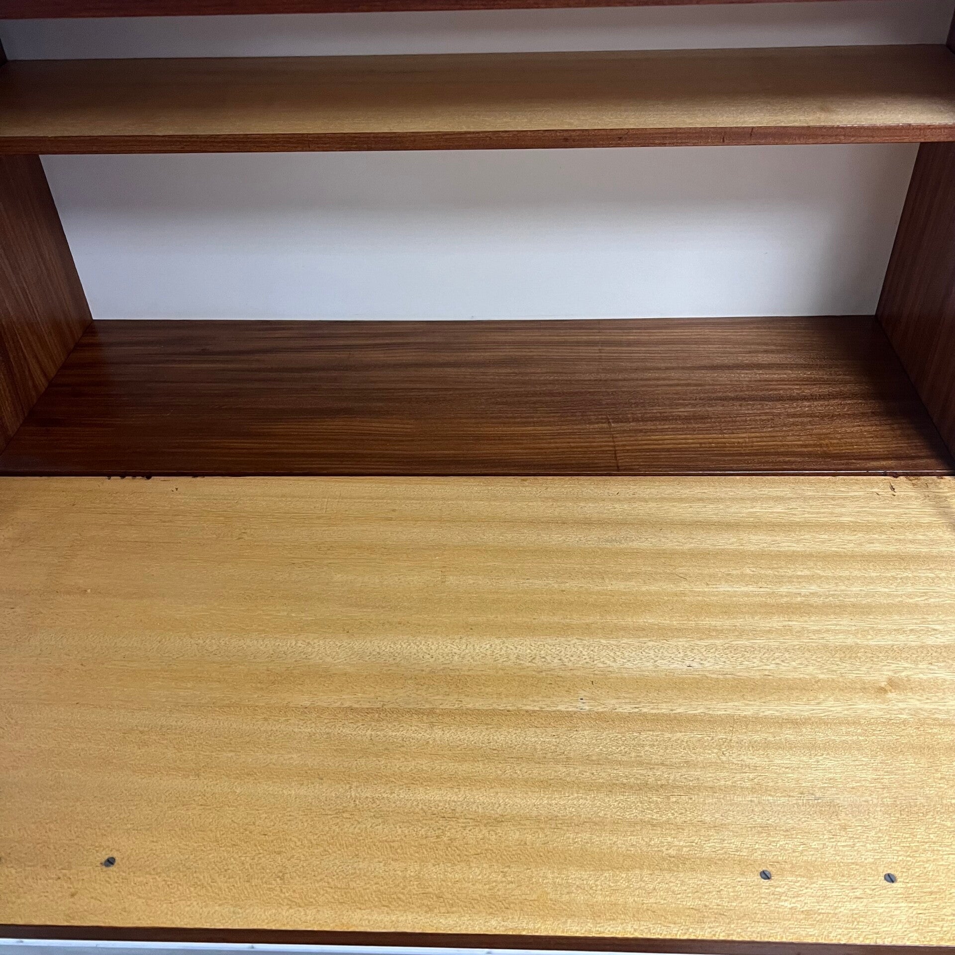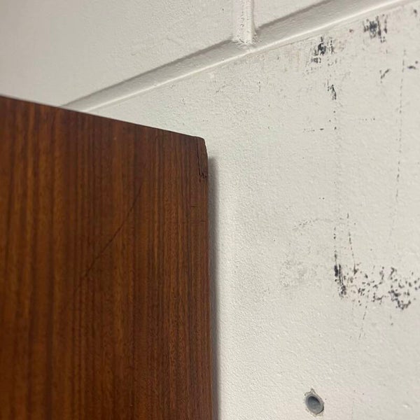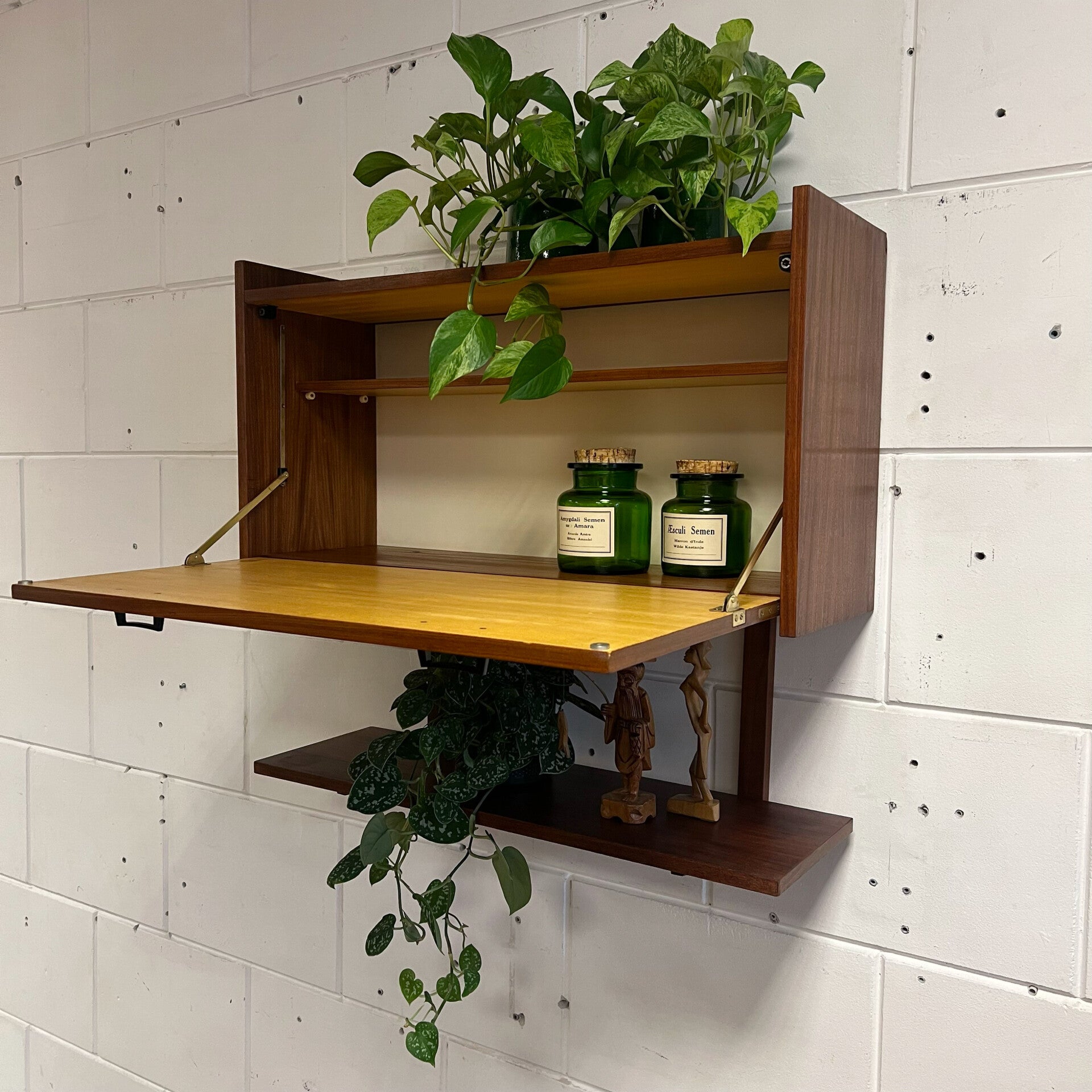 Leuk vintage wandmeubel, uitgevoerd in teak (fineer) met zwarte handgrepen.