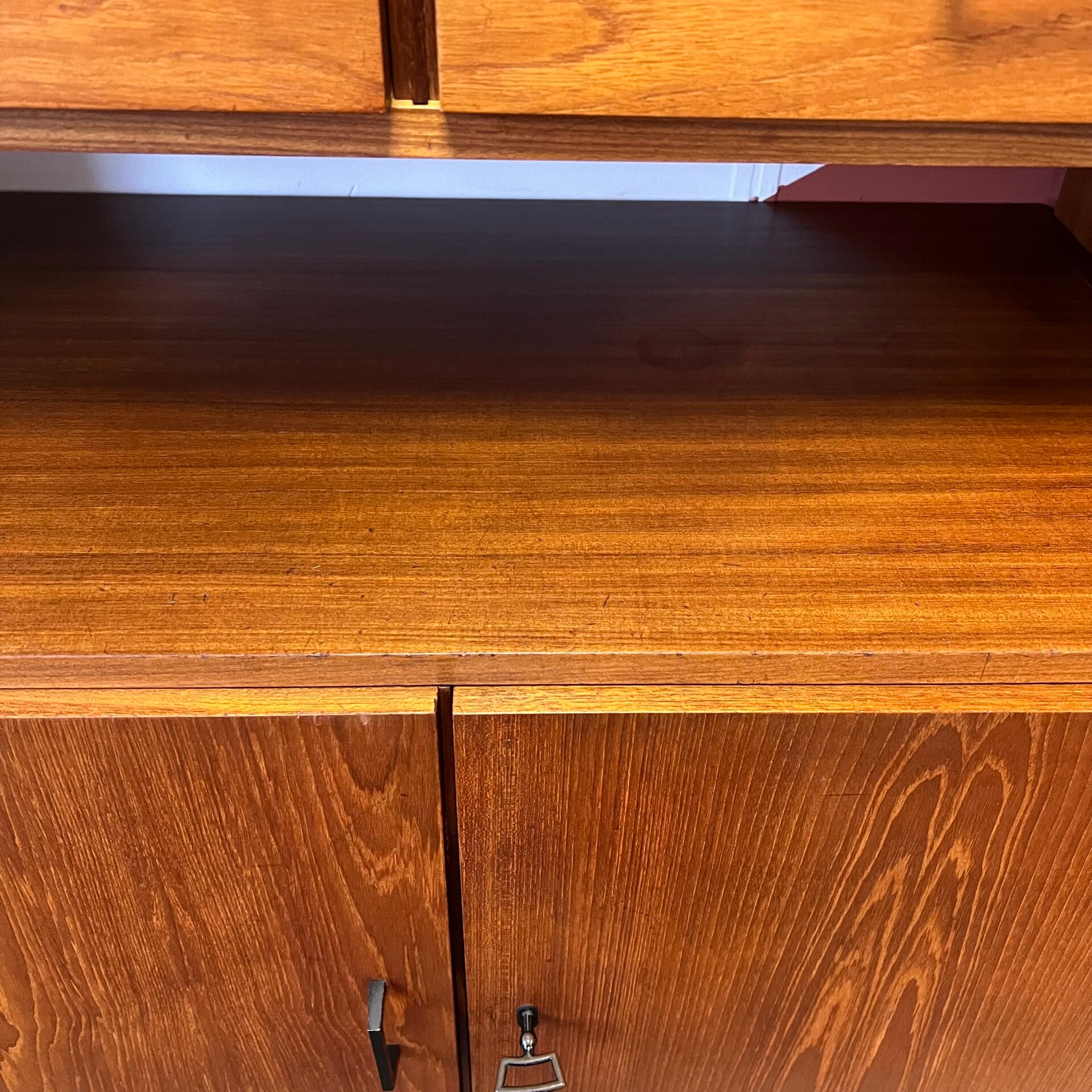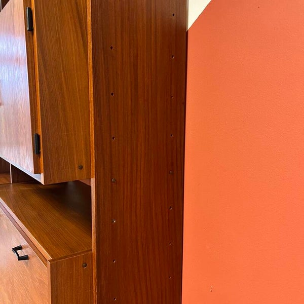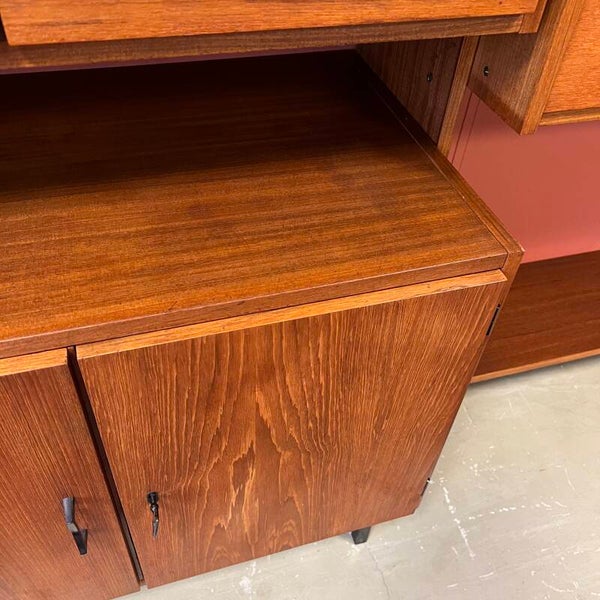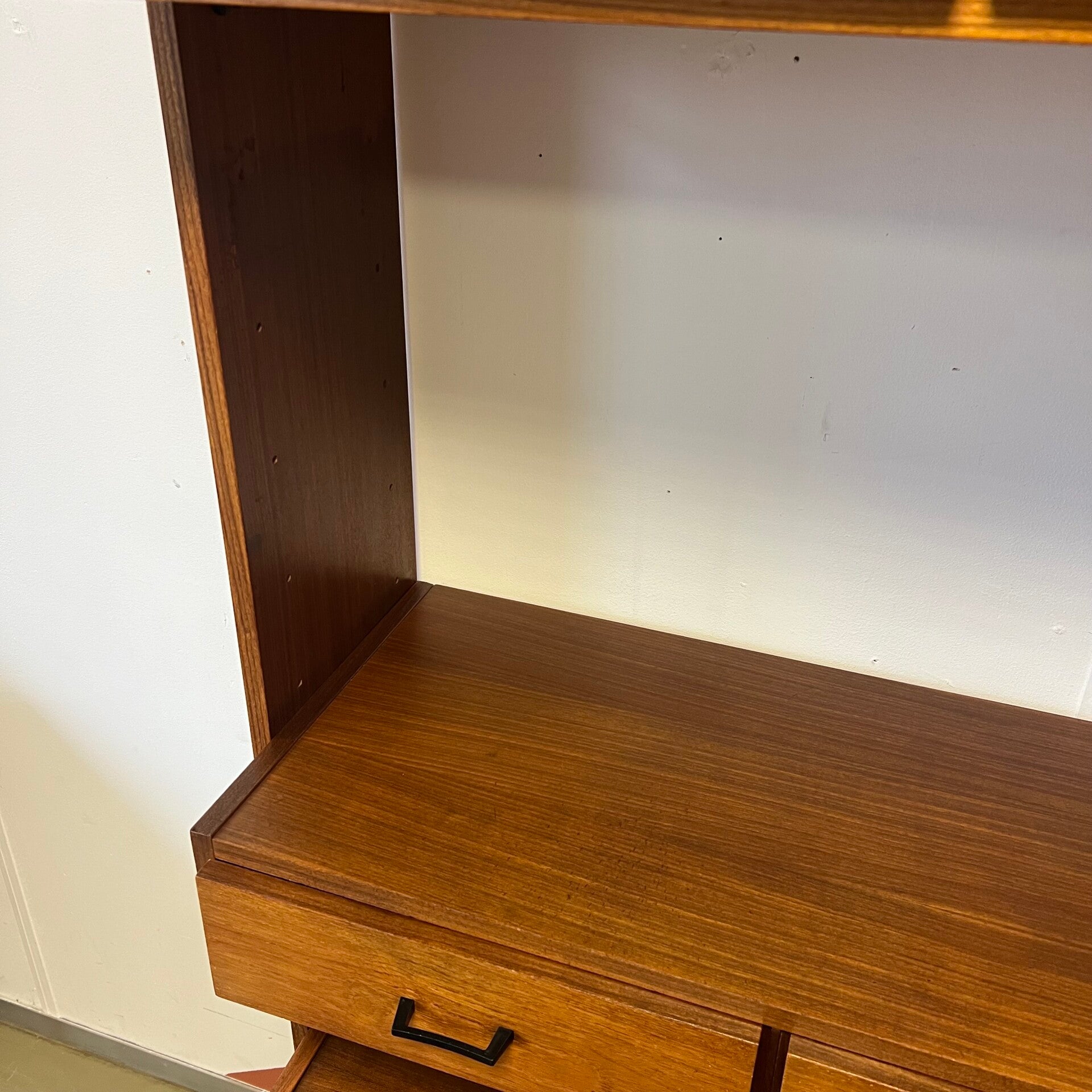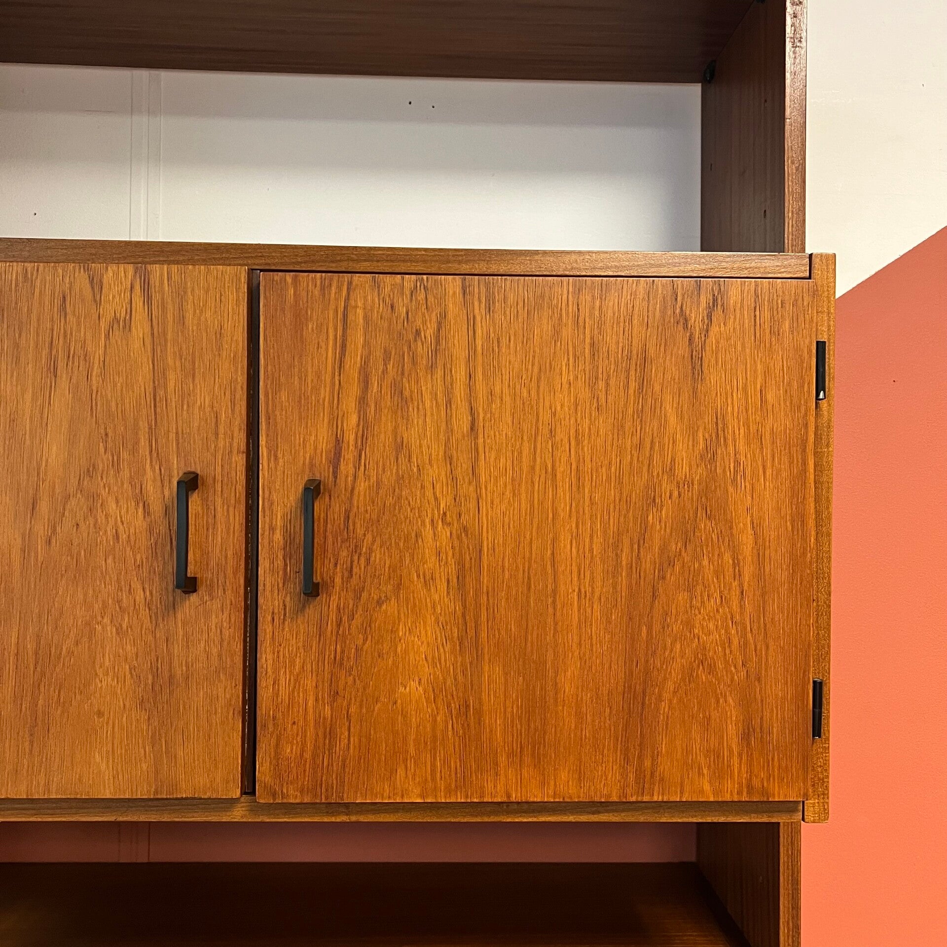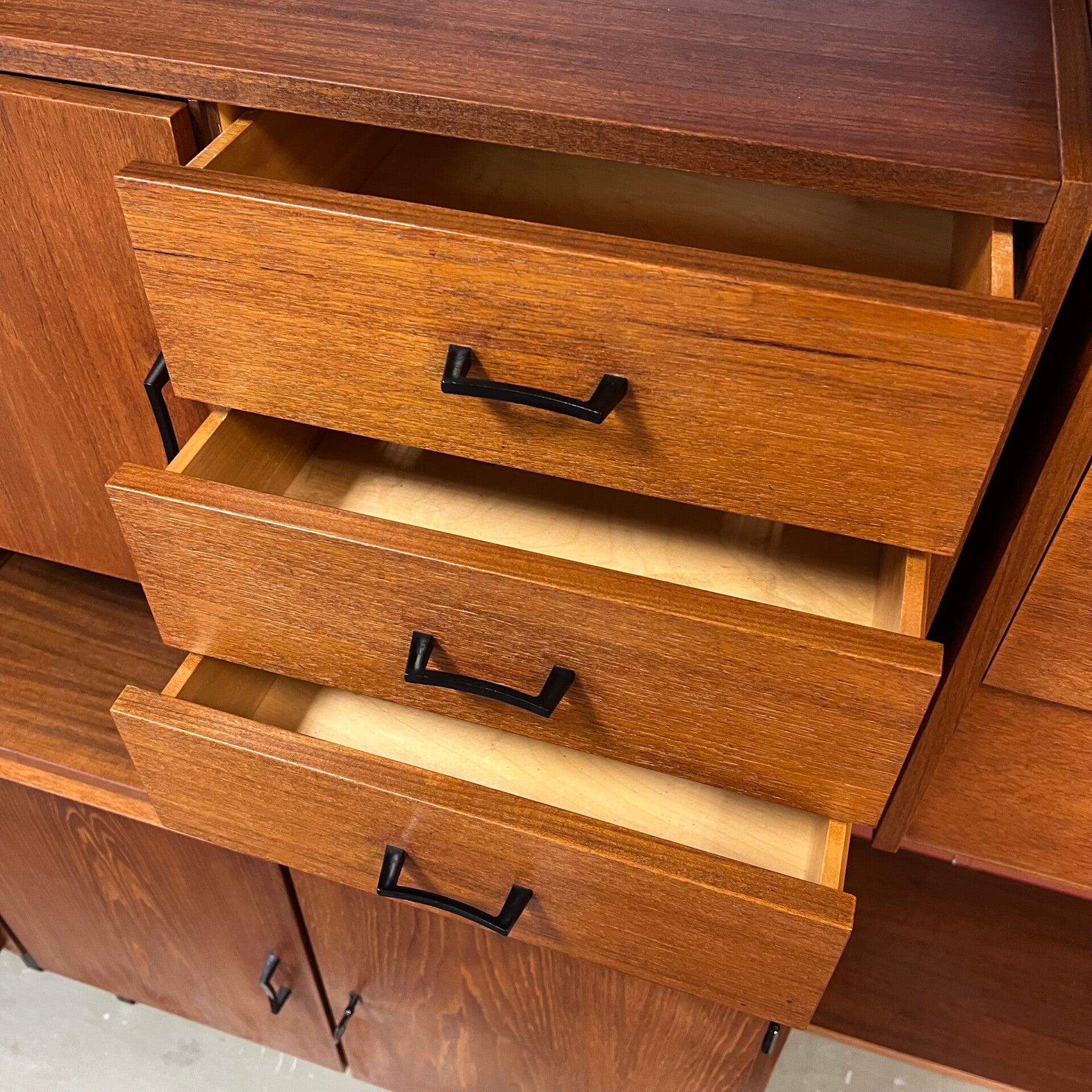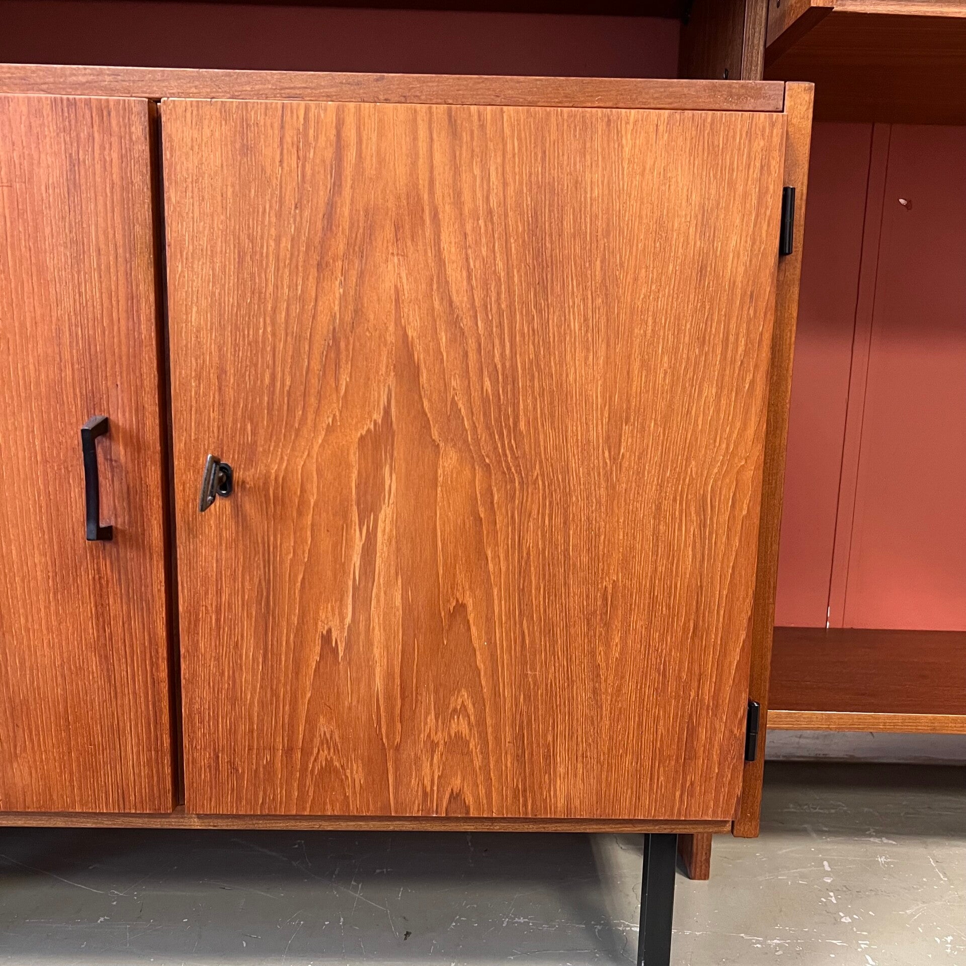 Mooi karakteristiek vintage wandmeubel in teak (fineer) met zwart beslag.