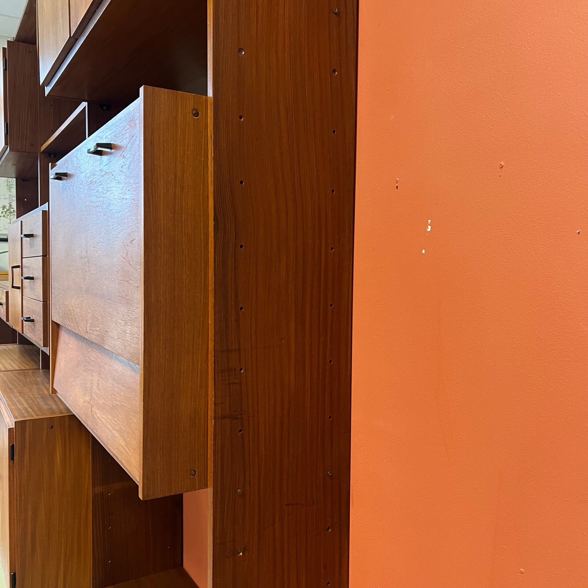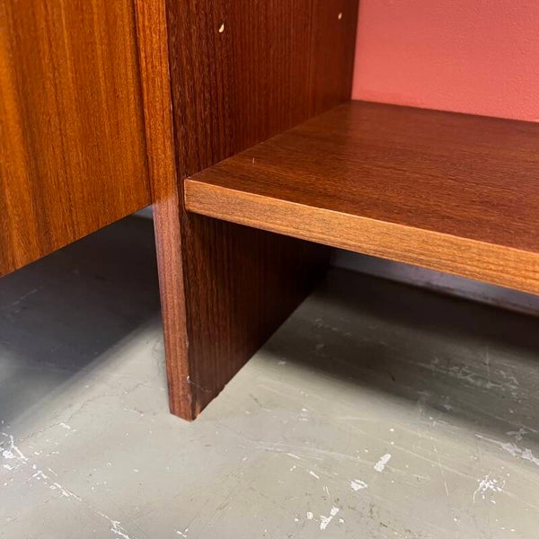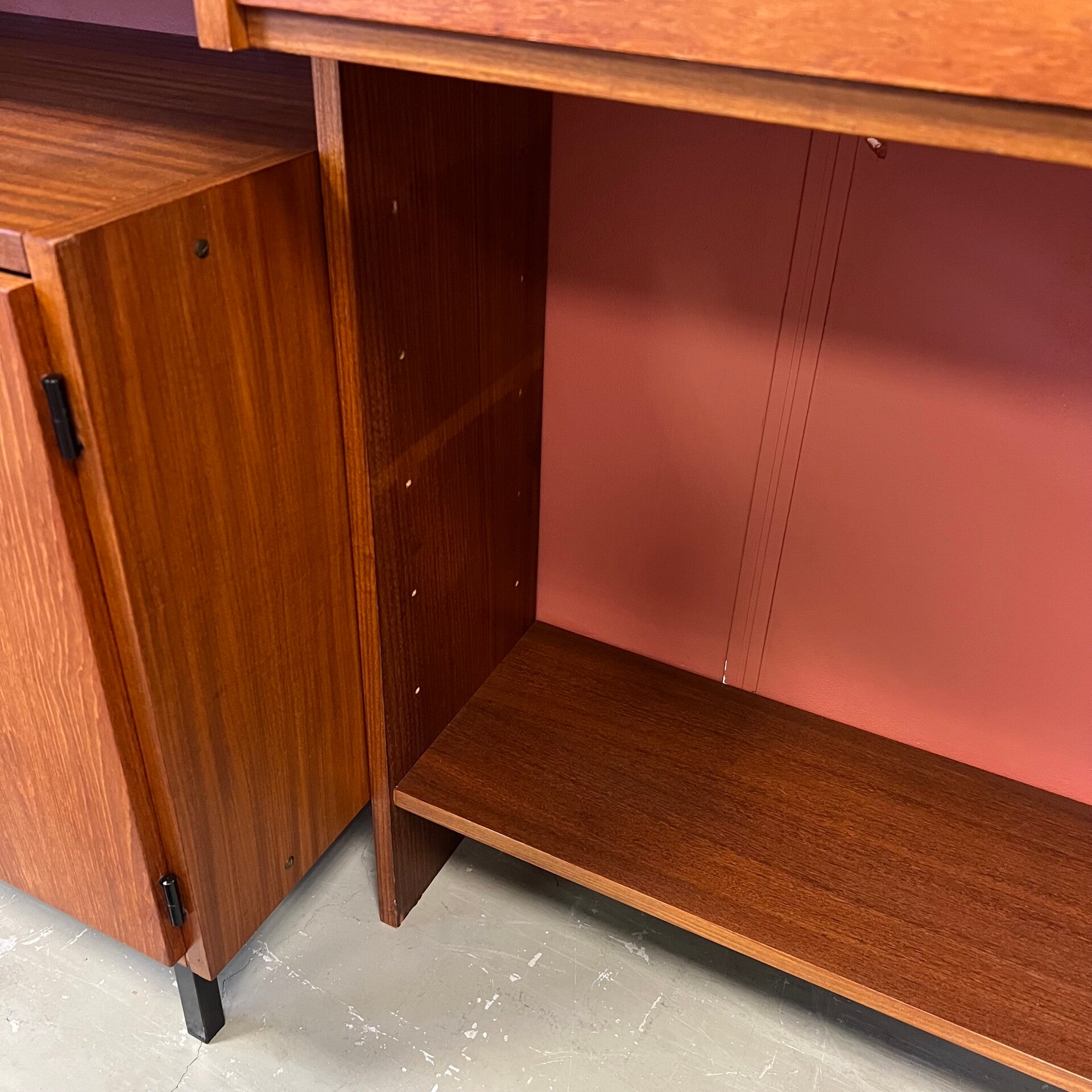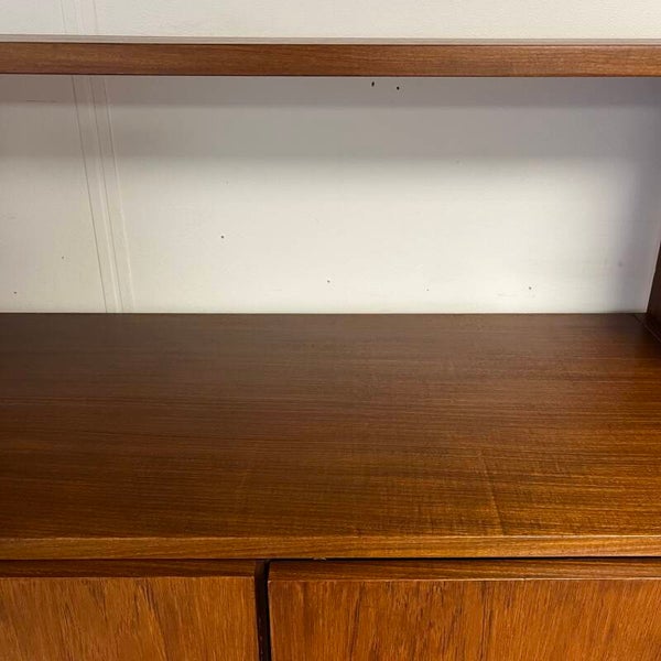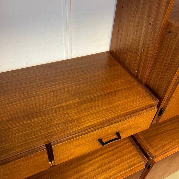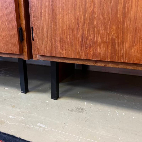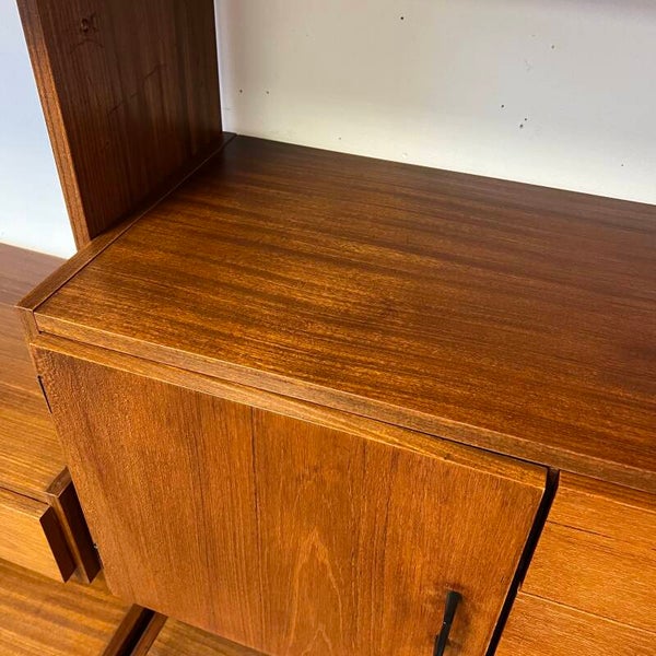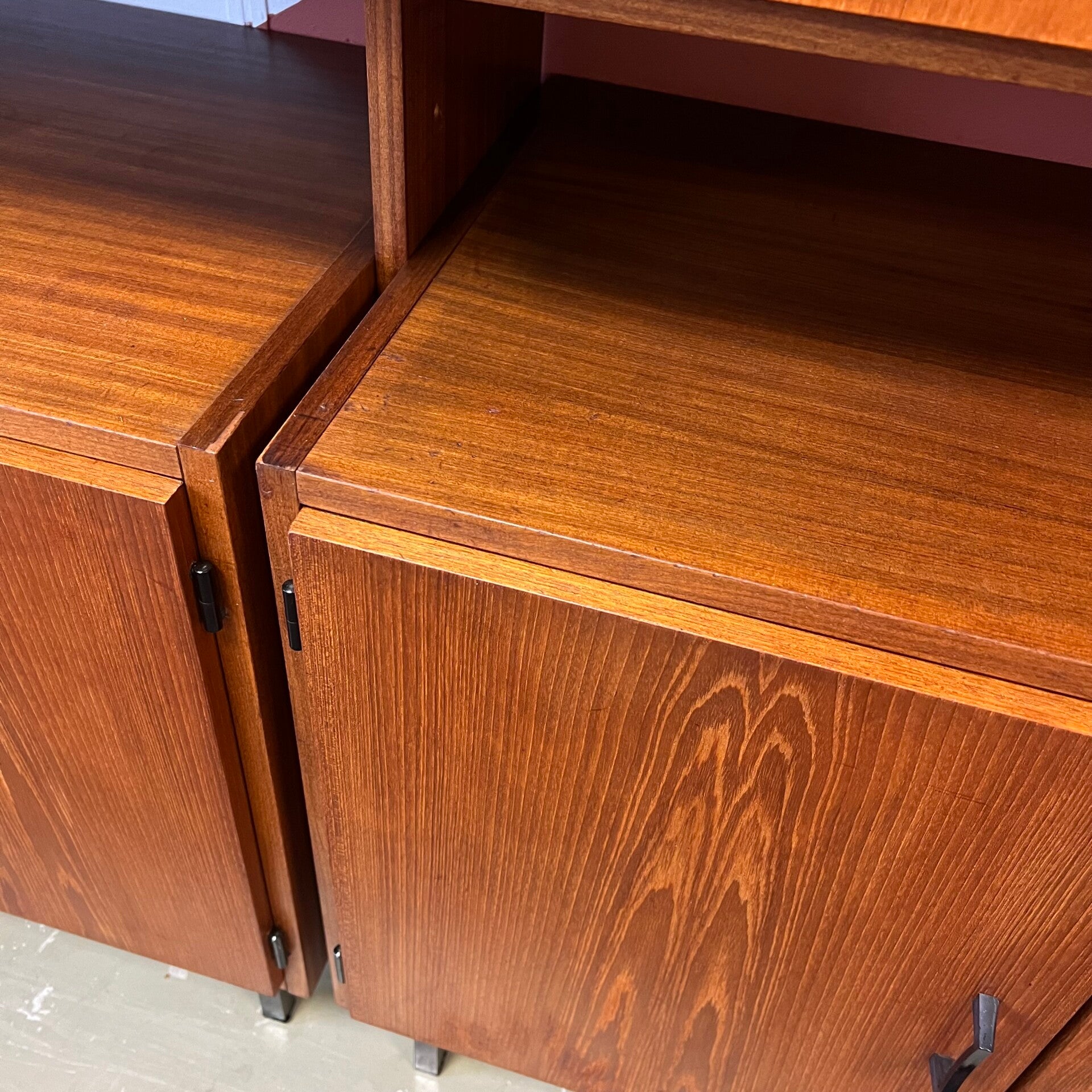 Mooi karakteristiek vintage wandmeubel in teak (fineer) met zwart beslag.