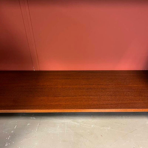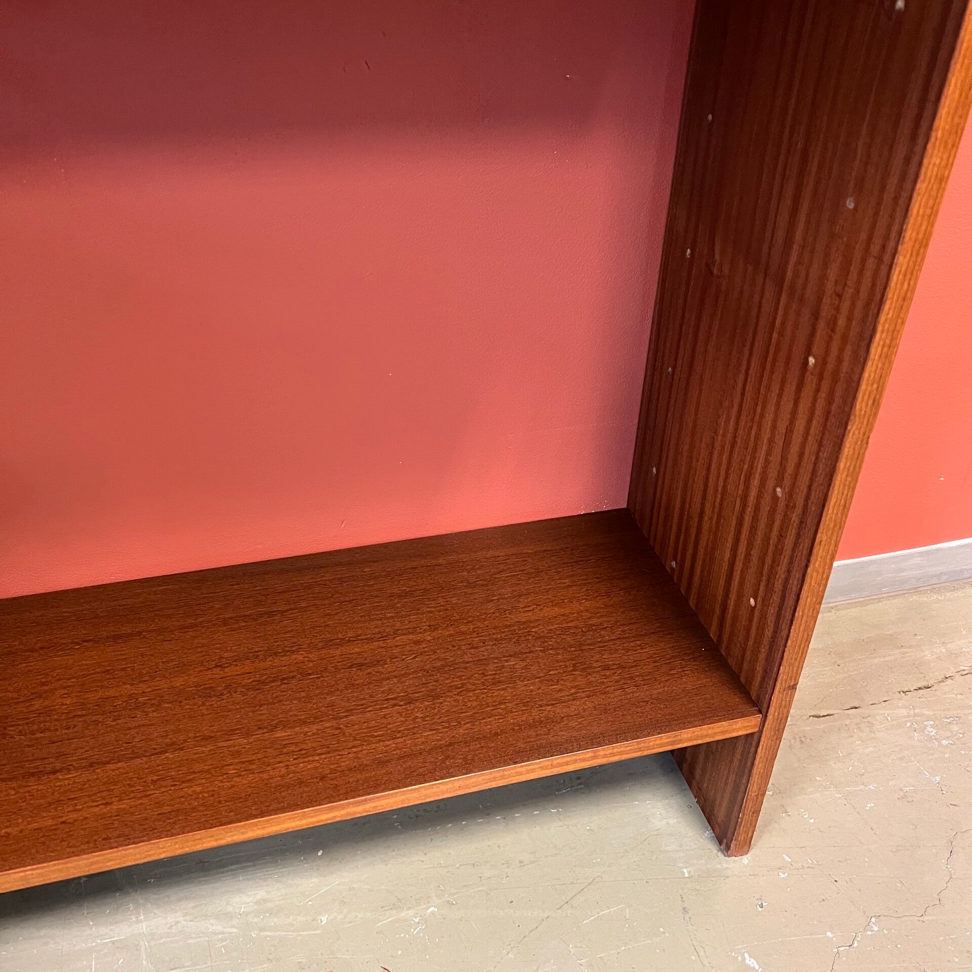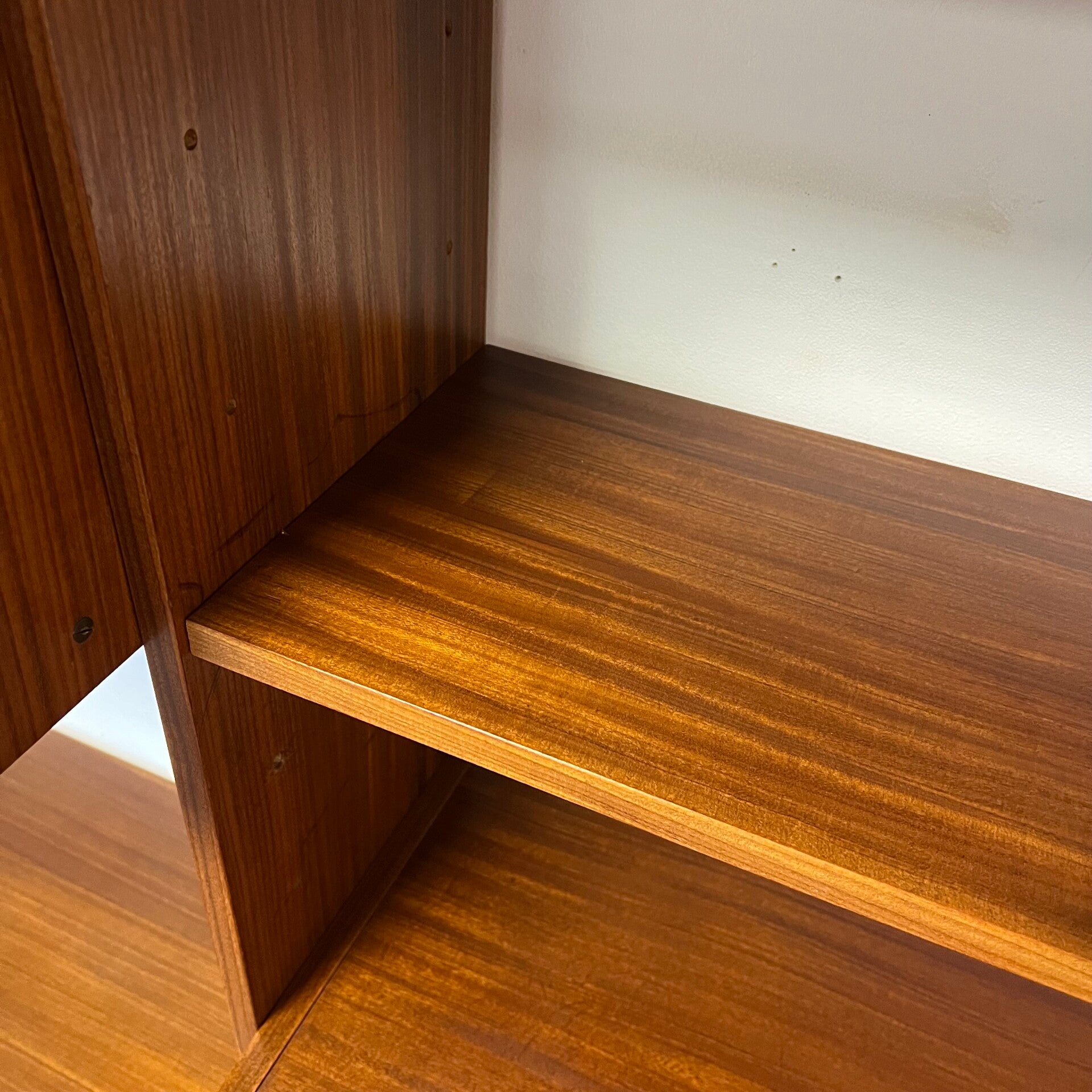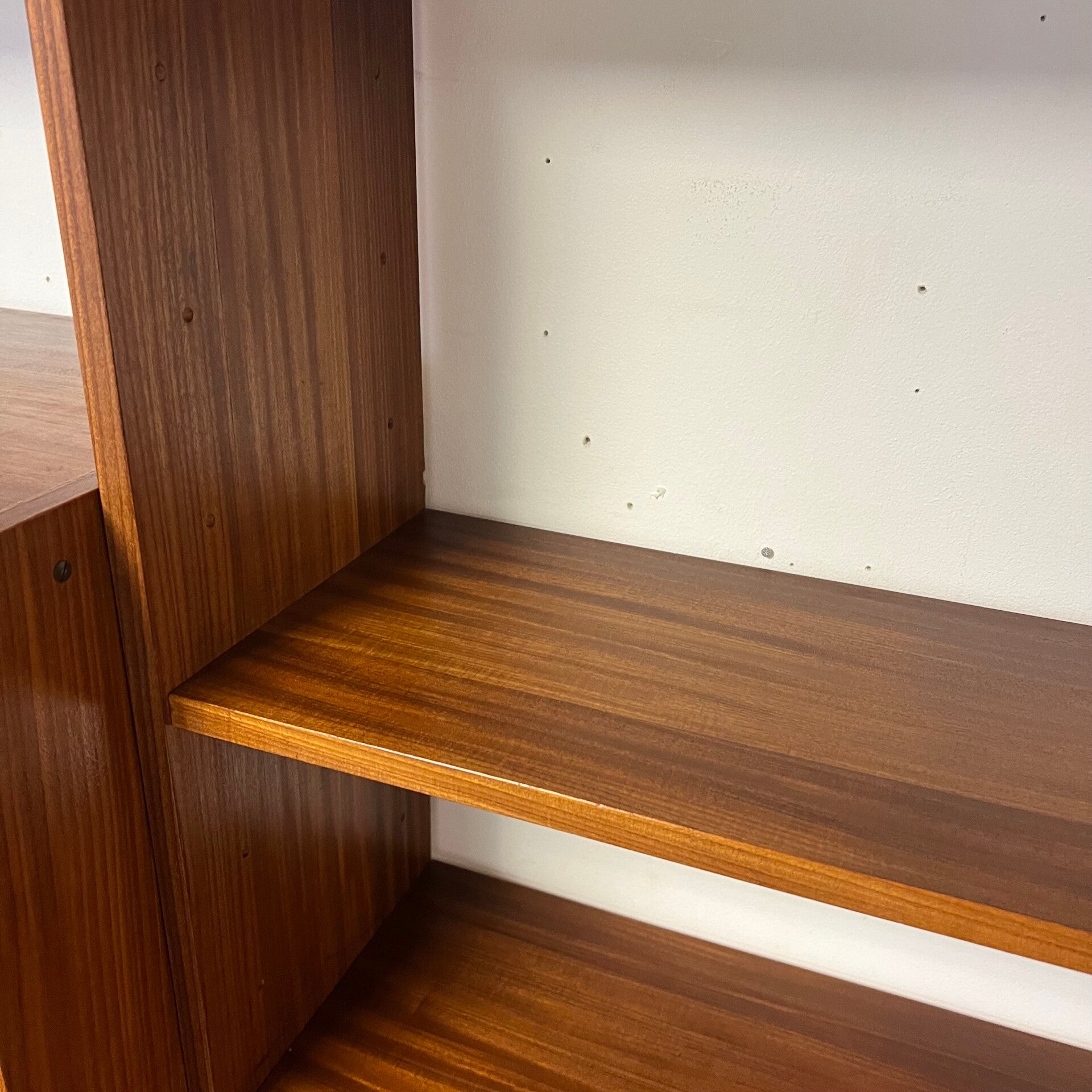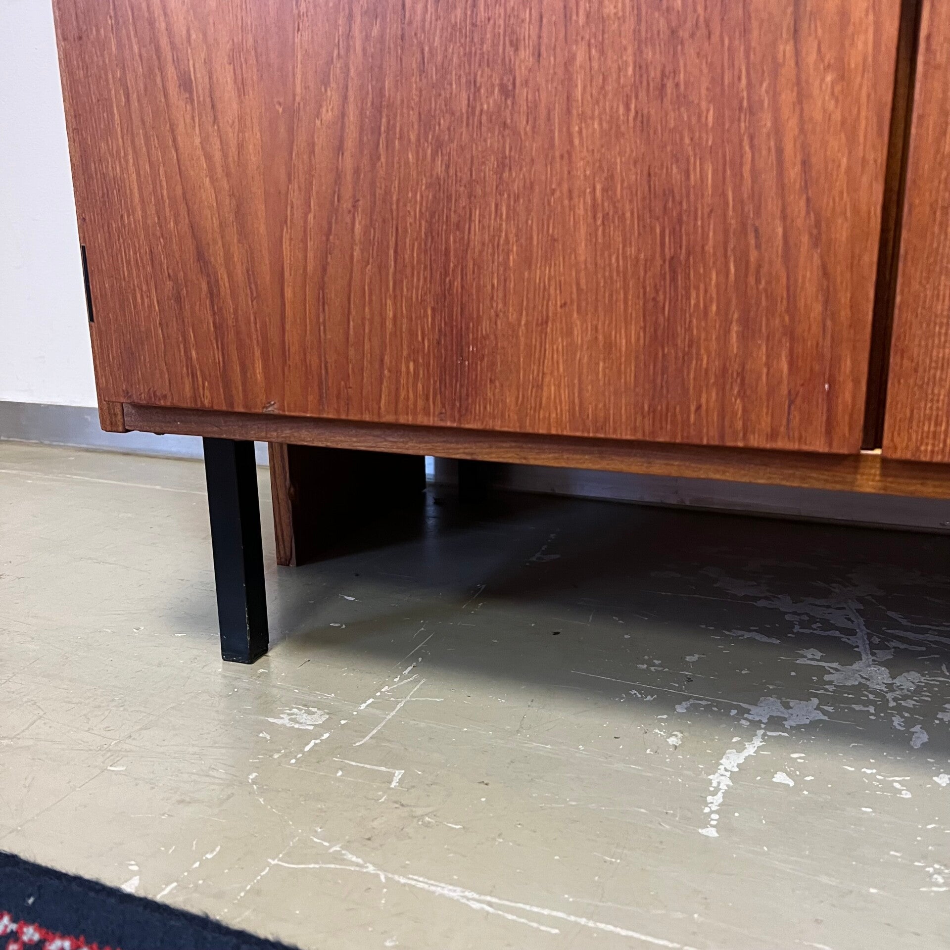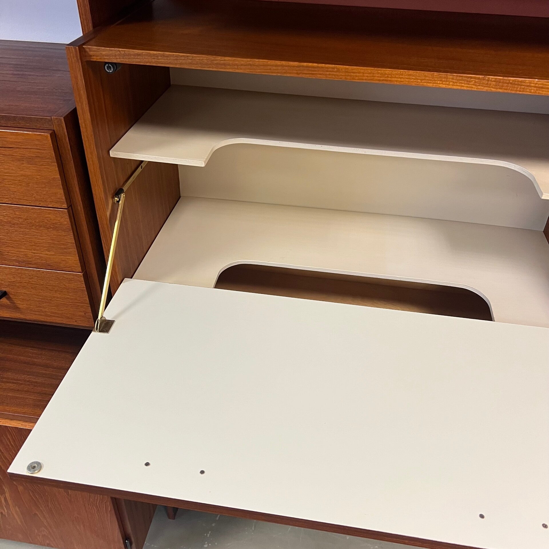 Mooi karakteristiek vintage wandmeubel in teak (fineer) met zwart beslag.