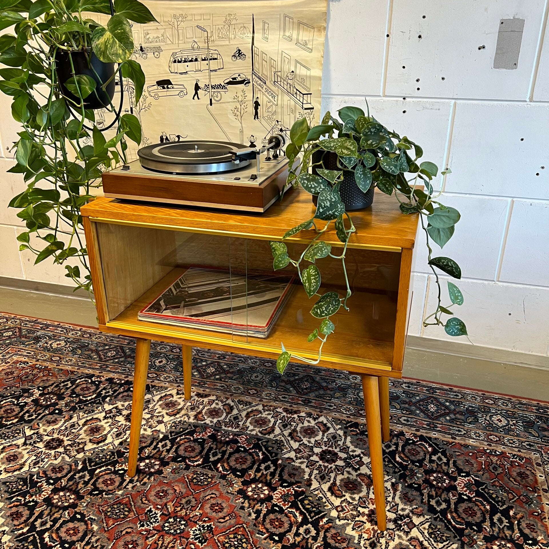 Leuk vintage TV-, audiomeubel met glazen schuifruitjes.