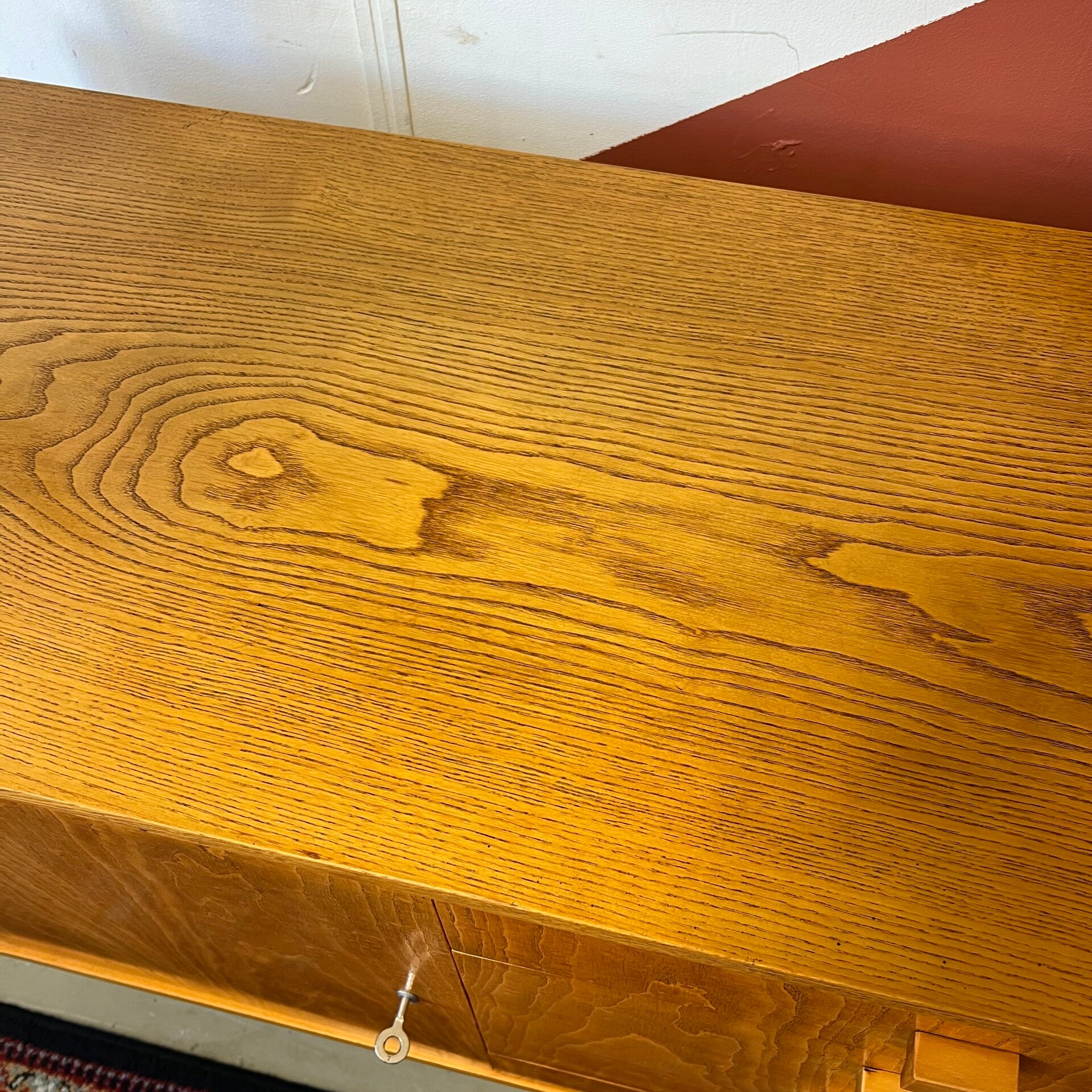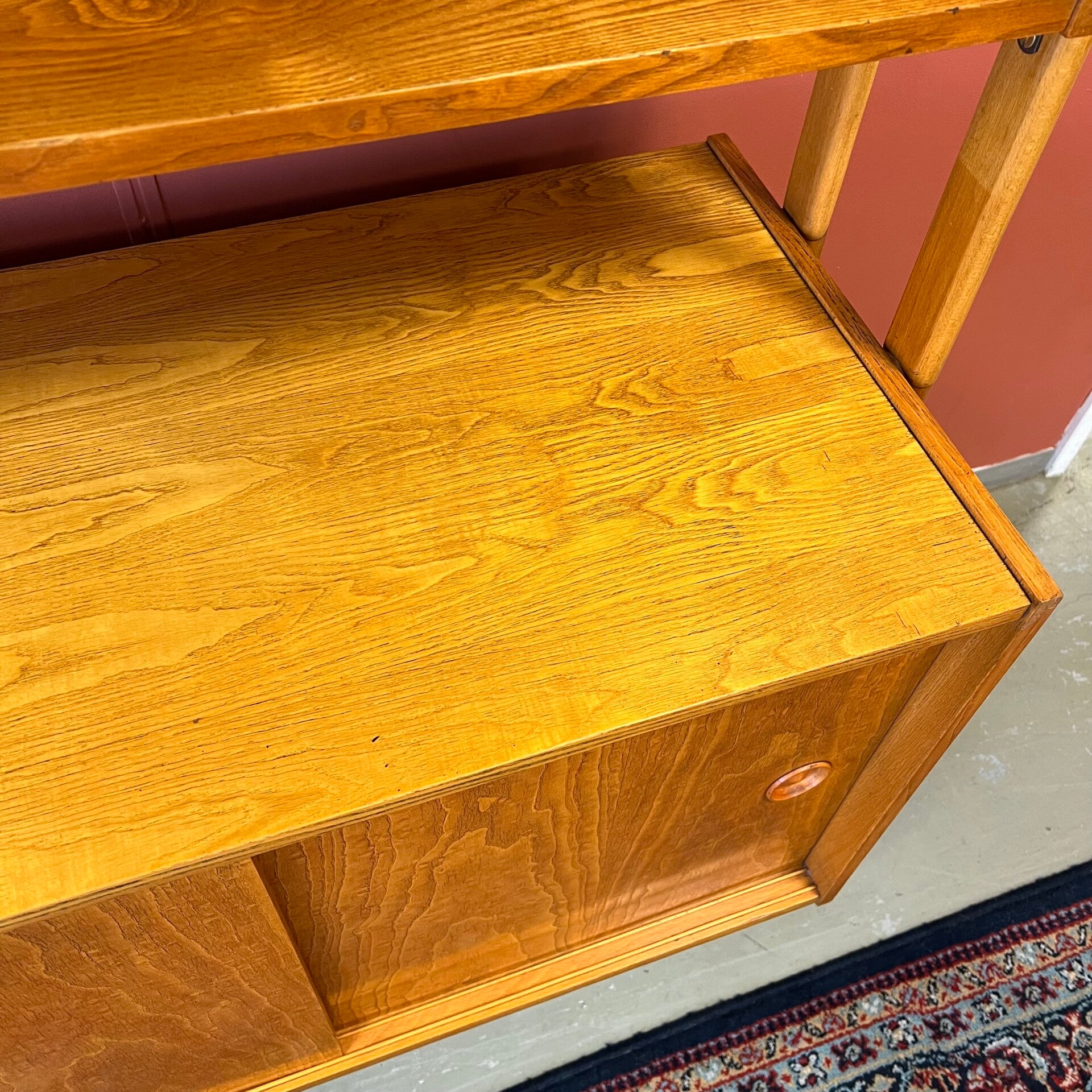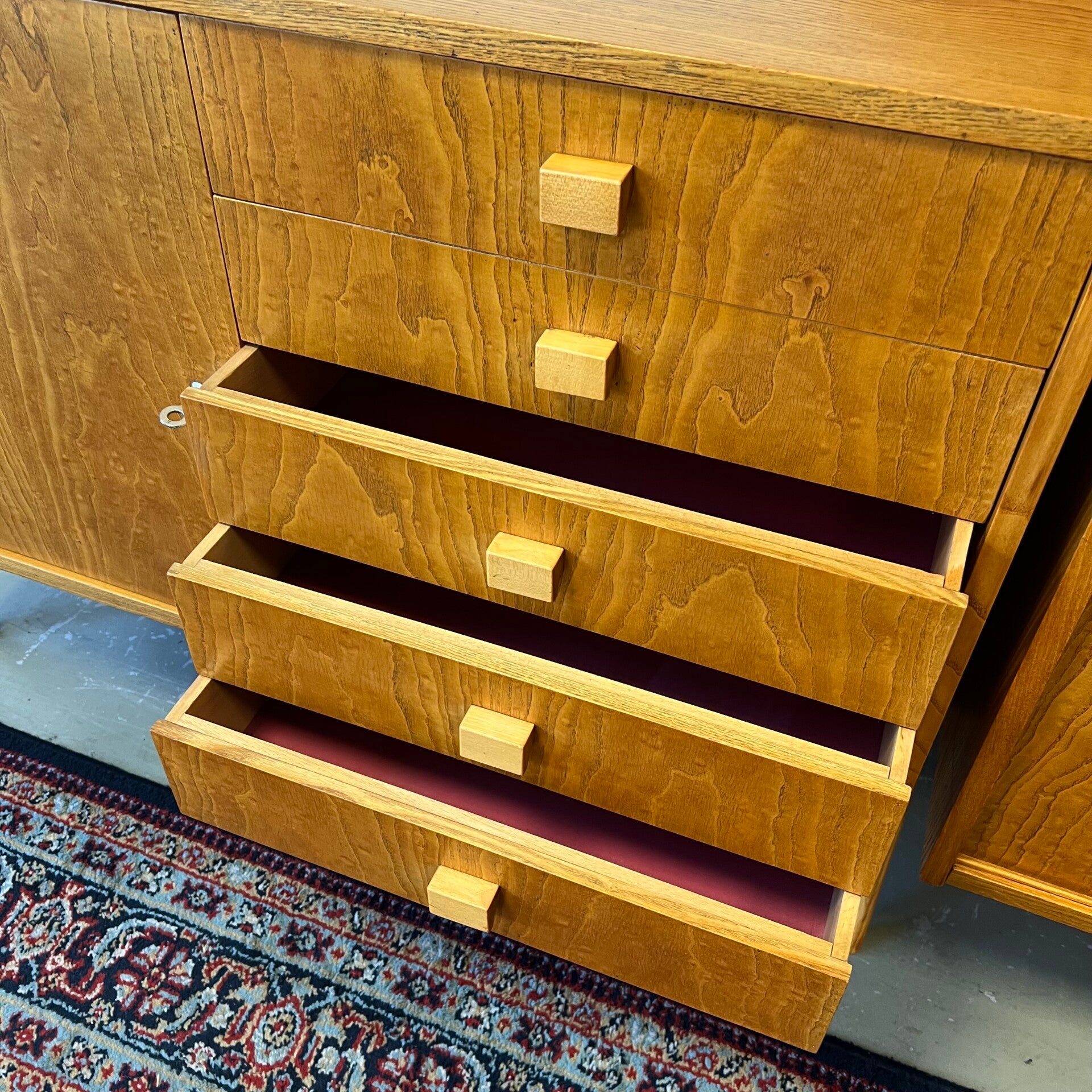 Onderin een gesloten kast met slot (slot werkt moeizaam, magneet toegevoegd voor goede sluiting) uitneembare plank en 5 ruime lades met roodkleurig interieur.