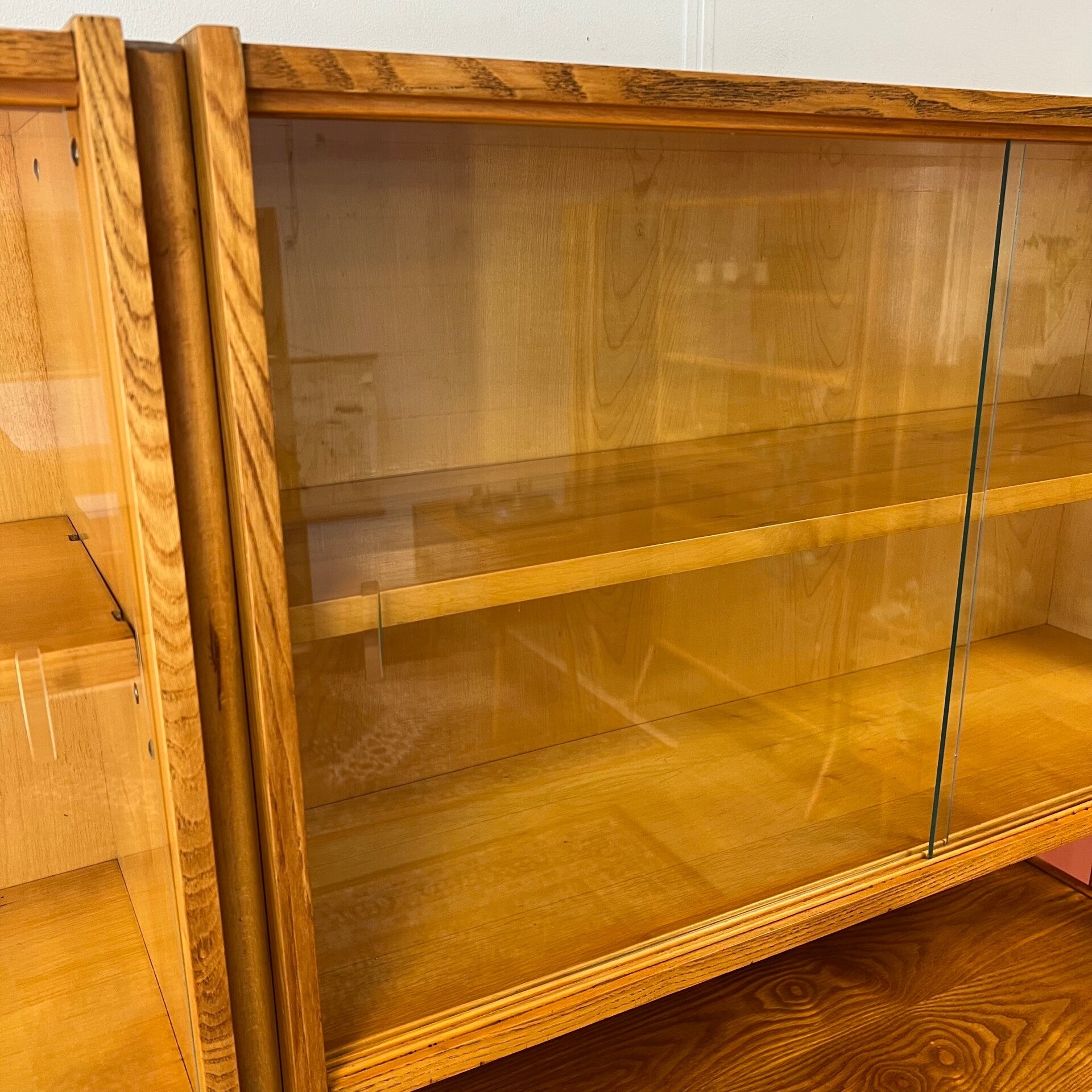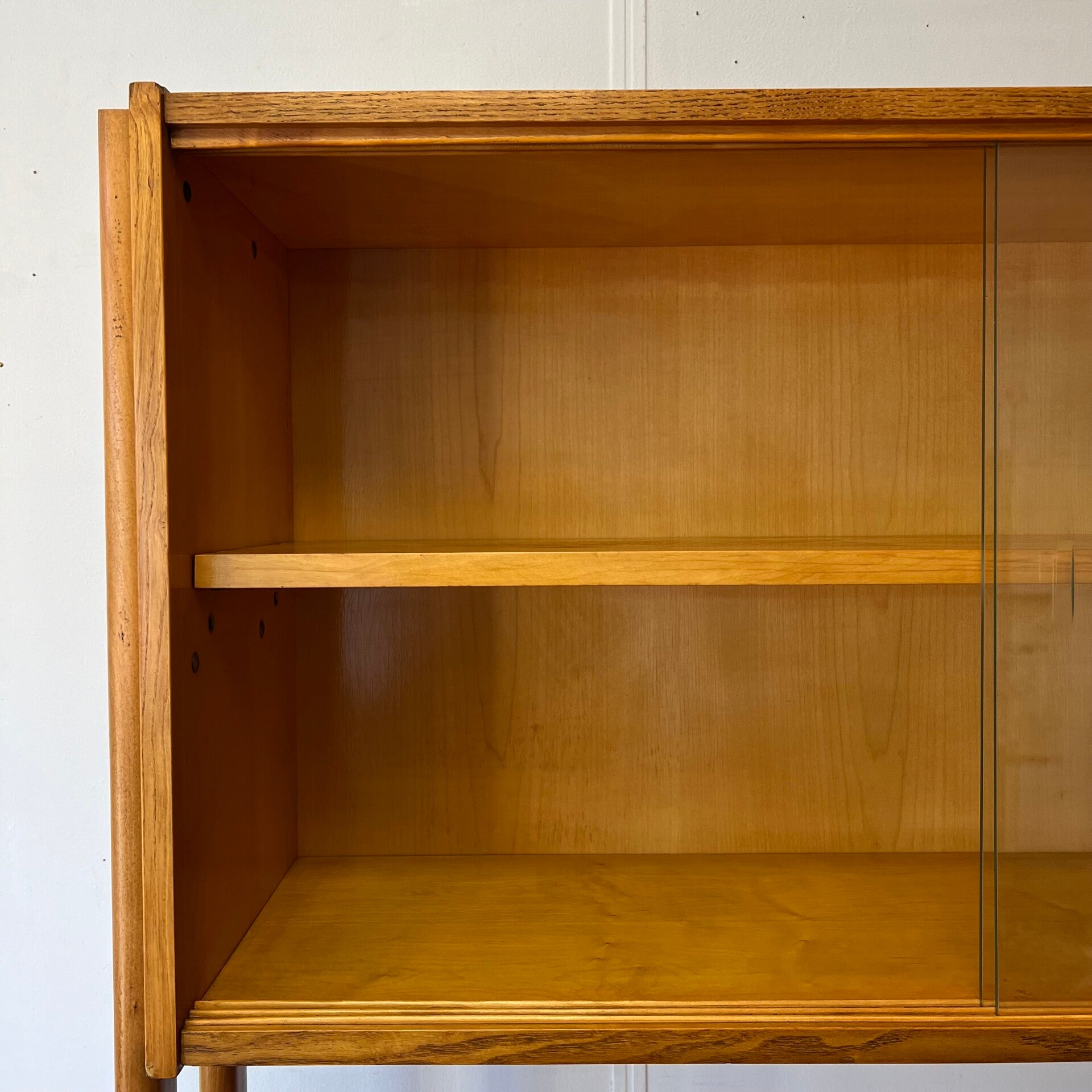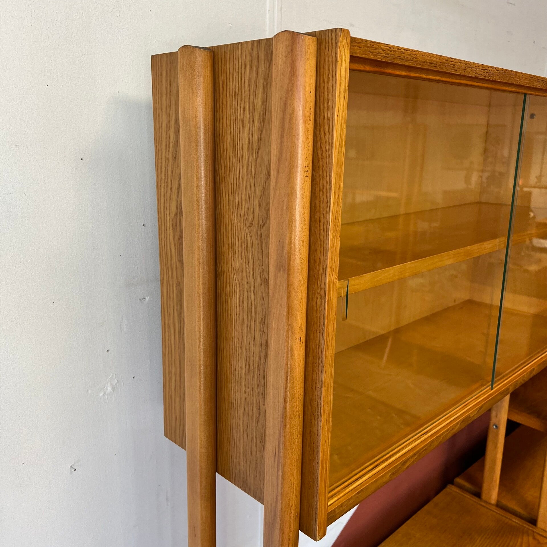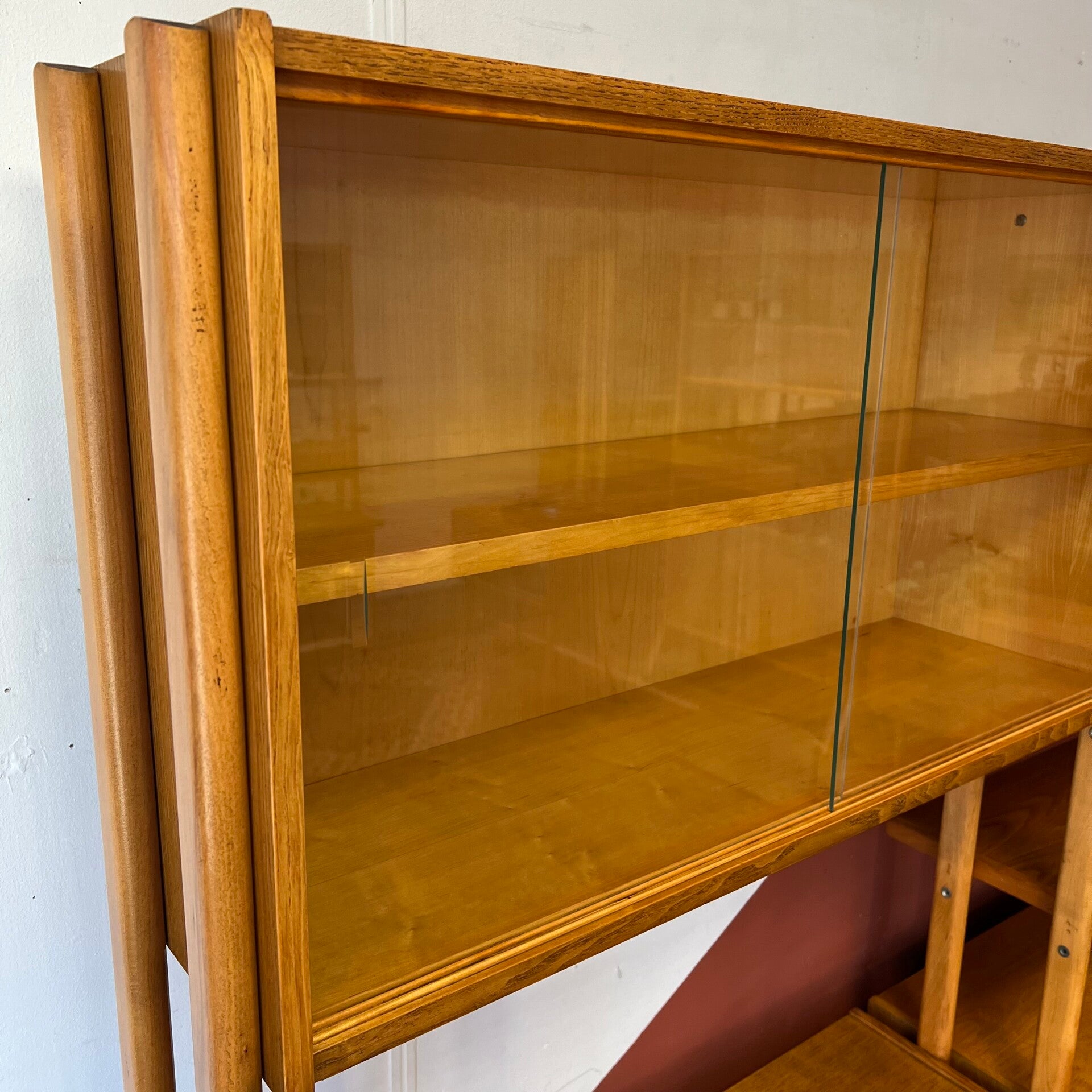 Het deel rechts heeft bovenin een vitrinekast met glazen schuifruitjes en een uitneembare plank.
