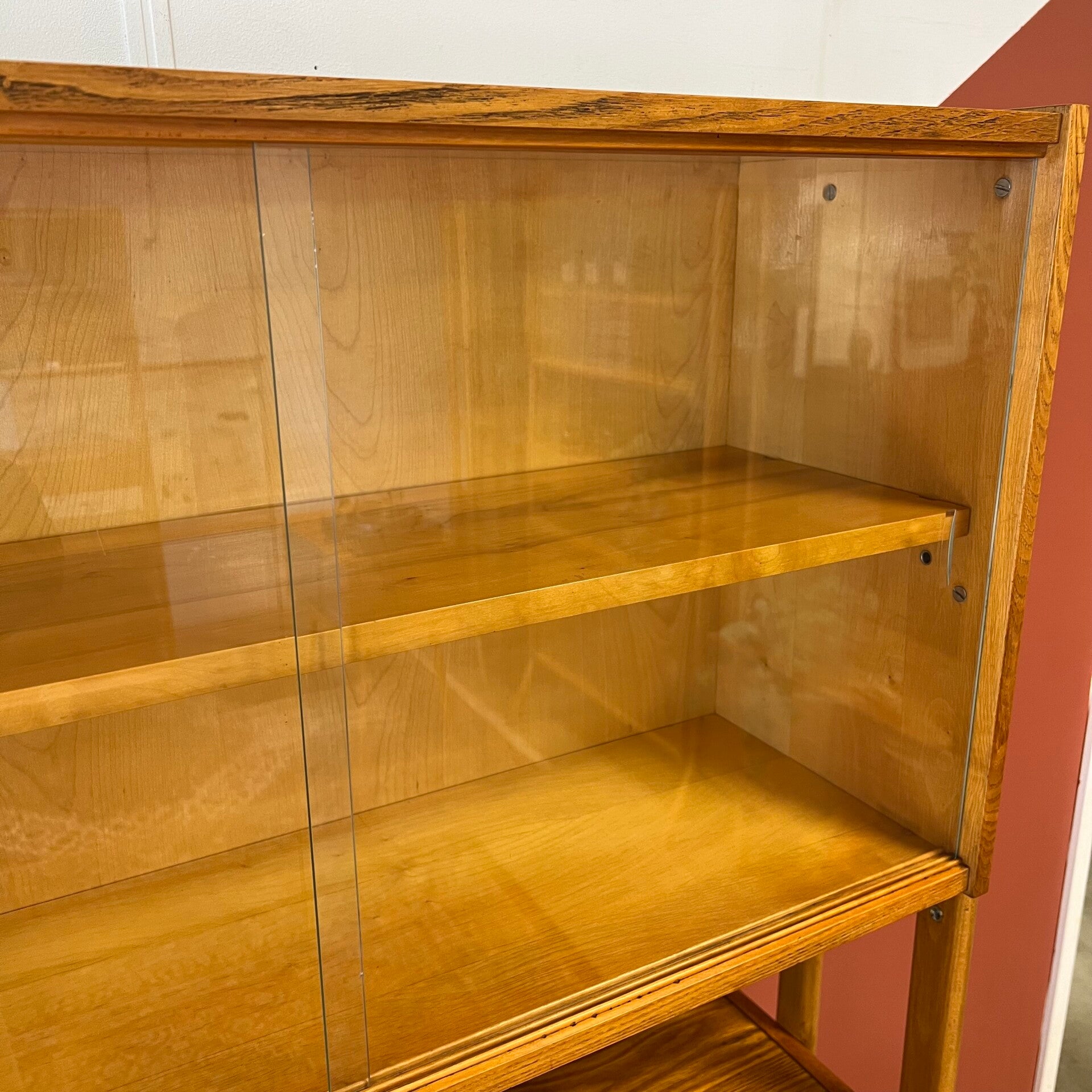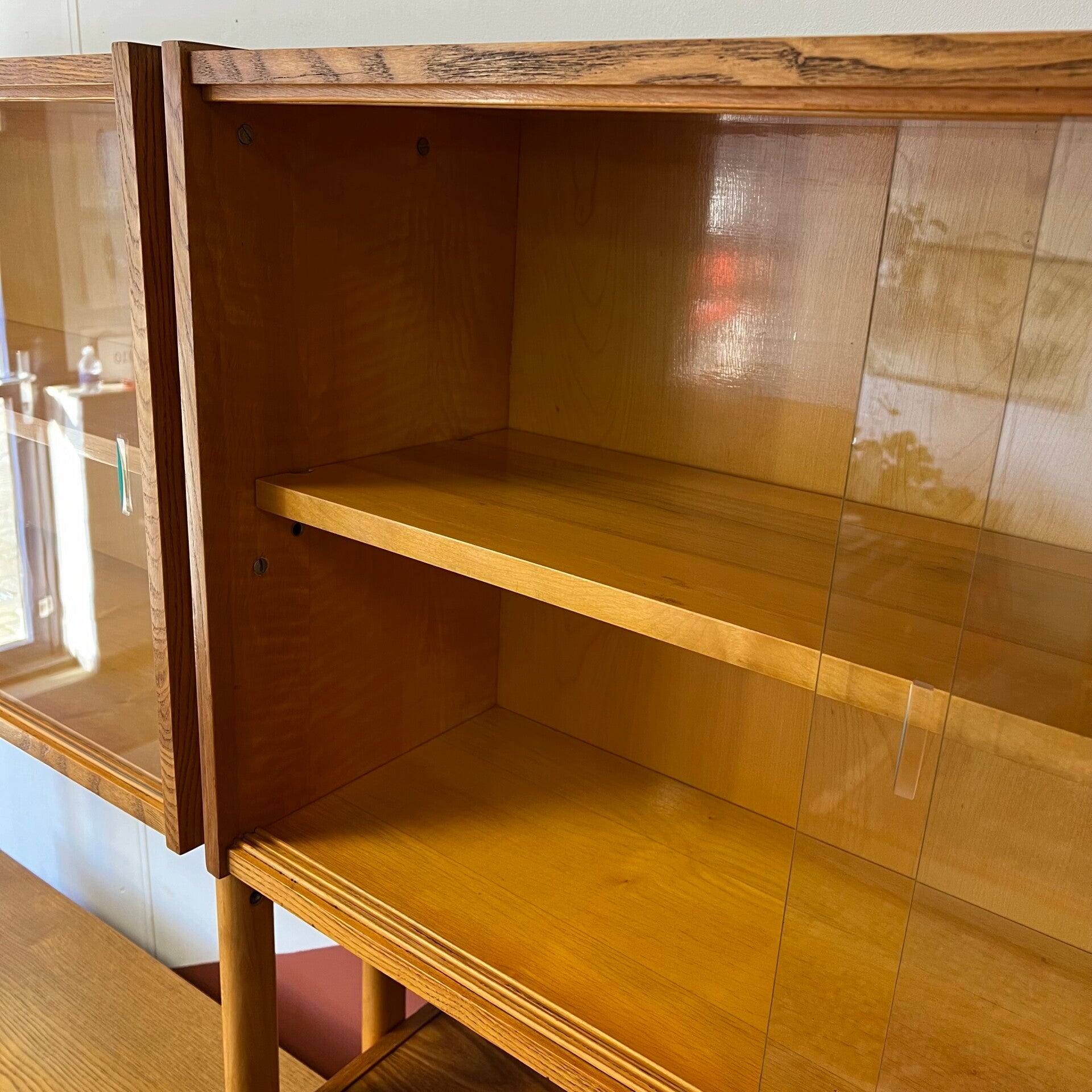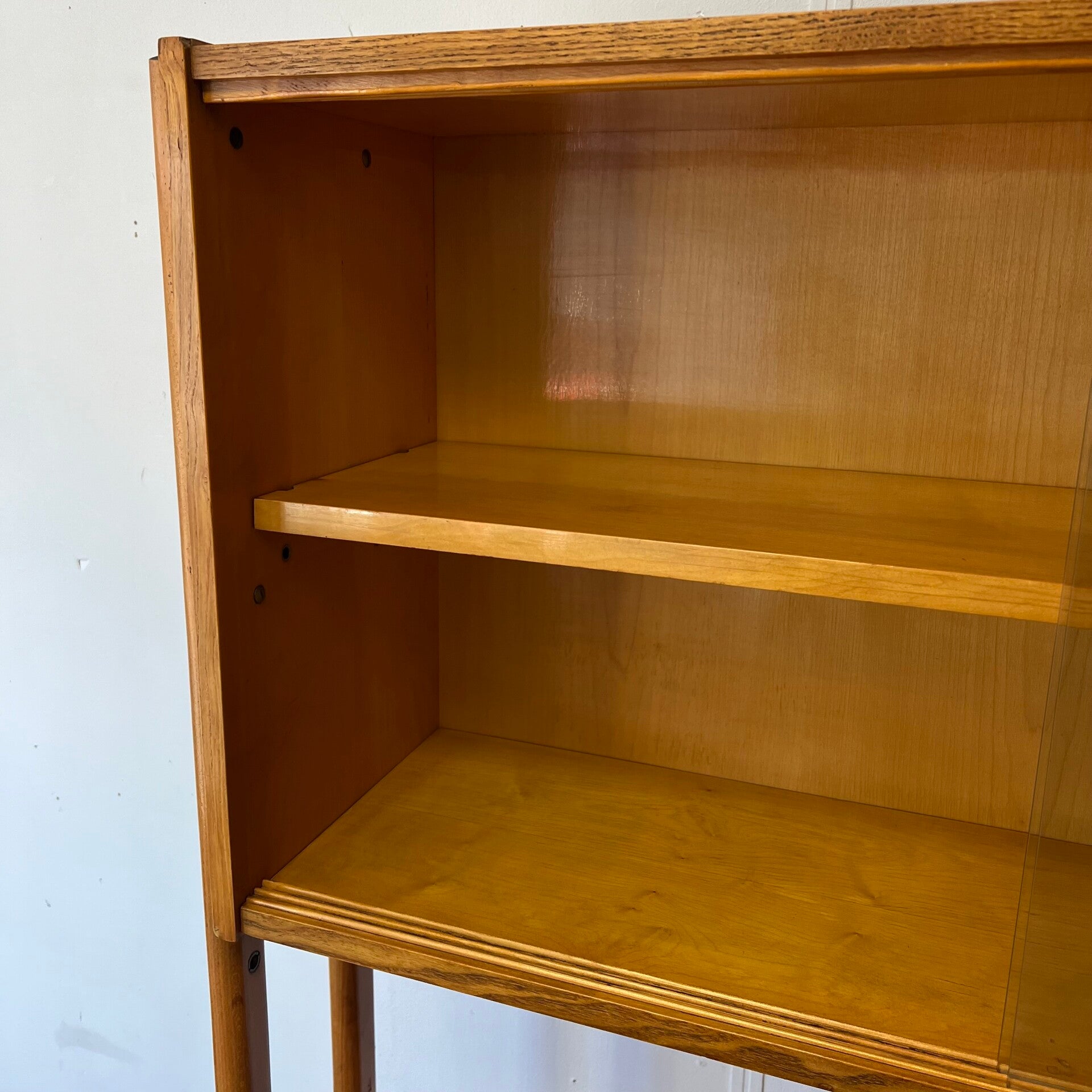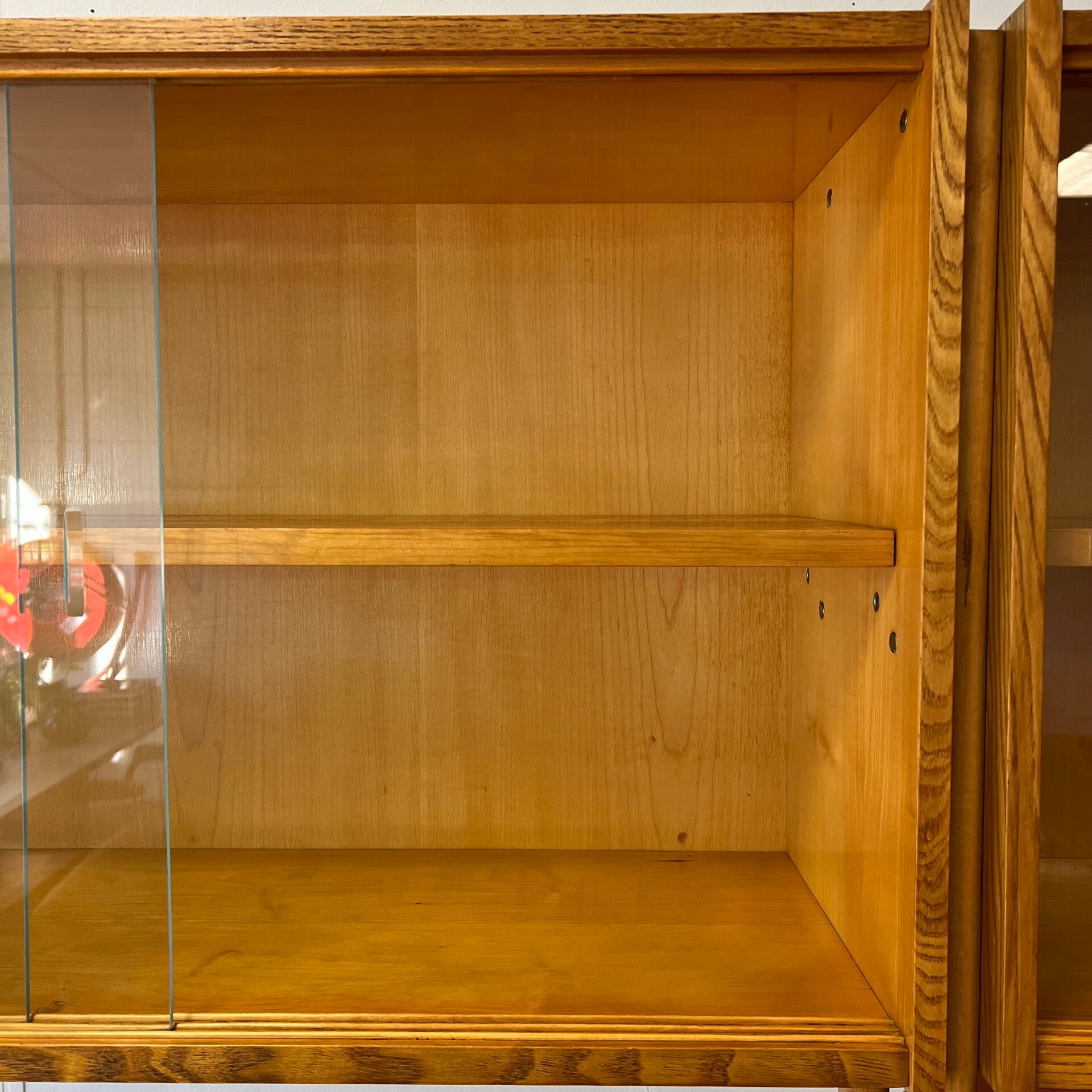 Het deel rechts heeft bovenin een vitrinekast met glazen schuifruitjes en een uitneembare plank.