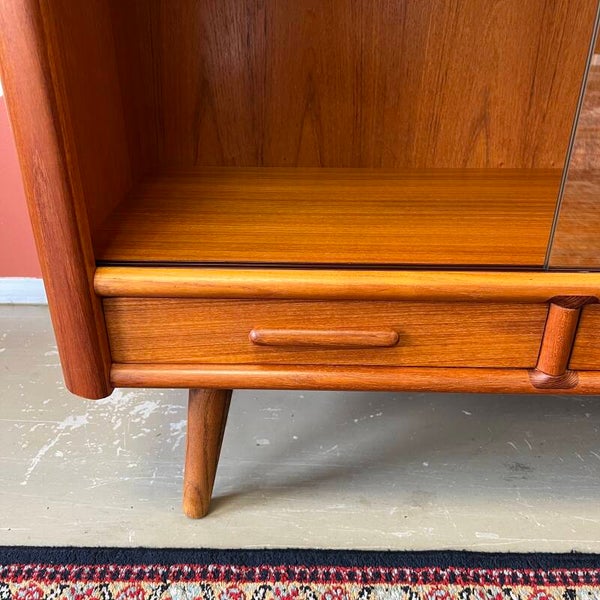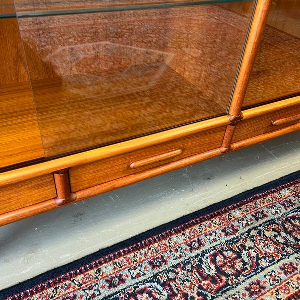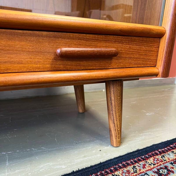 Teakhouten vintage vitrinekast, highboard of buffetkast op schuine poten.