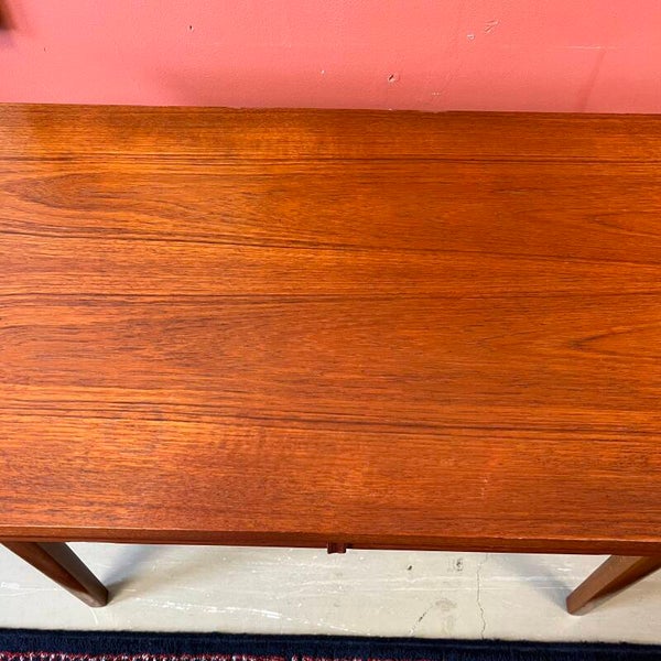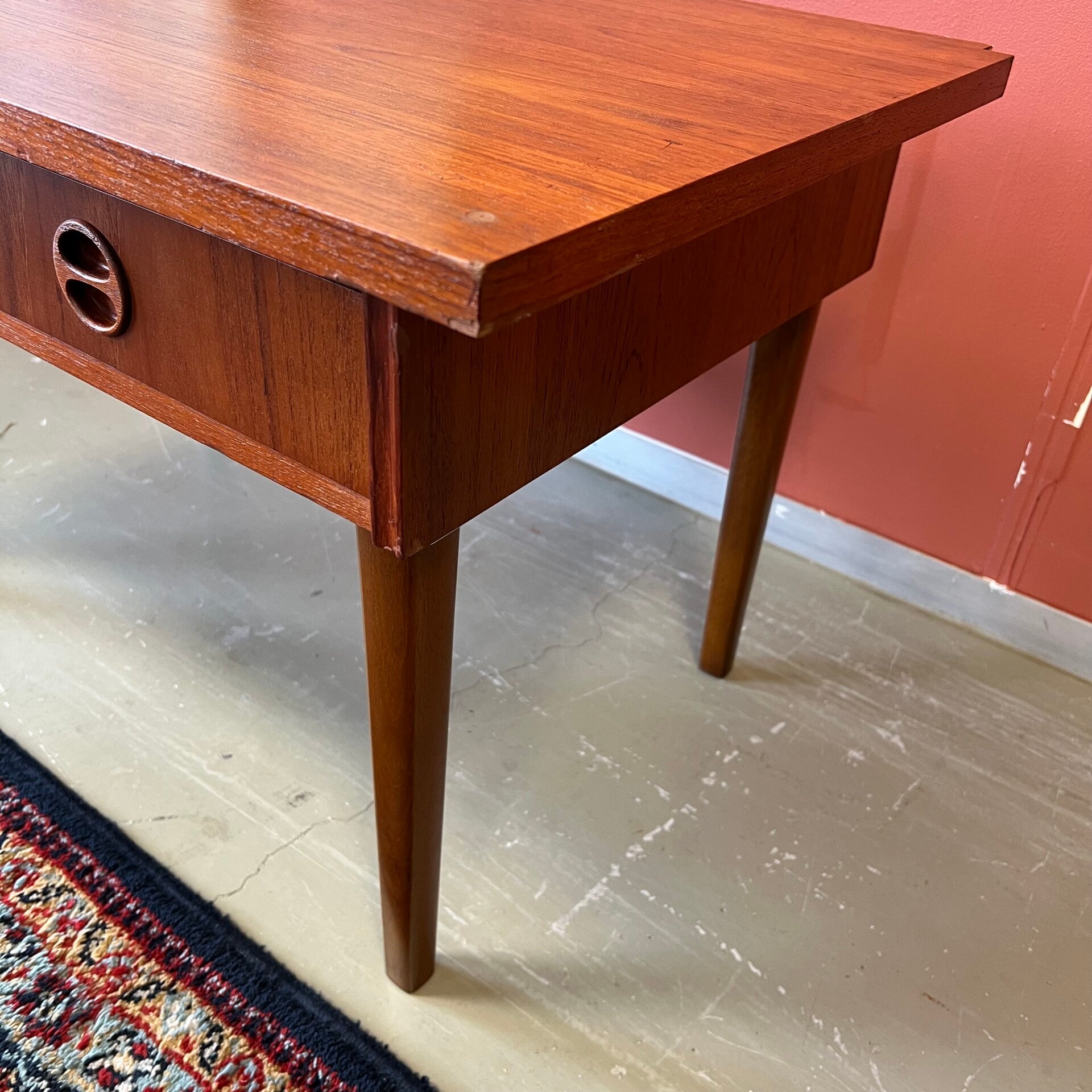 Uitgevoerd in teak (fineer) met mooi gevormde handgrepen.