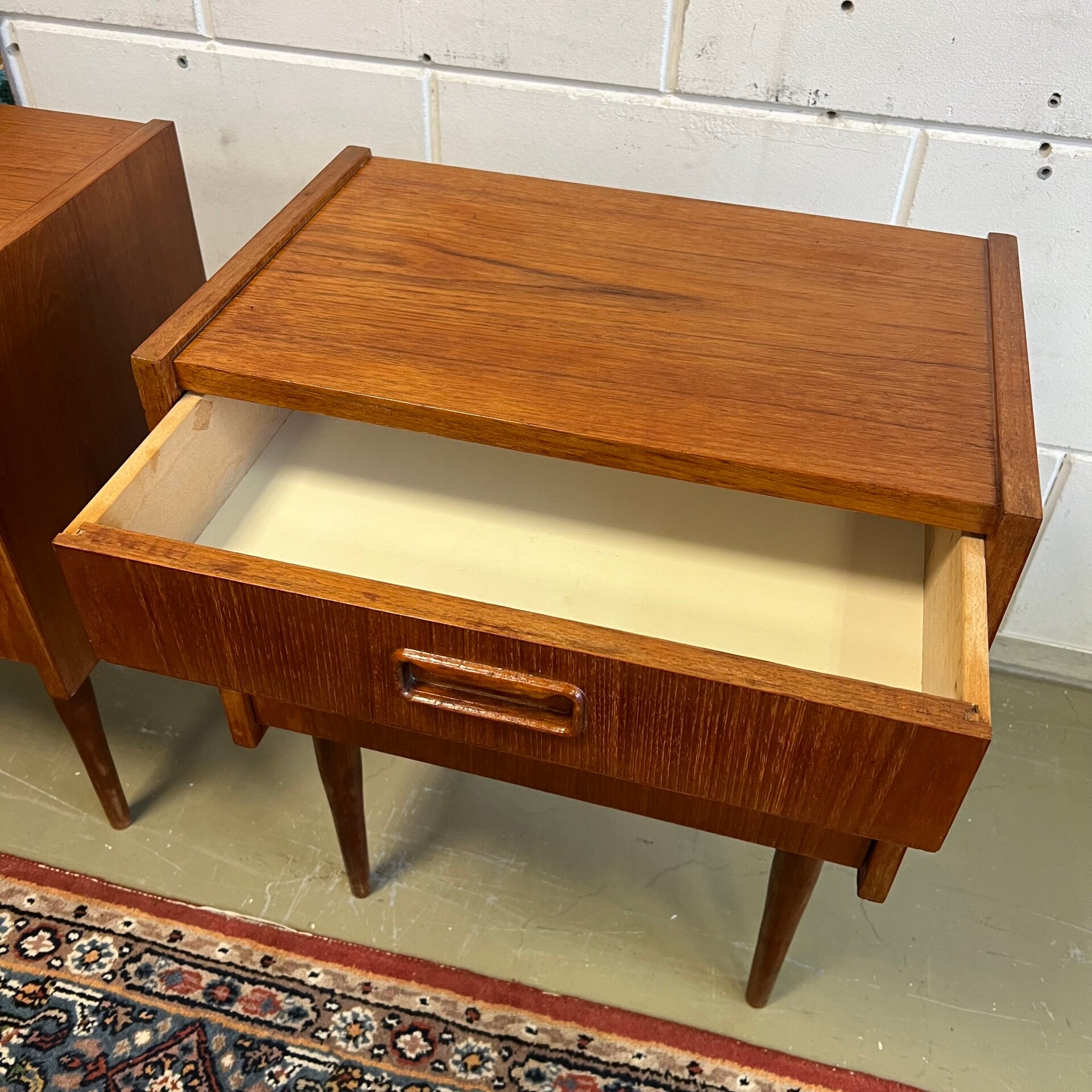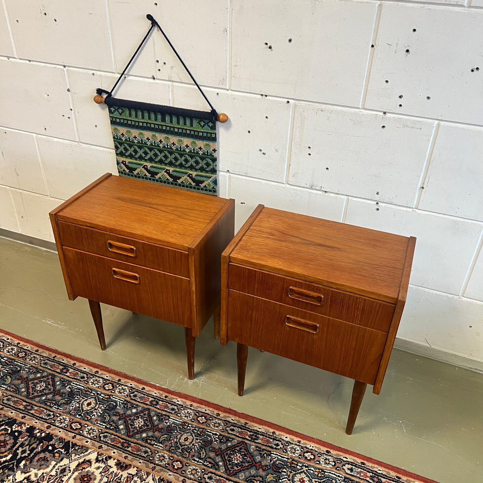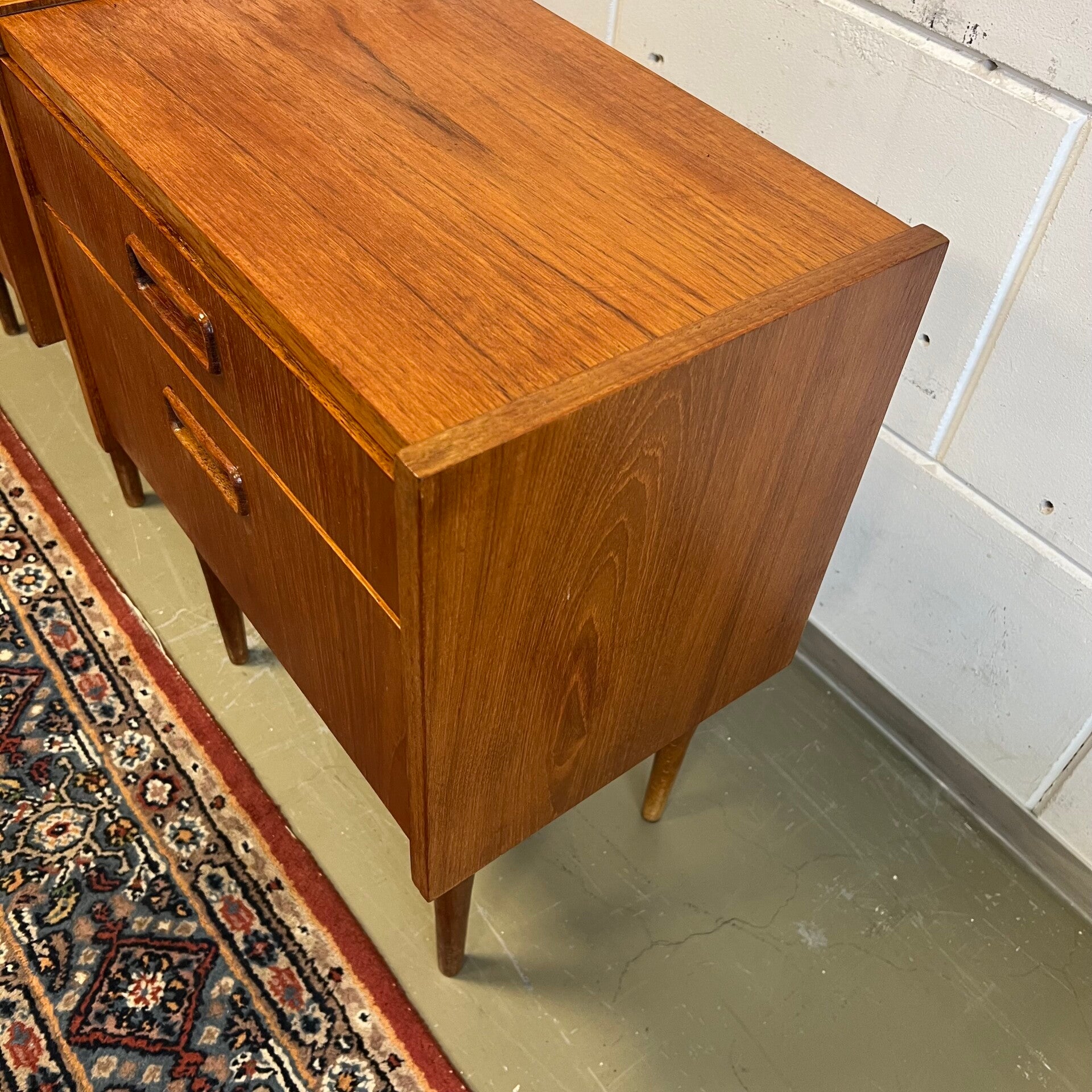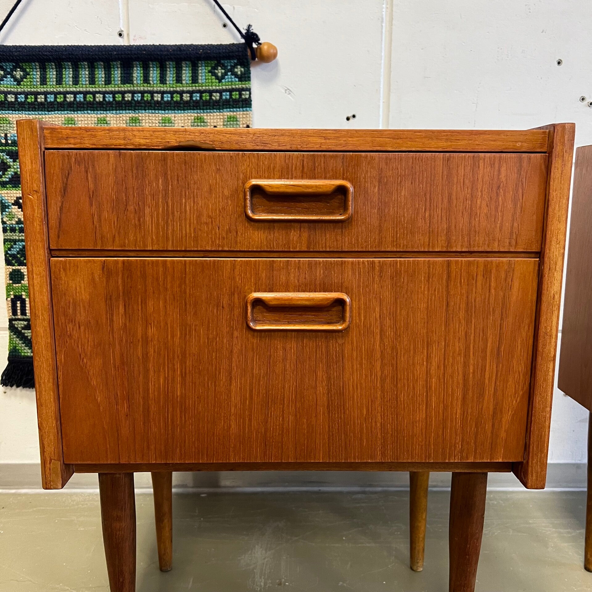 Set van 2 leuke vintage nachtkastjes, op hoge slanke conische poten en mooie ingelegde handgrepen.