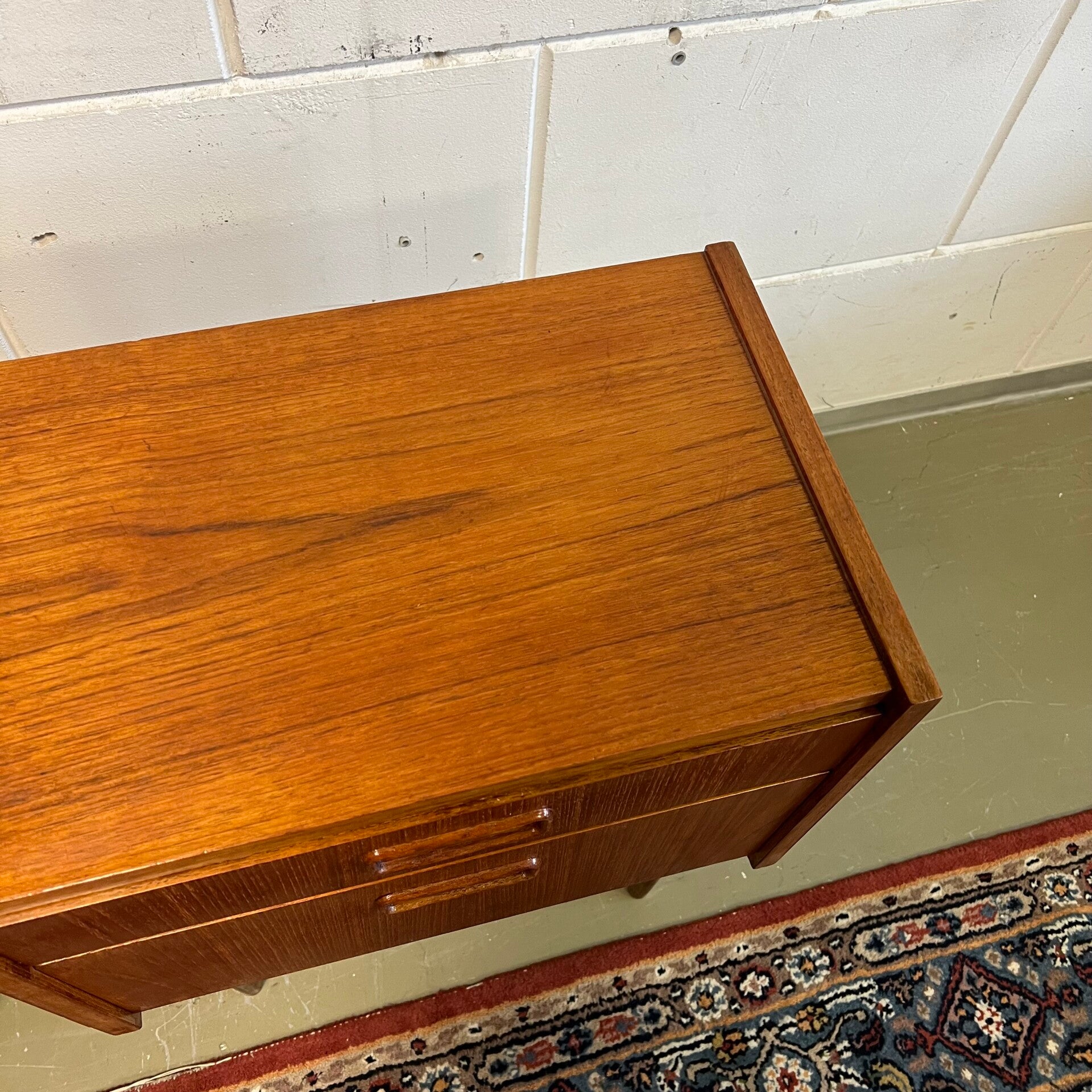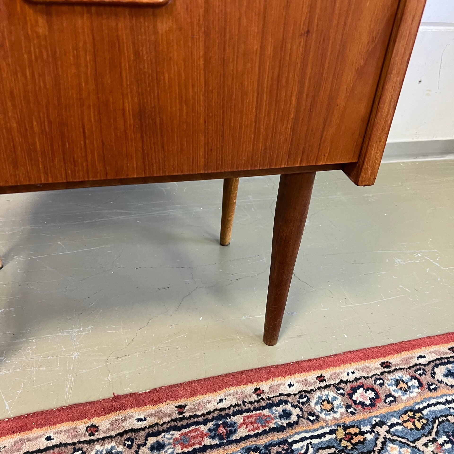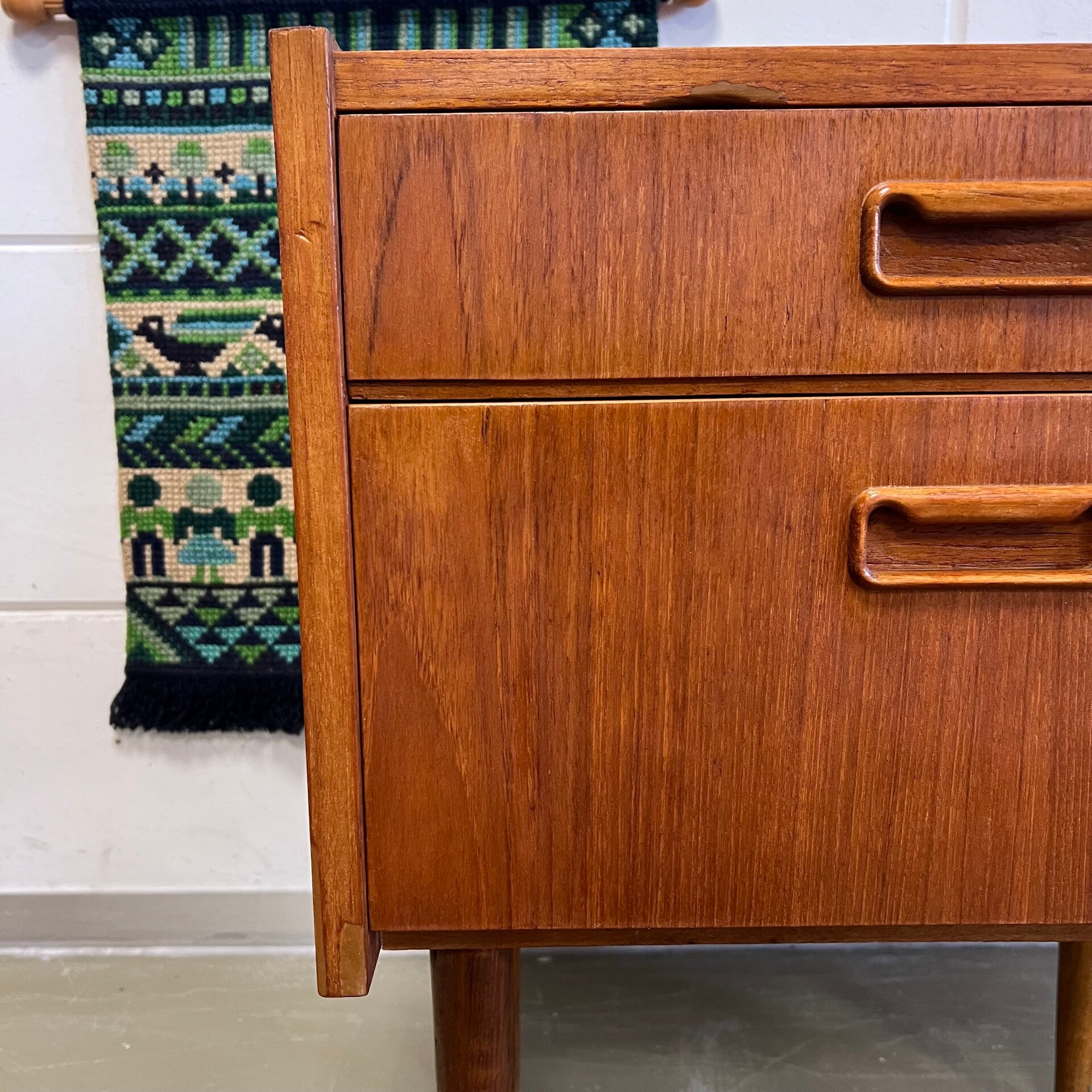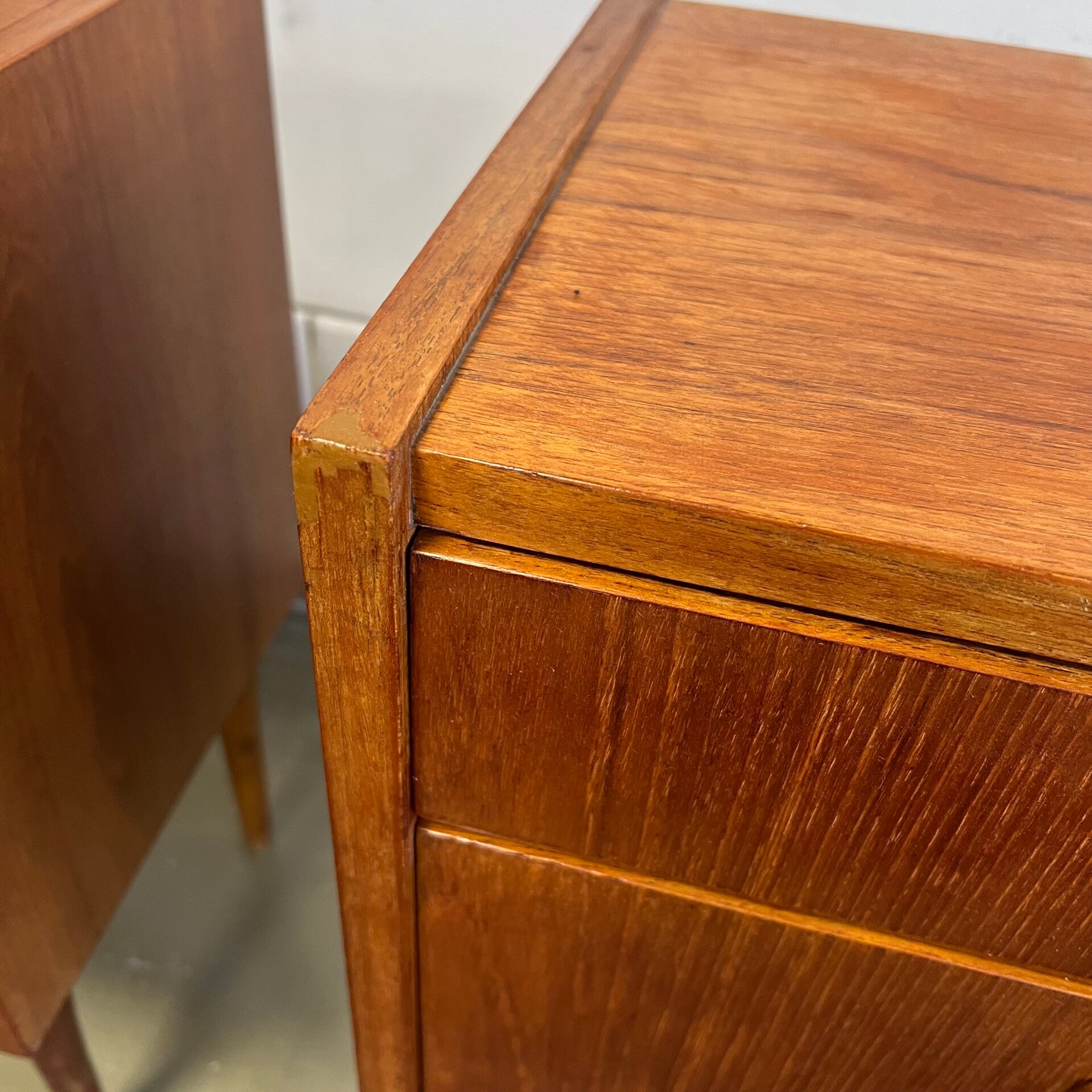 Set van 2 leuke vintage nachtkastjes, op hoge slanke conische poten en mooie ingelegde handgrepen.