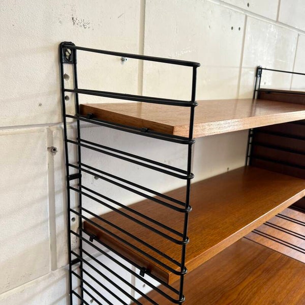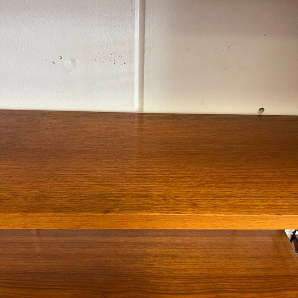 Uitgevoerd in teak (fineer) met zwarte rekken in geplastificeerd draadmetaal.