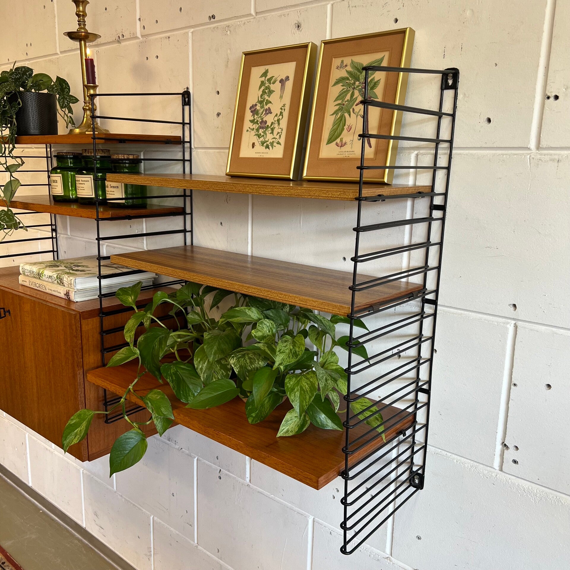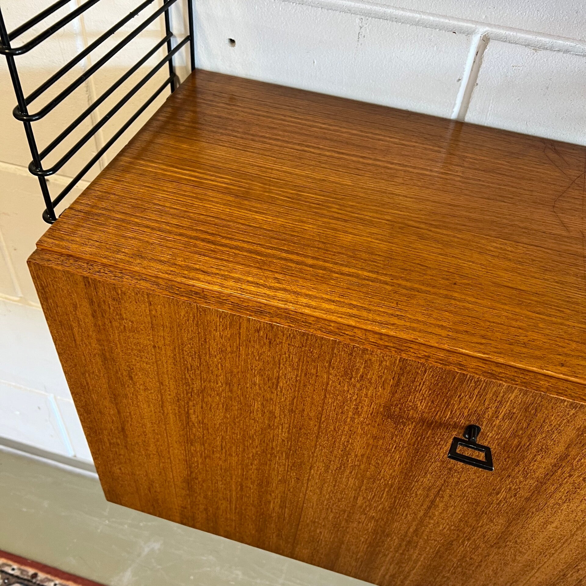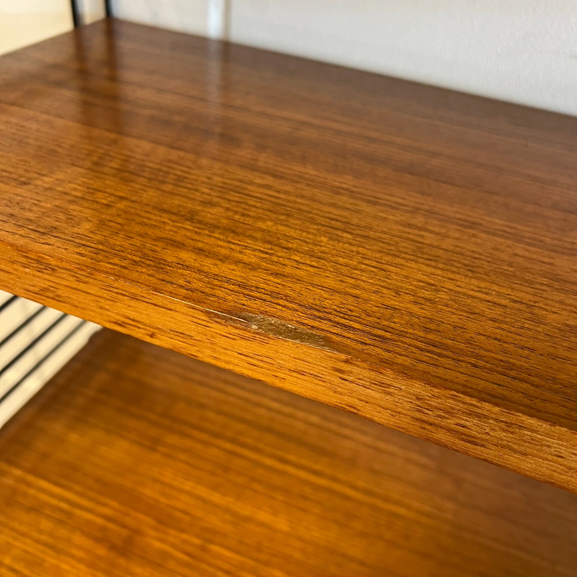 Uitgevoerd in teak (fineer) met zwarte rekken in geplastificeerd draadmetaal.